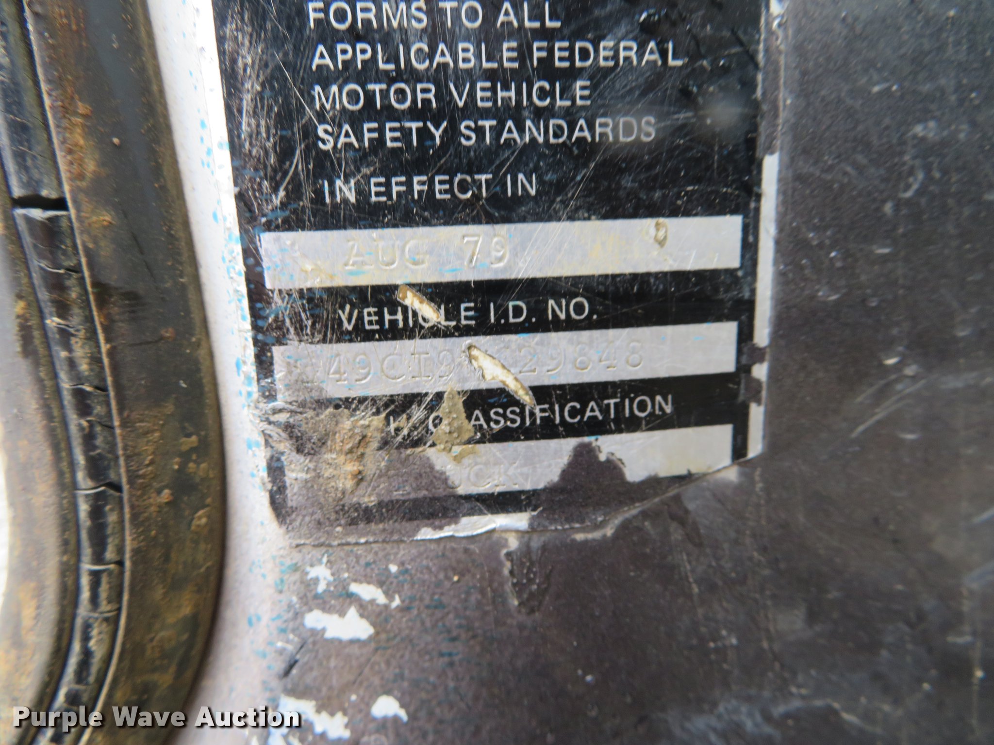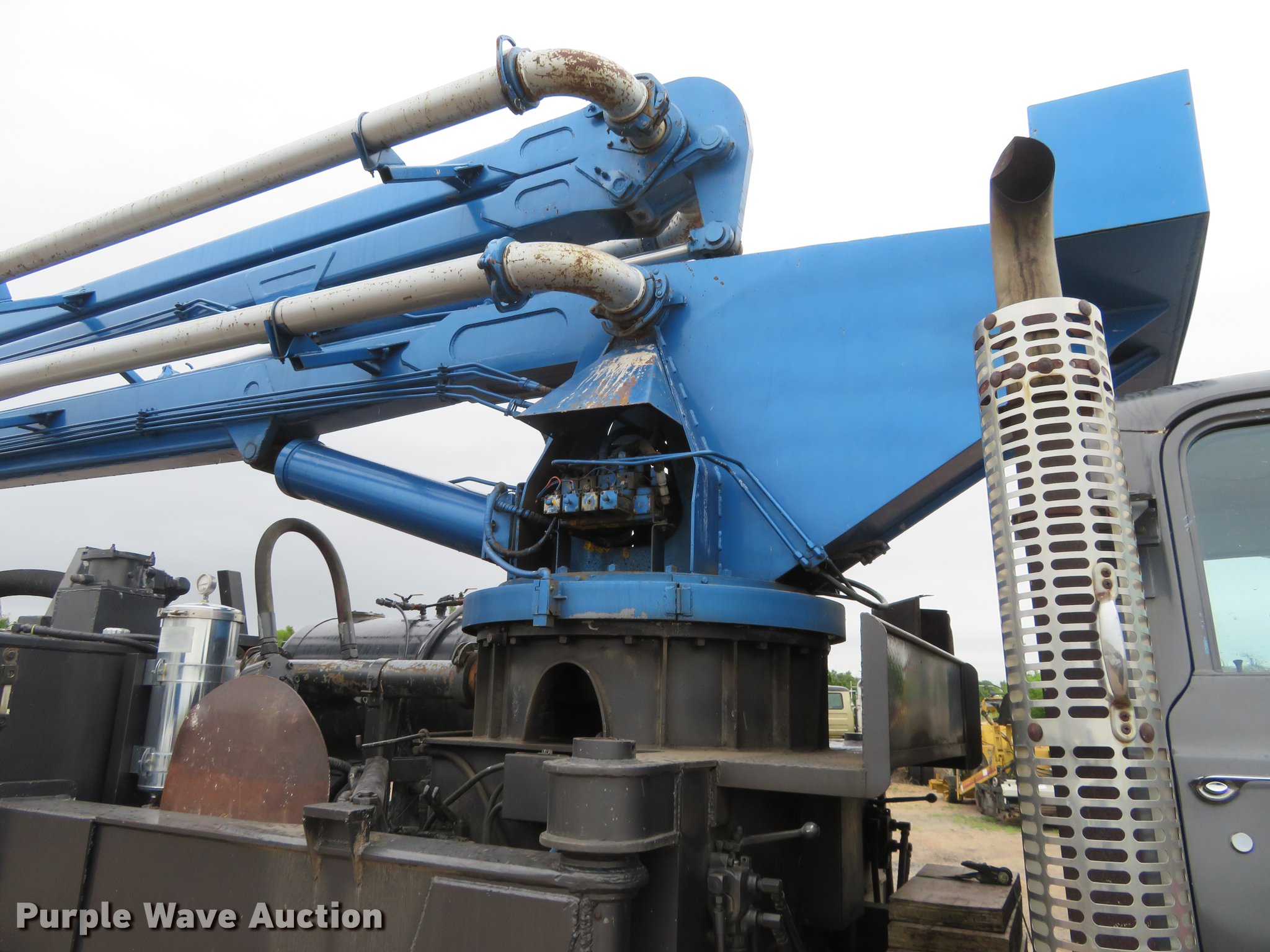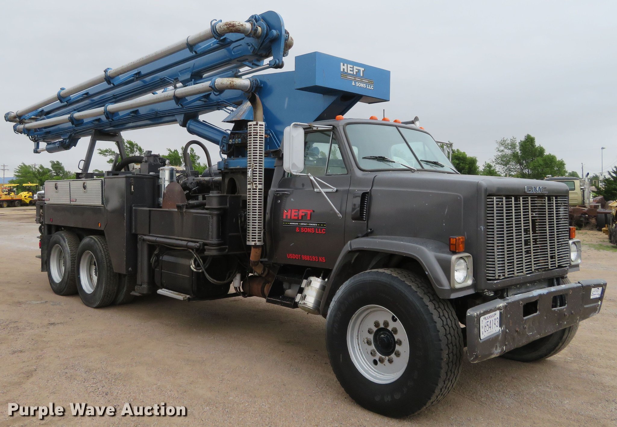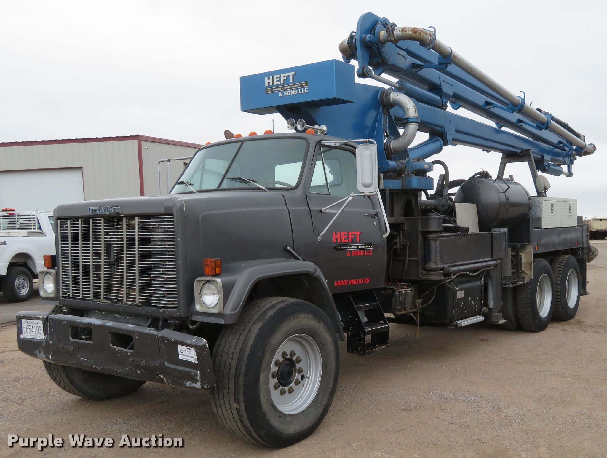 Purple Wave is selling a used Ready Mix or Pump Truck in Kansas. This item is a 1978 GMC Brigadier pump truck with the following: 438,437 miles on odometer, 4,532 hours on meter, Detroit Diesel 671 six cylinder diesel engine, 10 speed deep reduction manual transmission, Tandem axle, PTO, Titan Challenge 3900 concrete pump, 120 gallon water tank, Rear air pump operated water hose, 28 meter boom, 360 degree swing, Hydraulic operation, Three stage folding boom, Wired control, Approximately 50' cord, Wireless control, 6" end hose, Serial 3391, (4) hydraulic outriggers, Pads included, Putzmeister rear vibratory hopper, Dual fuel tanks, Walking beam suspension, Air brakes, 425/65R22.5 front tires, 11R22.5 rear tires, GVWR 52,000 lbs, FAWR 18,000 lbs, IAWR 17,000 lbs, RAWR 17,000 lbs, Windshield cracked