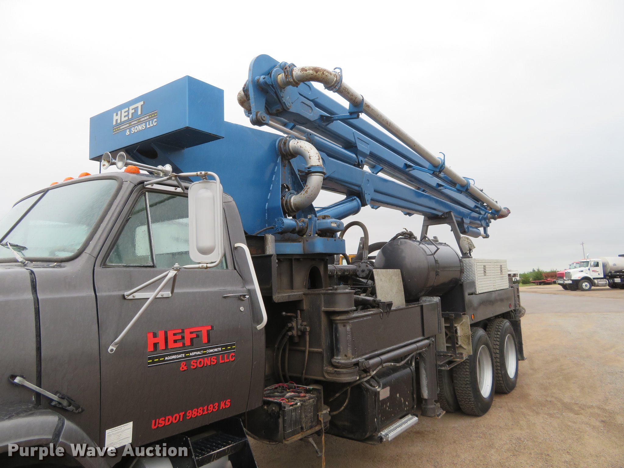 1978 GMC Brigadier pump truck. 438,437 miles on odometer, 4,532 hours on meter, Detroit Diesel 671 six cylinder diesel engine, 10 speed deep reduction manual transmission, Tandem axle, PTO, Titan Challenge 3900 concrete pump 120 gallon water tank, Rear air pump operated water hose, 28 meter boom 360 degree swing, Hydraulic operation, Three stage folding boom, Wired control Approximately 50' cord, Wireless control, 6" end hose, Serial 3391, (4) hydraulic outriggers Pads included, Putzmeister rear vibratory hopper, Dual fuel tanks, Walking beam suspension, Air brakes, 425/65R22.5 front tires, 11R22.5 rear tires, GVWR 52,000 lbs, FAWR 18,000 lbs, IAWR 17,000 lbs, RAWR 17,000 lbs, Windshield cracked. Kansas title. T49C19V629848. Heft & Sons LLC. 14081 I St. Greensburg, KS 67054