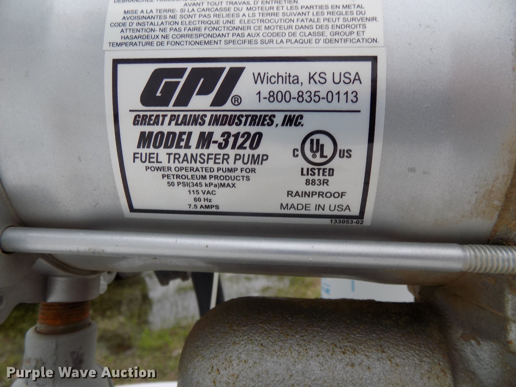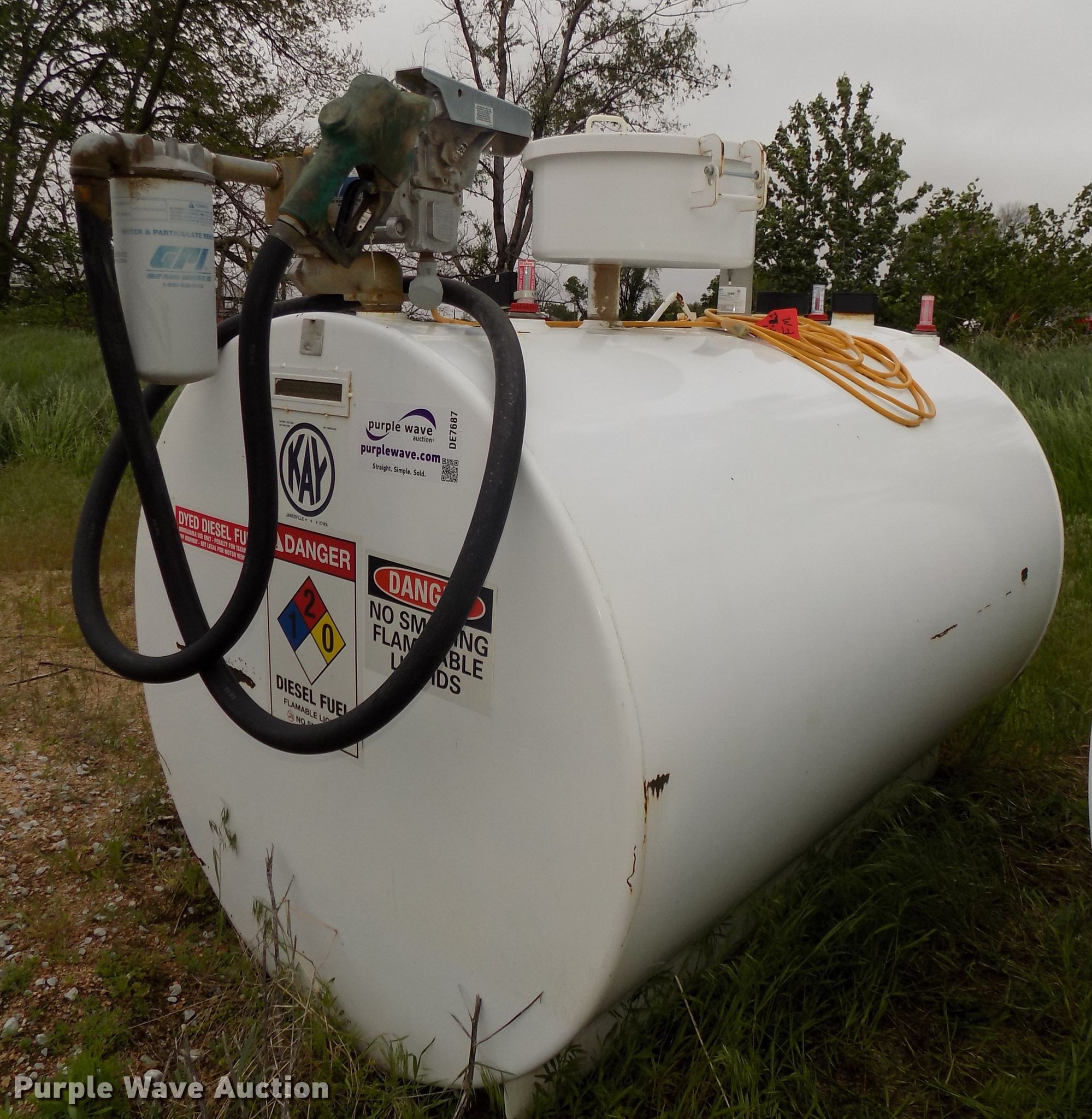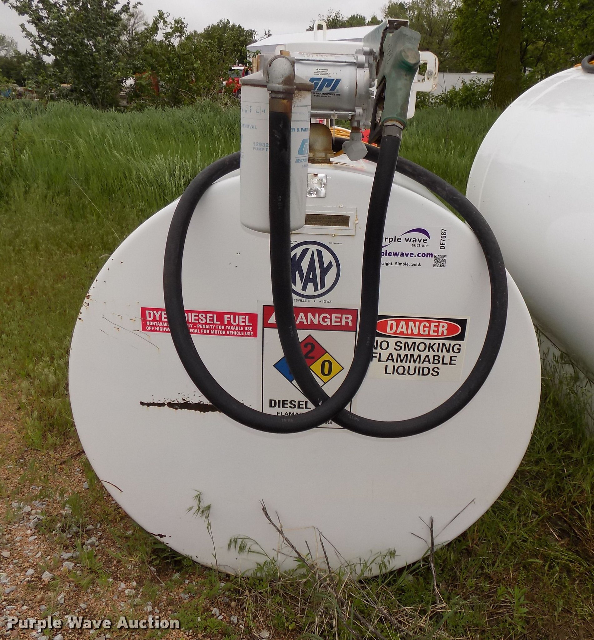 Purple Wave is selling a used Fuel and Lube in Nebraska. This item is a Kay fuel tank with the following: 74"L x 48" diameter, 530 gallon capacity, GPI 3120 pump, 110V, Hose, Nozzle, 86"L x 64"H overall dimensions, Previously used for diesel