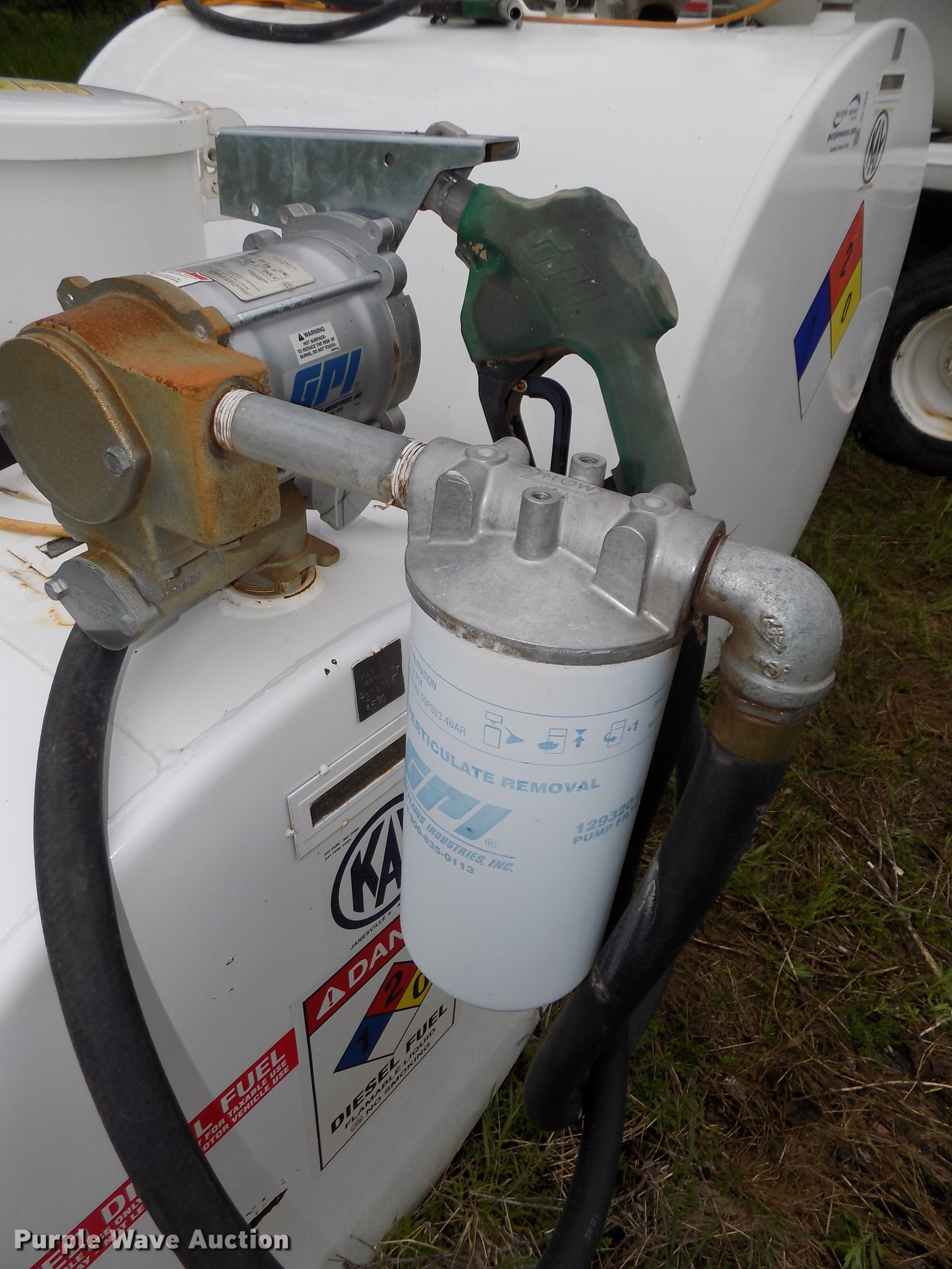 Kay fuel tank. 74"L x 48" diameter, 530 gallon capacity, GPI 3120 pump 110V, Hose, Nozzle, 86"L x 64"H overall dimensions, Previously used for diesel. Lottman Ready Mix. 412 Commercial St. Diller, NE 68342