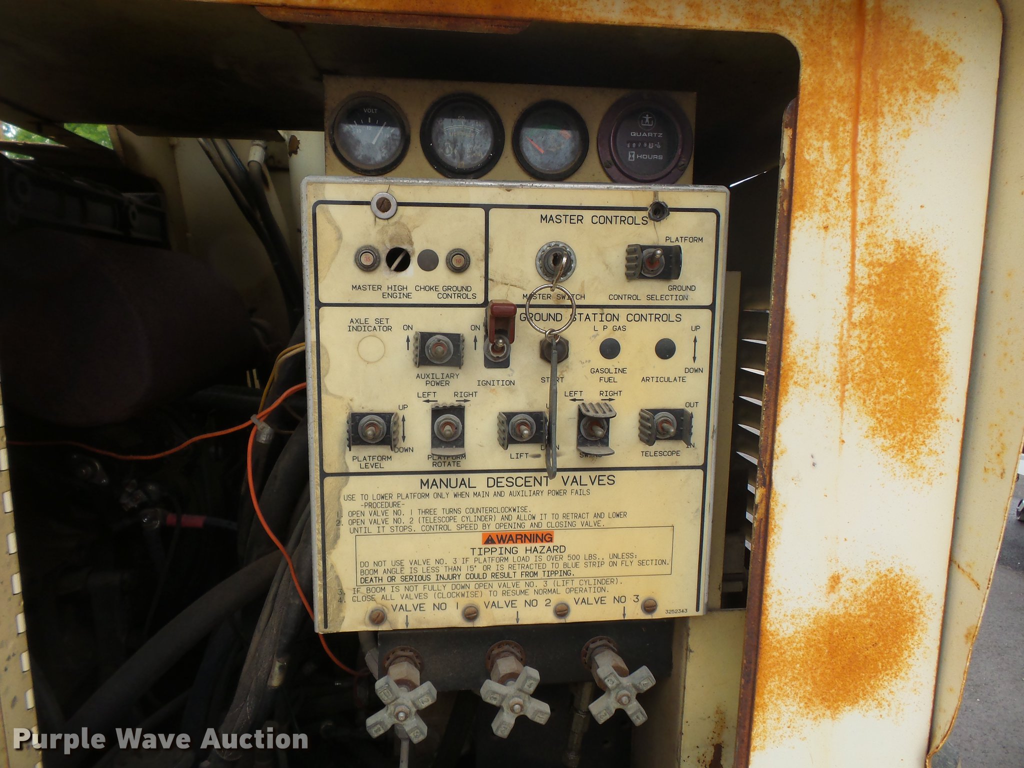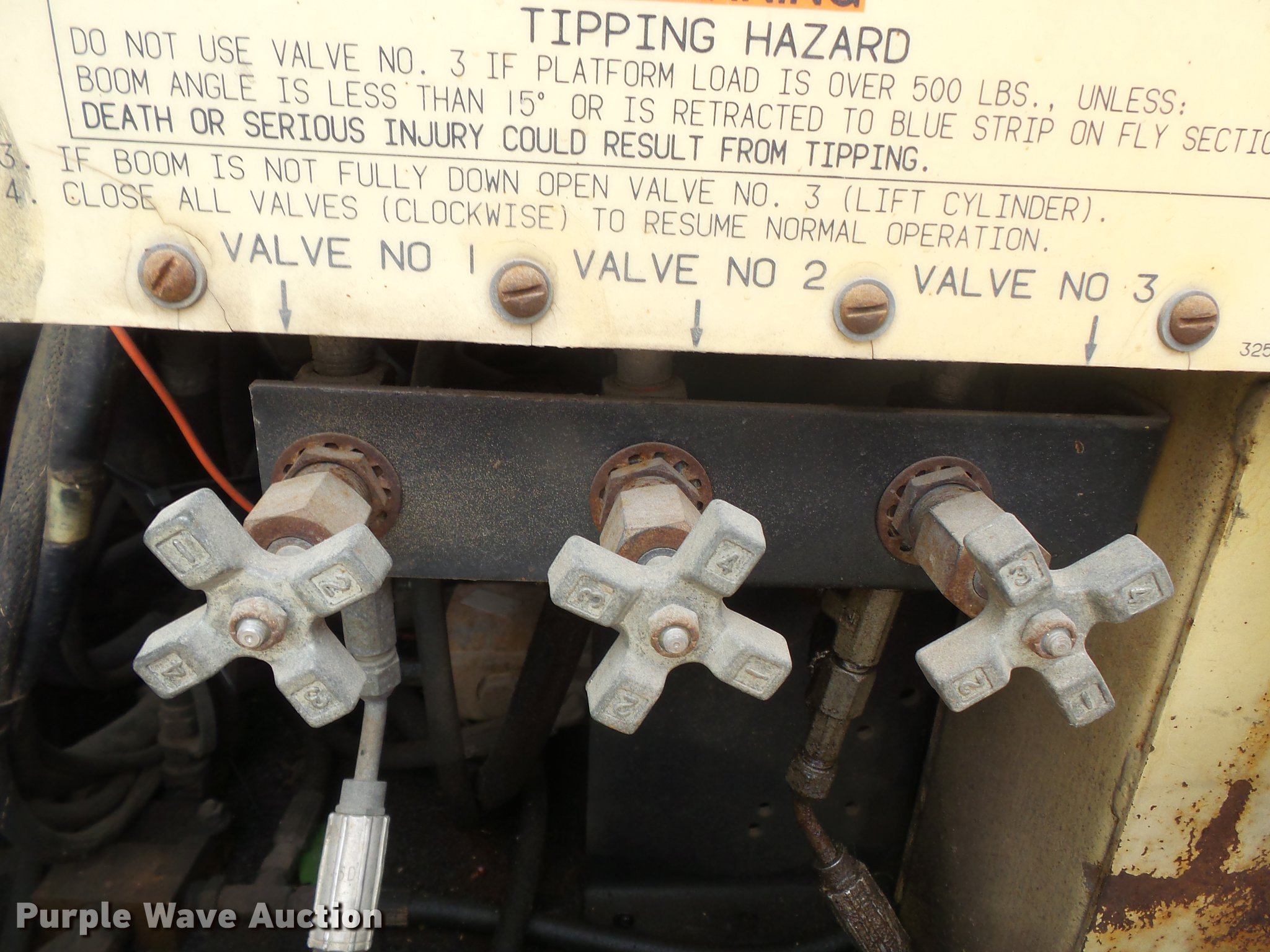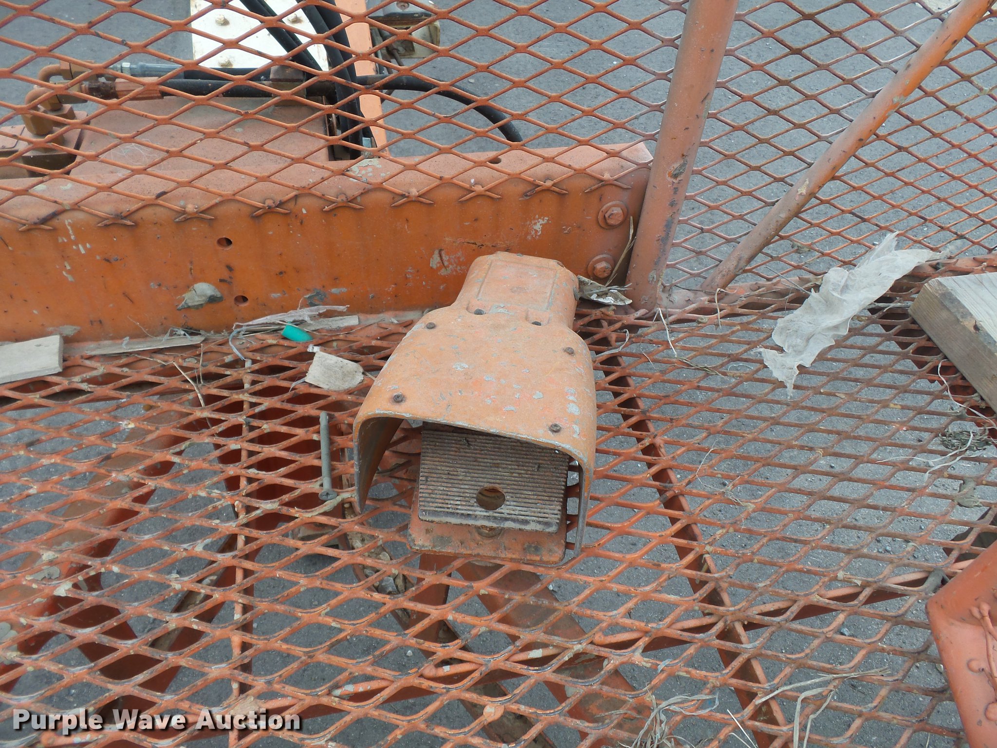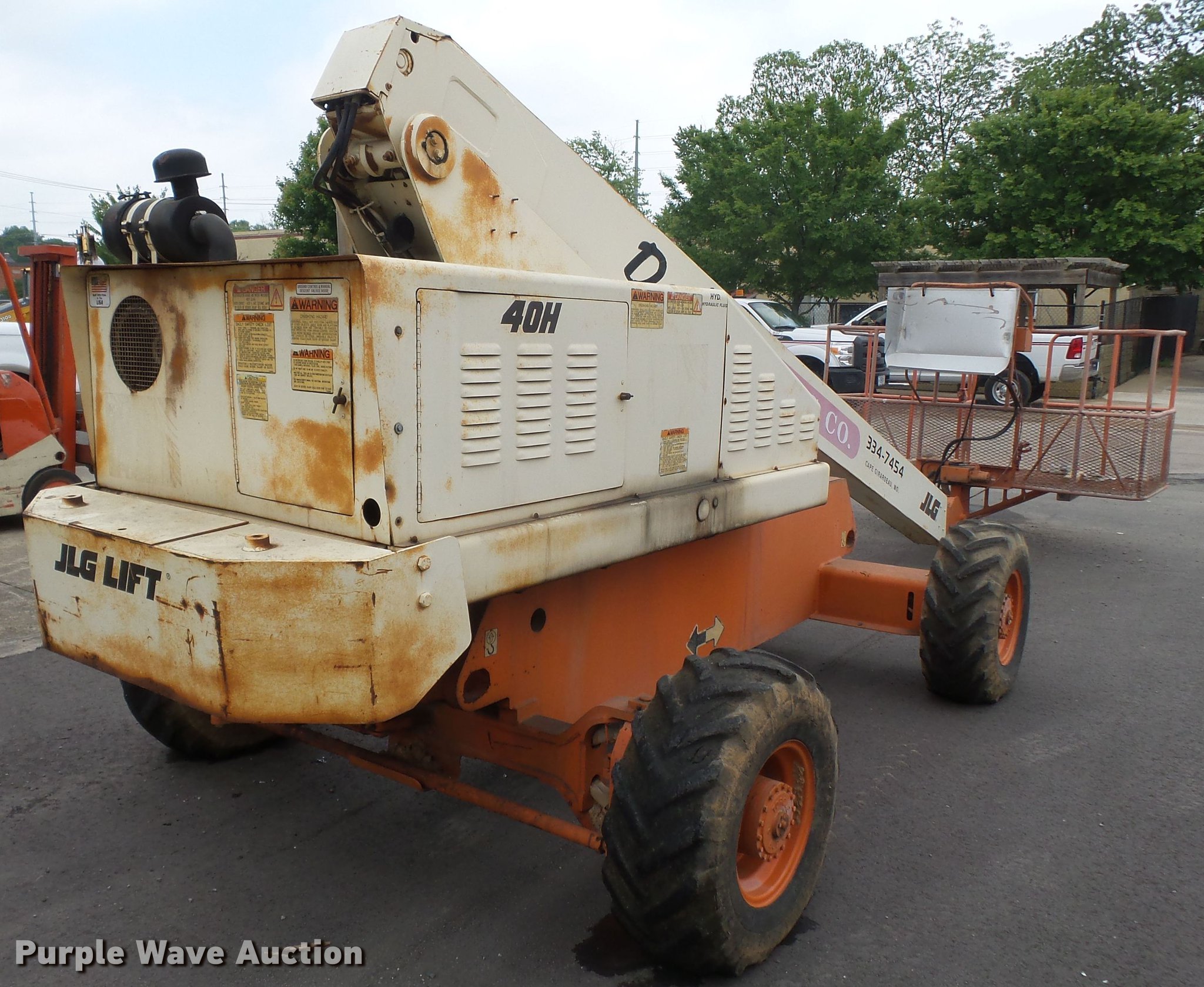 Purple Wave is selling a used Boom Lift in Missouri. This item is a 1995 JLG 40H boom lift with the following: 4,080 hours on meter, Deutz F3L912 three cylinder diesel engine, 47 HP, Four wheel drive, 500 lbs max lift capacity, 33' max reach length, 40' max lift height, 8'L x 36"W platform, AC power outlet, Platform and ground controls, Hydraulic platform rotation, 12.5-15 pneumatic tires, Dead battery, Serial 019321