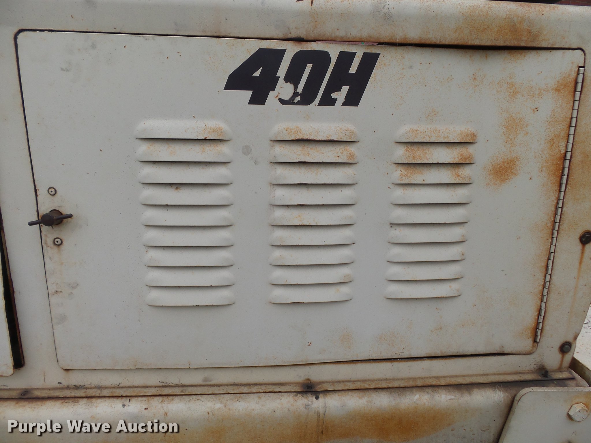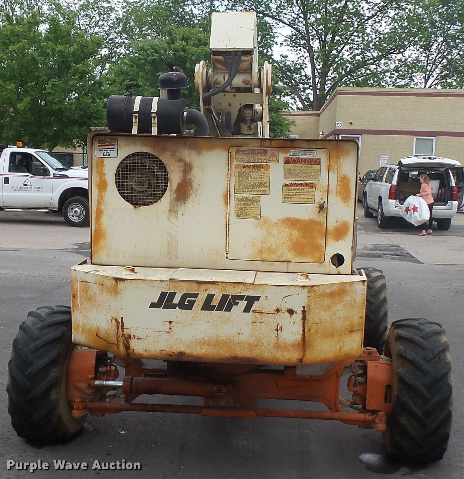 1995 JLG 40H boom lift. 4,080 hours on meter, Deutz F3L912 three cylinder diesel engine 47 HP, Four wheel drive, 500 lbs max lift capacity, 33' max reach length, 40' max lift height, 8'L x 36"W platform AC power outlet, Platform and ground controls, Hydraulic platform rotation, 12.5-15 pneumatic tires, Dead battery, Serial 019321. 2105 Bessie St. Cape Girardeau, MO 63701
