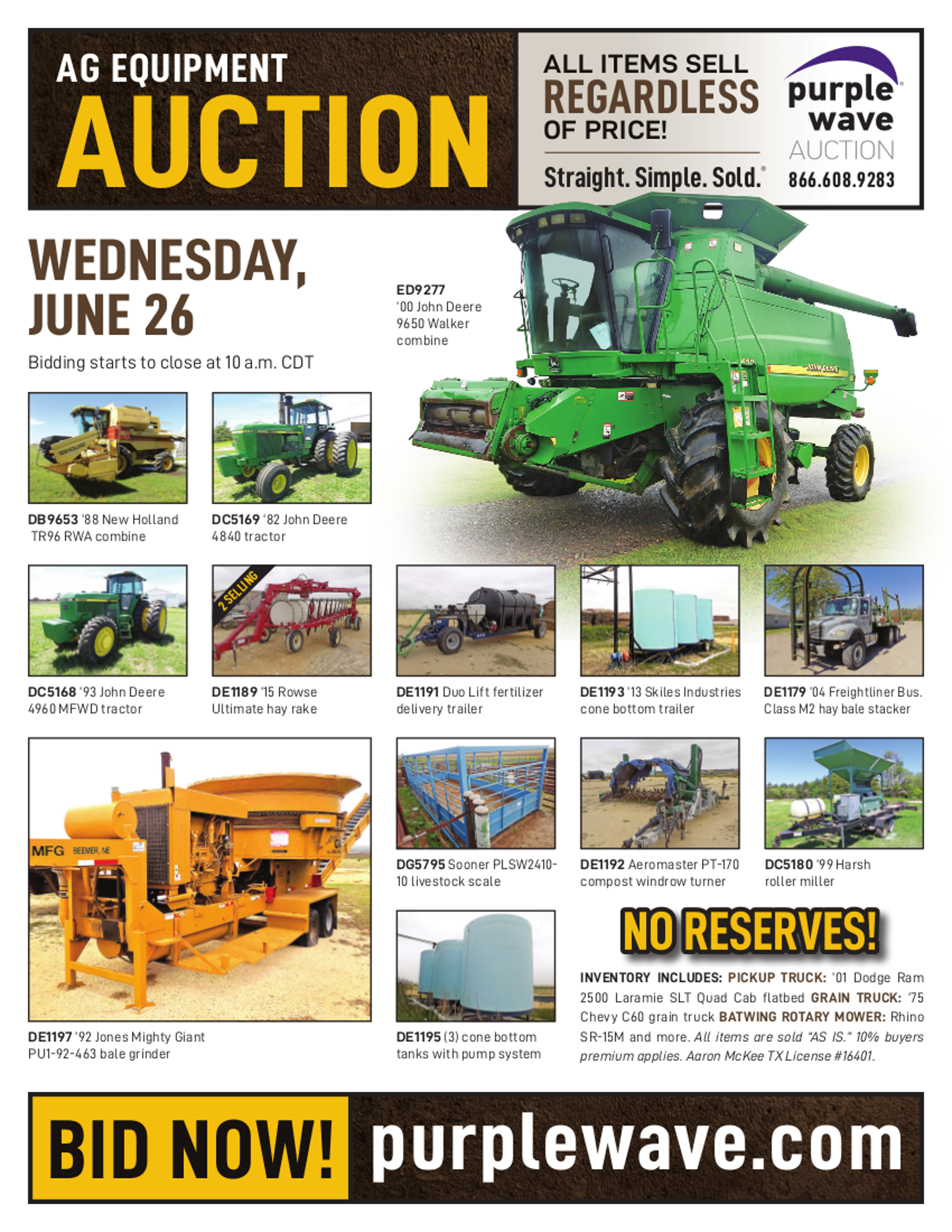 This auction is conducted by Purple Wave, Inc., whose home office is 825 Levee Drive, Manhattan, Kansas. Aaron McKee, Texas auctioneer license # 16401, operates Purple Wave, Inc. Complaints against us may be directed to the Texas Department of Licensing and Regulation, P.O. Box 12157, Austin, Texas 78711, (512) 463-6599. For additional required information, see the attached document.