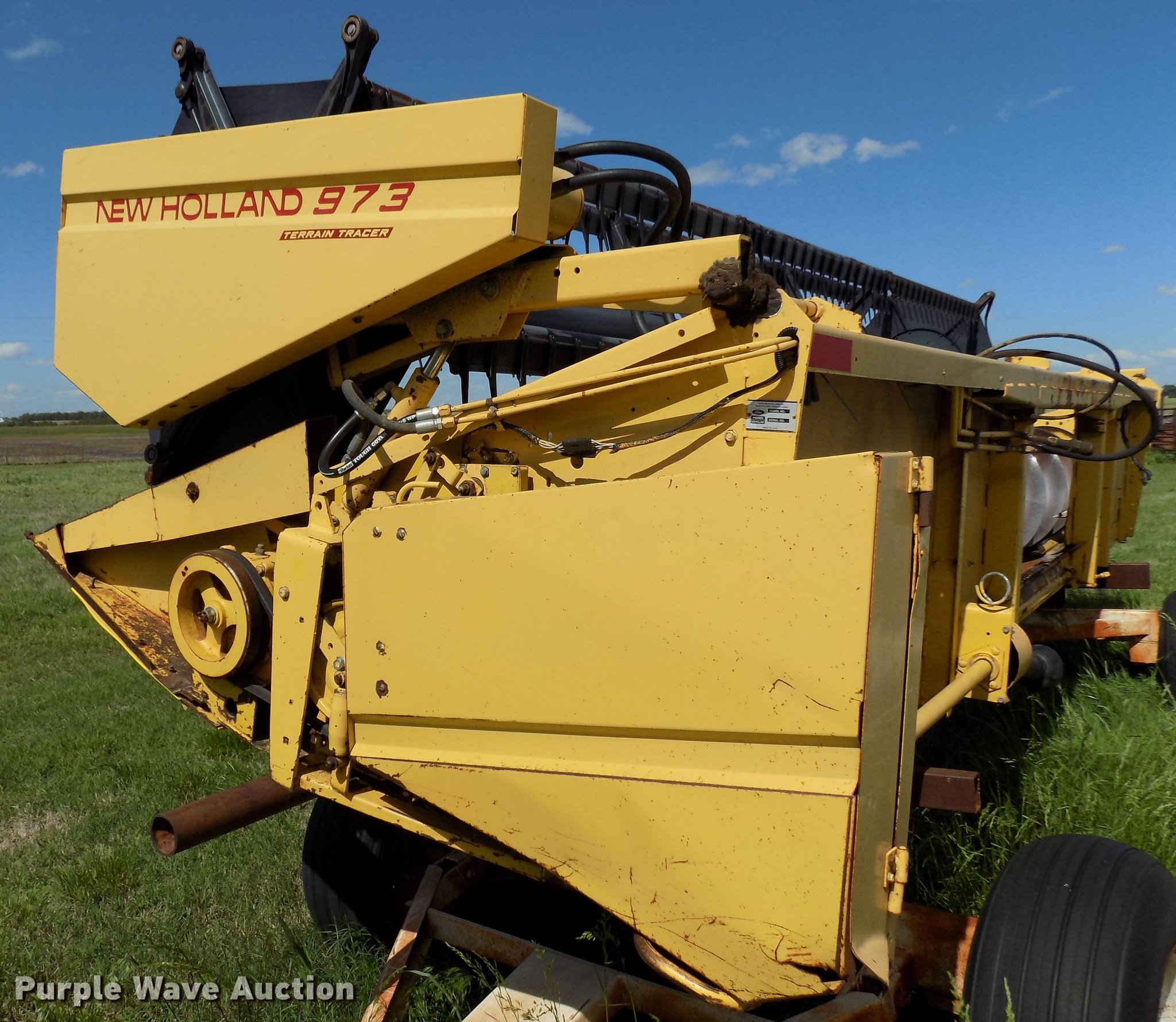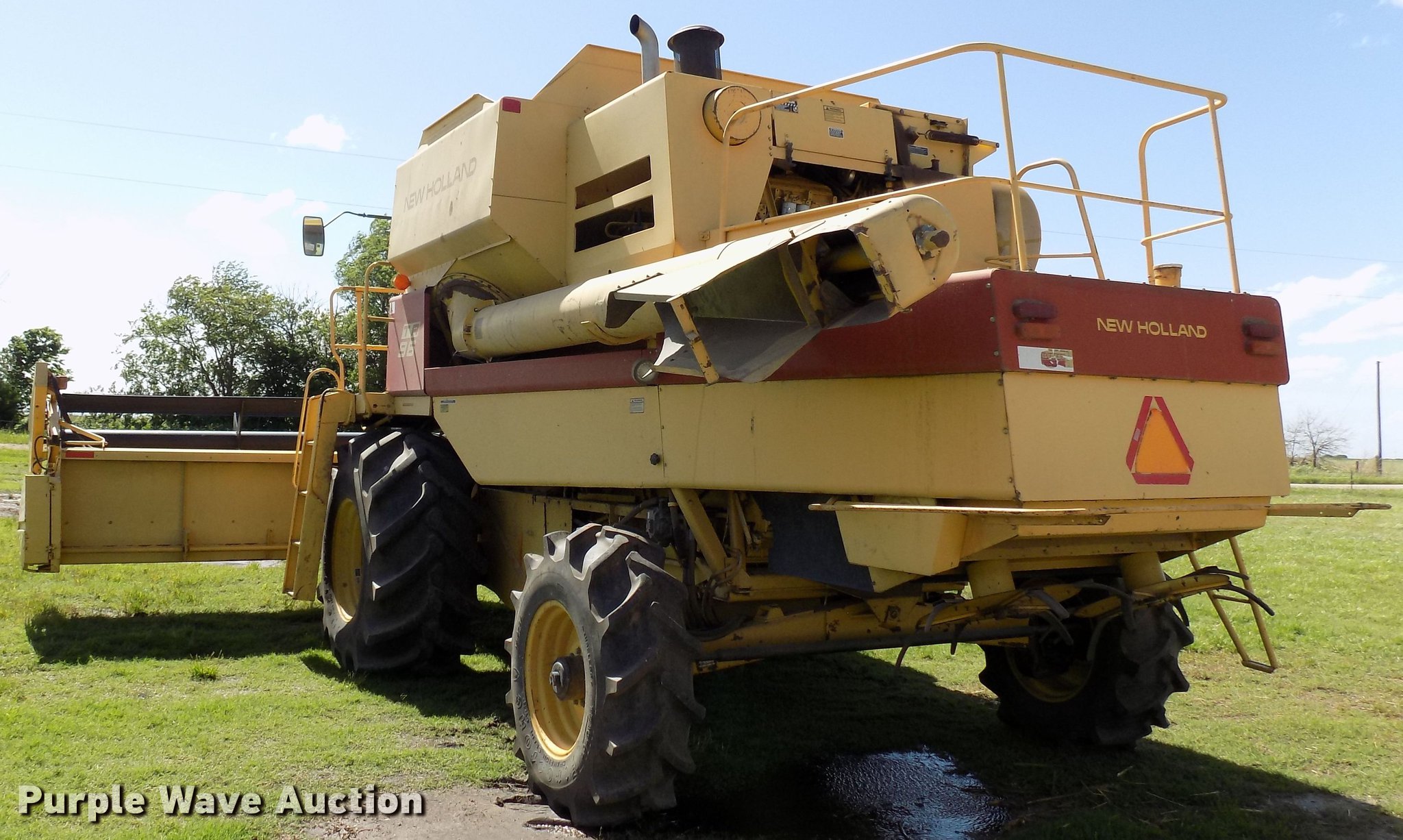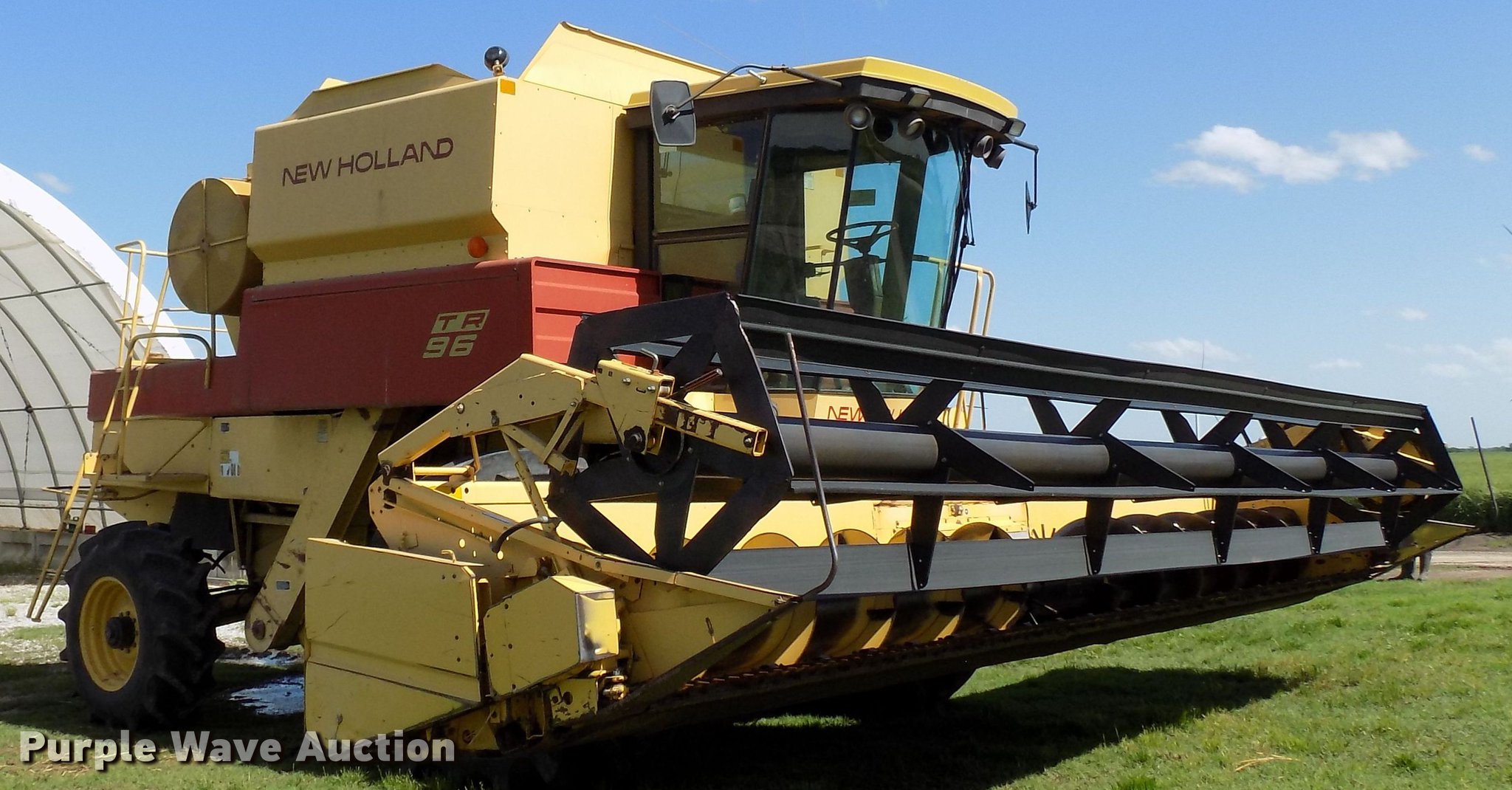 Purple Wave is selling a used Combine in Oklahoma. This item is a 1988 New Holland TR96 RWA combine with the following: 3,632 engine hours on meter, Ford six cylinder diesel engine, Hydrostatic transmission, 1F-1R gears, AC and heat, 13'L unloading auger, New Holland 971 rigid head, 25'W, Bat reel, Hydraulic reel height control, Dual driveline, Serial 602678, New Holland 973 all crop head, 20'W, Bat reel, Hydraulic reel height control, Single driveline, Poly skids, Stainless pan, Serial 544839, 30.5L-32 front tires, 16.9-26 rear tires, Engine hour meter may be inoperable, Header trailer not included, Serial 528972