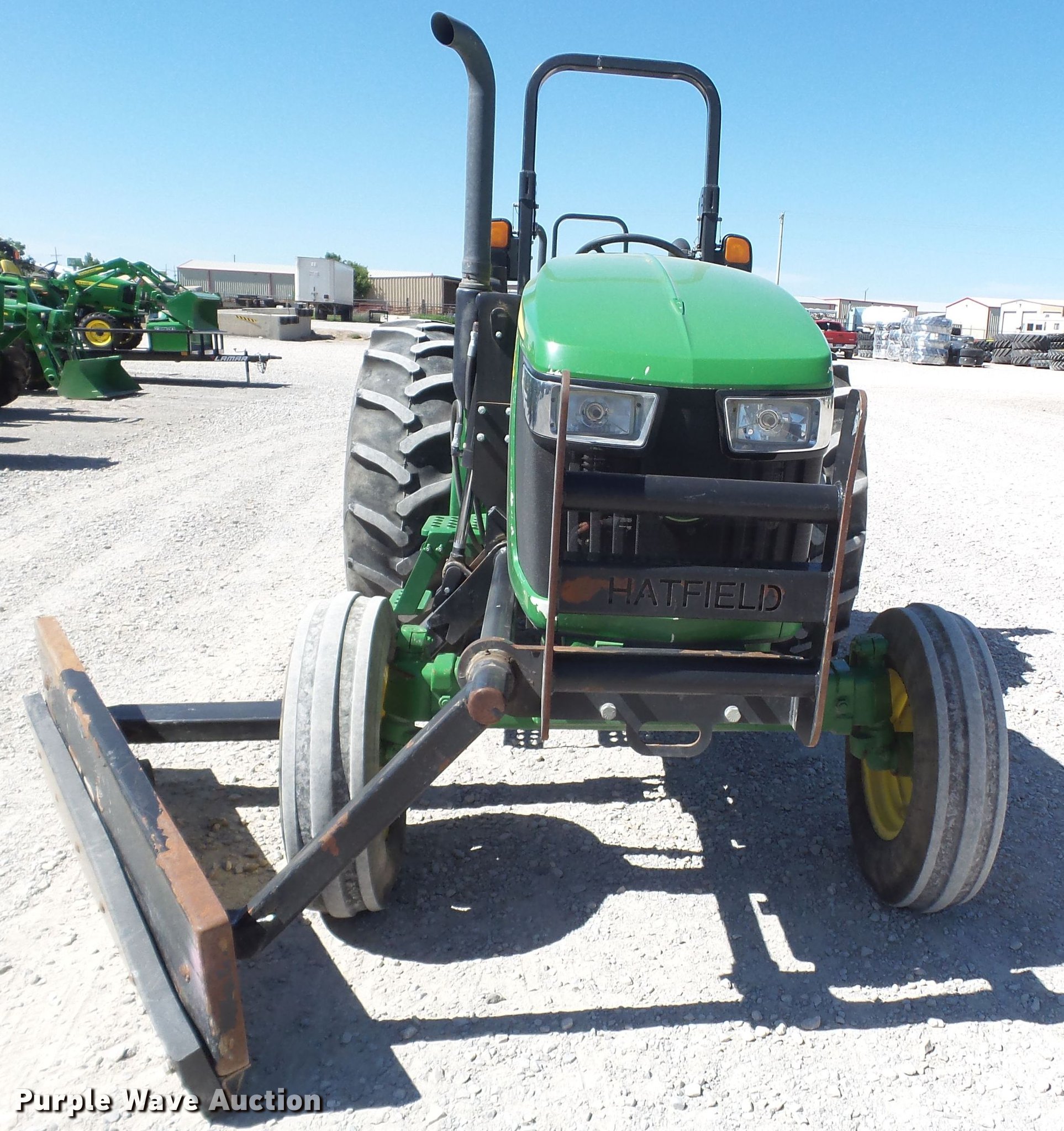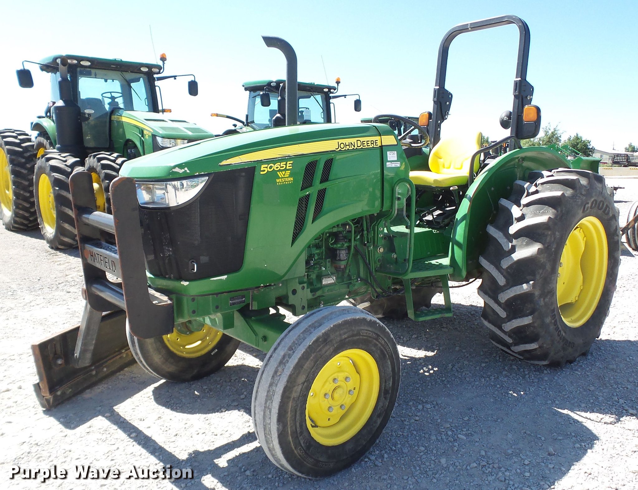 2015 John Deere 5065E tractor. 2,080 hours on meter, John Deere 3029HPY61 2.9L three cylinder diesel engine Serial PY3029H034726, Synchro transmission 9F-3R gears, 60"W x 12"H side blade Joystick blade controls, Three point Top link, 540 PTO, Rear hydraulic remote set, 7.50-16 front tires, 16.9-28 rear tires, Serial 1PY5065EVF3112202, Unit# 127263. Western Equipment, LLC. 10800 I-27. Amarillo , TX 79119