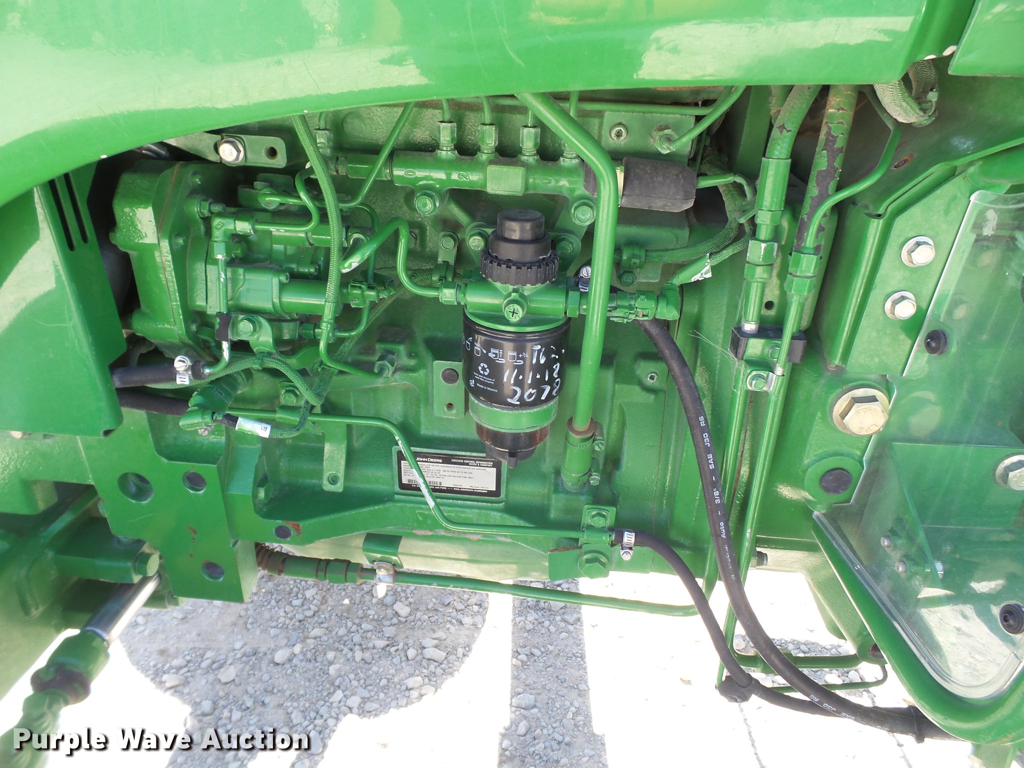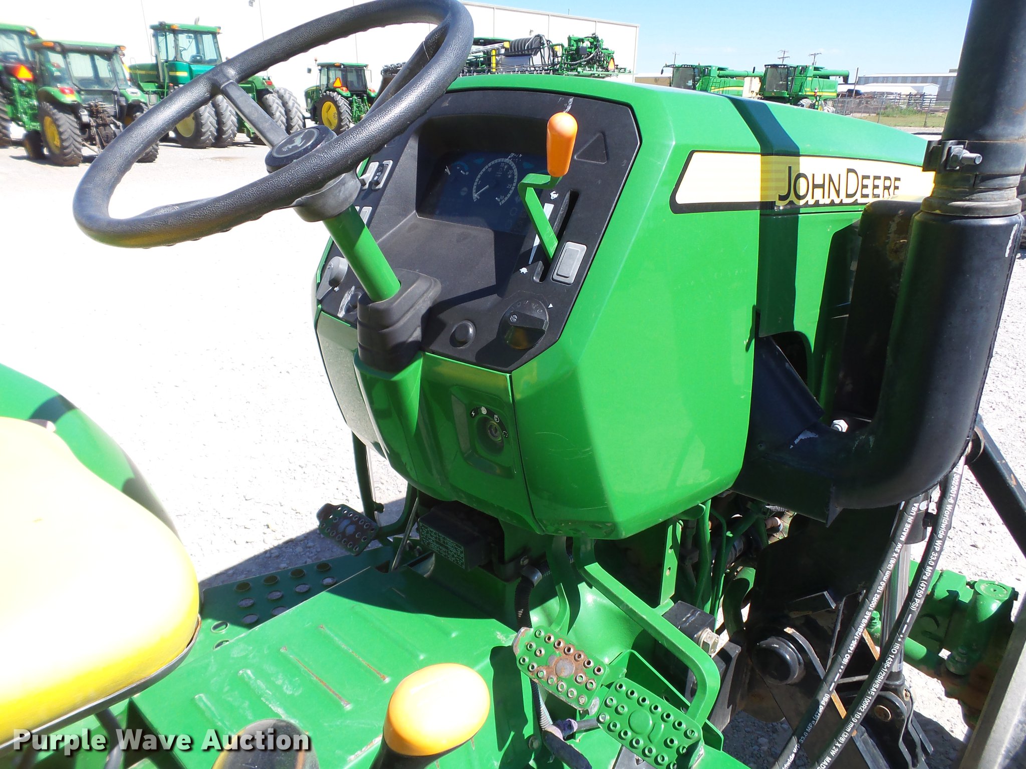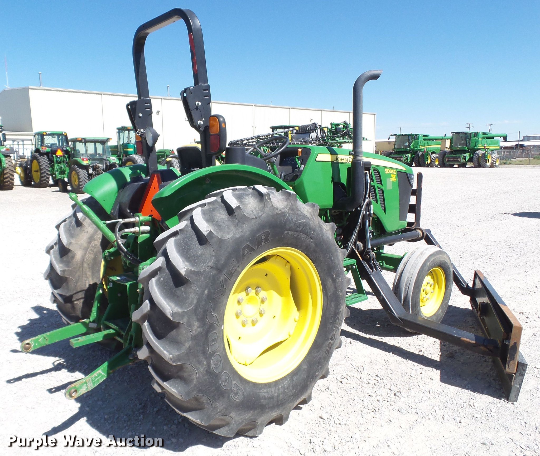 Purple Wave is selling a used Tractor in Texas. This item is a 2015 John Deere 5065E tractor with the following: 2,080 hours on meter, John Deere 3029HPY61 2.9L three cylinder diesel engine, Serial PY3029H034726, Synchro transmission, 9F-3R gears, 60"W x 12"H side blade, Joystick blade controls, Three point, Top link, 540 PTO, Rear hydraulic remote set, 7.50-16 front tires, 16.9-28 rear tires, Serial 1PY5065EVF3112202, Unit# 127263