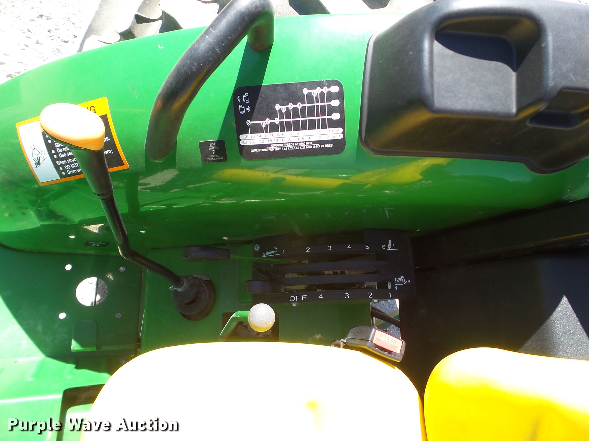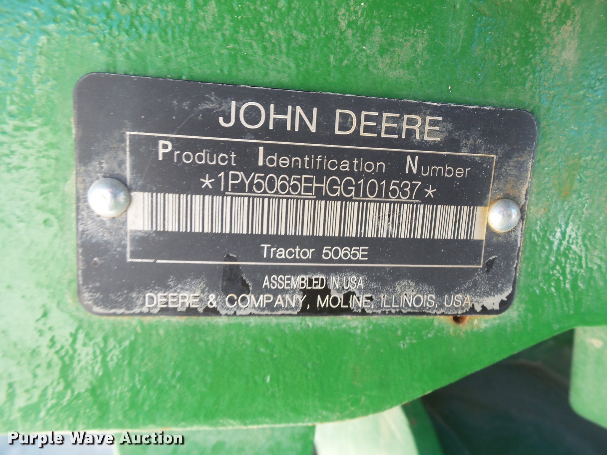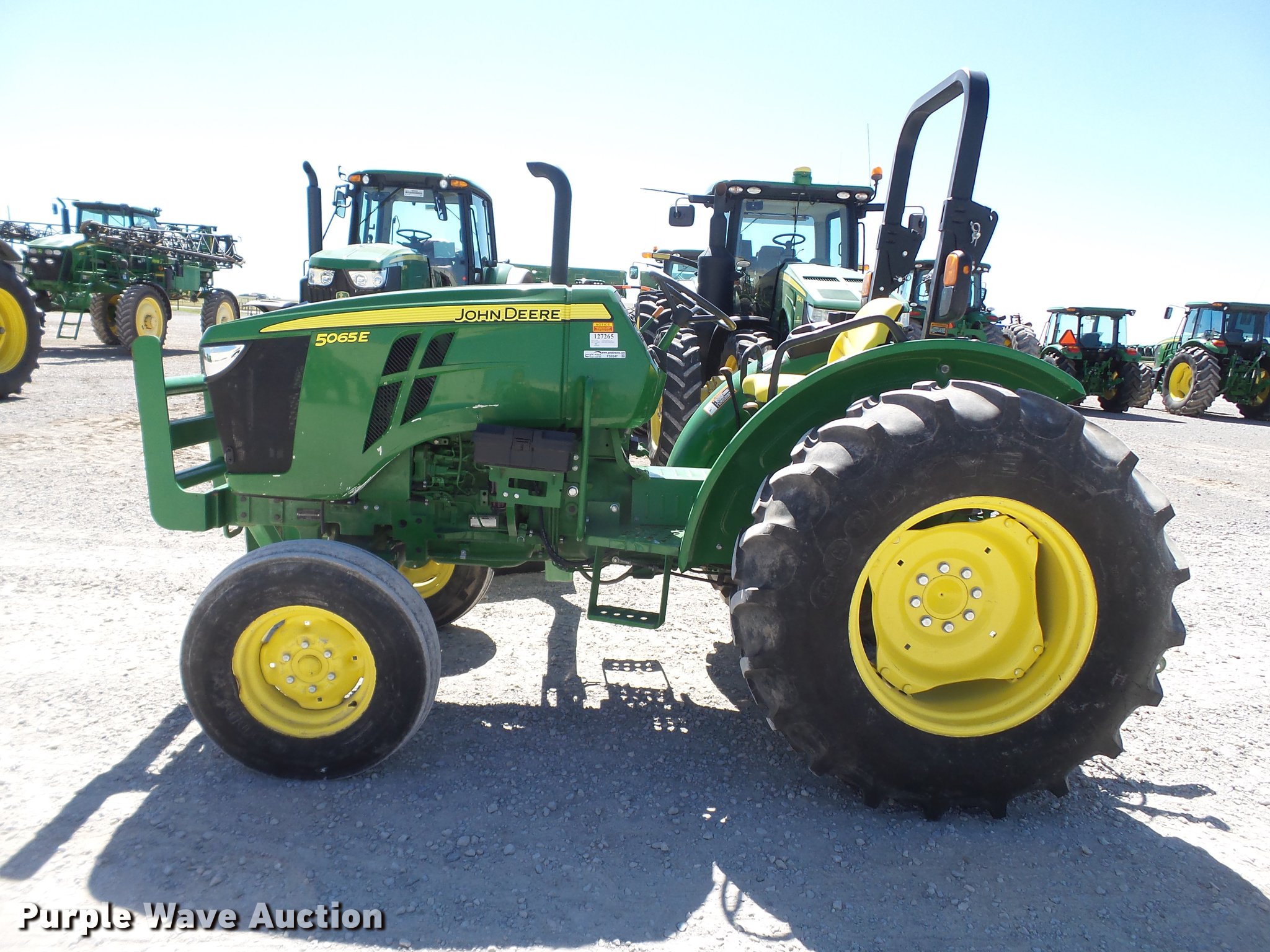 Purple Wave is selling a used Tractor in Texas. This item is a 2016 John Deere 5065E tractor with the following: 1,715 hours on meter, John Deere 3029HPY61 2.9L three cylinder diesel engine, Serial PY3029H076472, Synchro transmission, 9F-3R gears, 60"W x 12"H side blade, Joystick blade controls, Three point, Top link, 540 PTO, Rear hydraulic remote set, 7.50-16 front tires, 16.9-28 rear tires, Serial 1PY5065EHGG101537