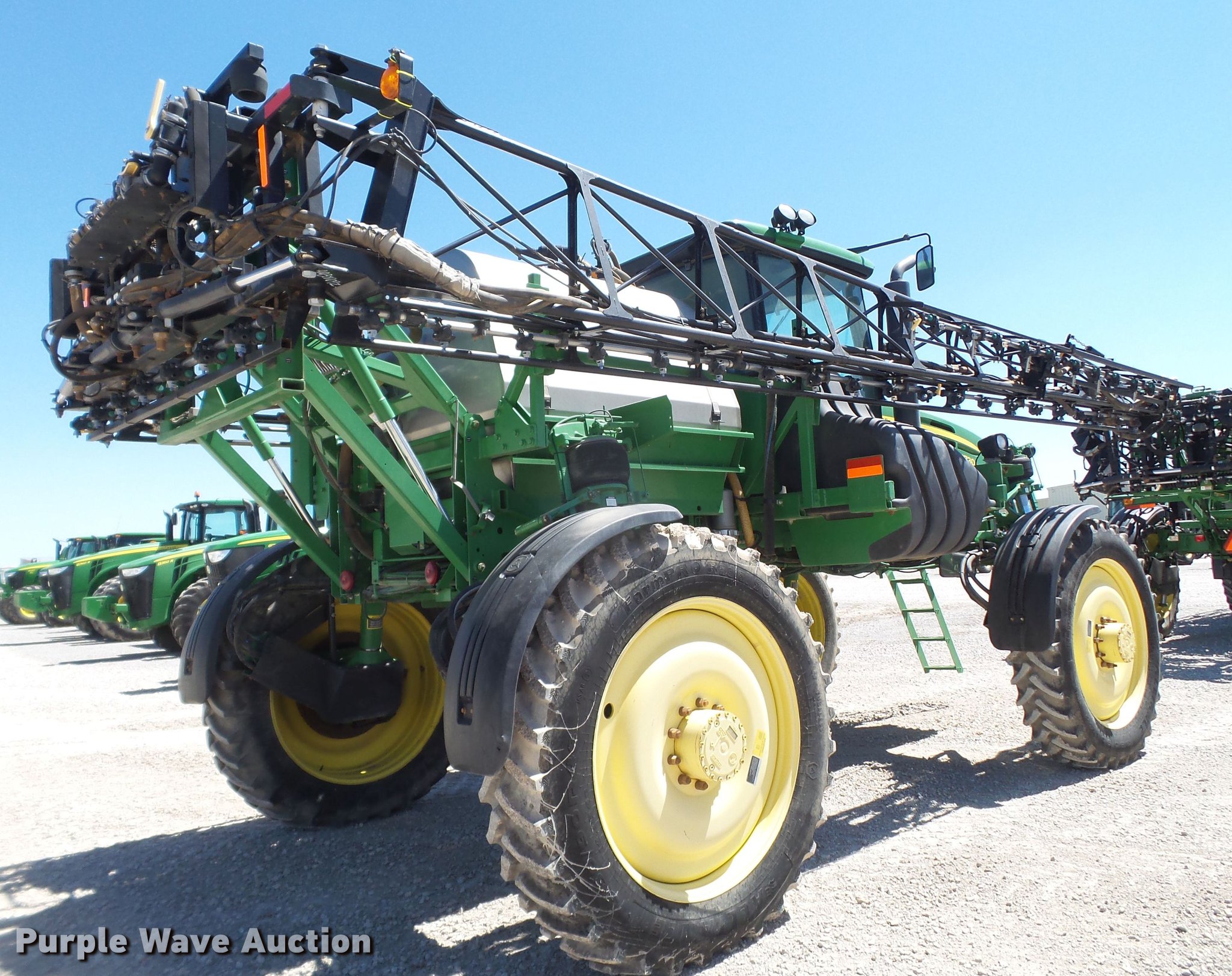 Purple Wave is selling a used Applicator Self Propelled in Texas. This item is a 2010 John Deere 4730 sprayer with the following: 2,433 engine hours on meter, John Deere 6.8L six cylinder diesel engine, 245 HP, Hydrostatic transmission, Four wheel drive, 800 gallon stainless steel solution tank, Stainless steel chemical eductor tank, Rinse tank, Clean water tank, 90'W boom, Five boom sections, Break-away boom, Hydraulic boom fold, Automatic height control, 15" nozzle spacing, Five-way nozzle bodies, AC and heat, Air suspension seat, Work lights, Hydraulic ladder, Hydraulic axle width adjust, 380/90R46 row crop tires, Serial N04730X009059