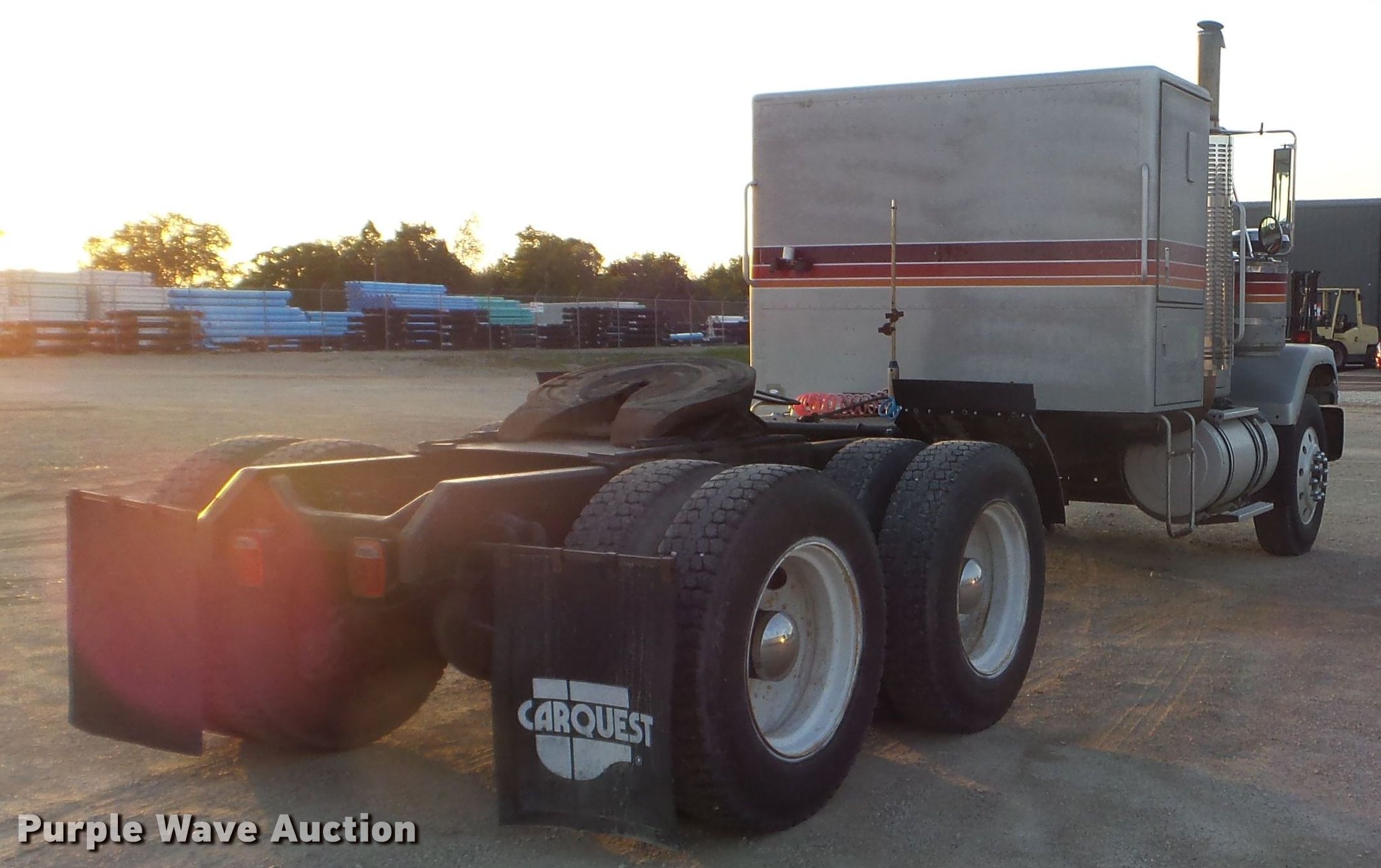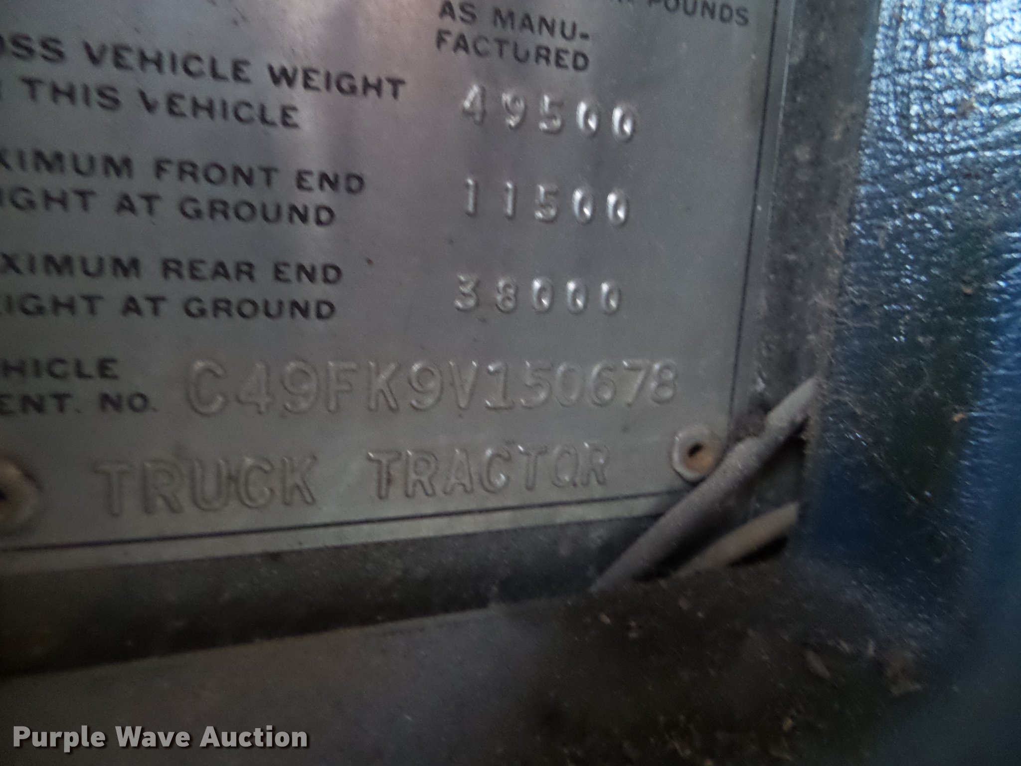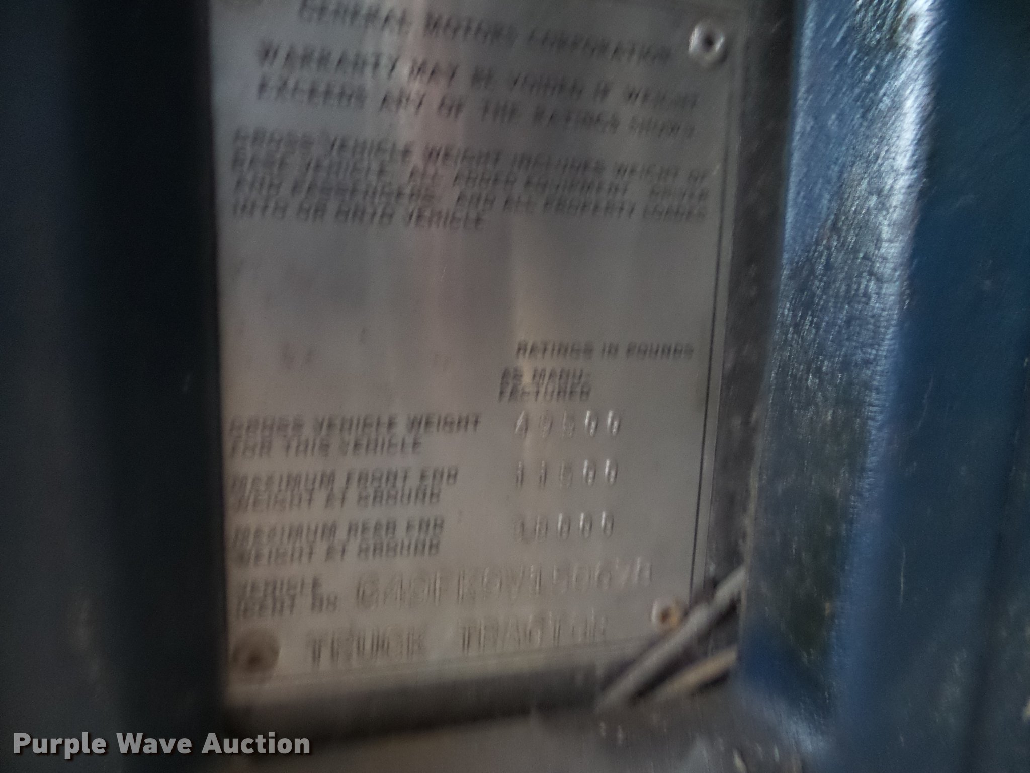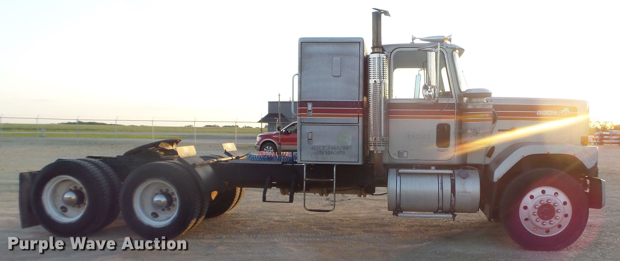 Purple Wave is selling a used Truck Tractor in Minnesota. This item is a 1979 Chevrolet Bison semi truck with the following: 394,608 miles on odometer, 4,640 hours on meter, Detroit Diesel 8V92 eight cylinder diesel engine, 13 speed manual transmission, Tandem axle, Inter-axle differential lock, AC and heat, Heated mirrors, Sleeper, 32"L, Aluminum deck plate, Air operated sliding fifth wheel plate, Dual fuel tanks, Spring suspension, Air brakes, Engine brake, 11R24.5 tires, GVWR 49,500 lbs, FAWR 11,500 lbs, IAWR 19,000 lbs, RAWR 19,000 lbs