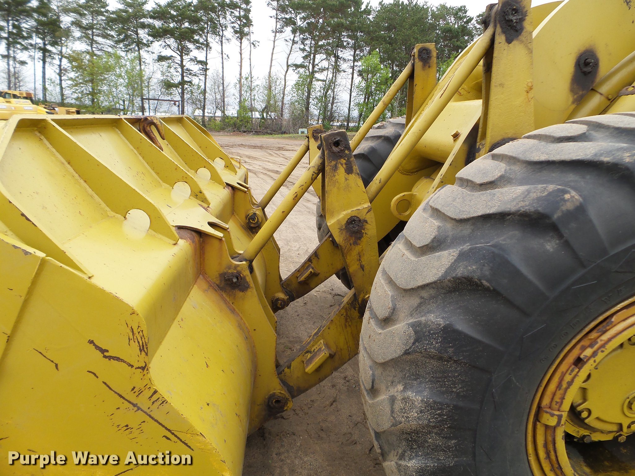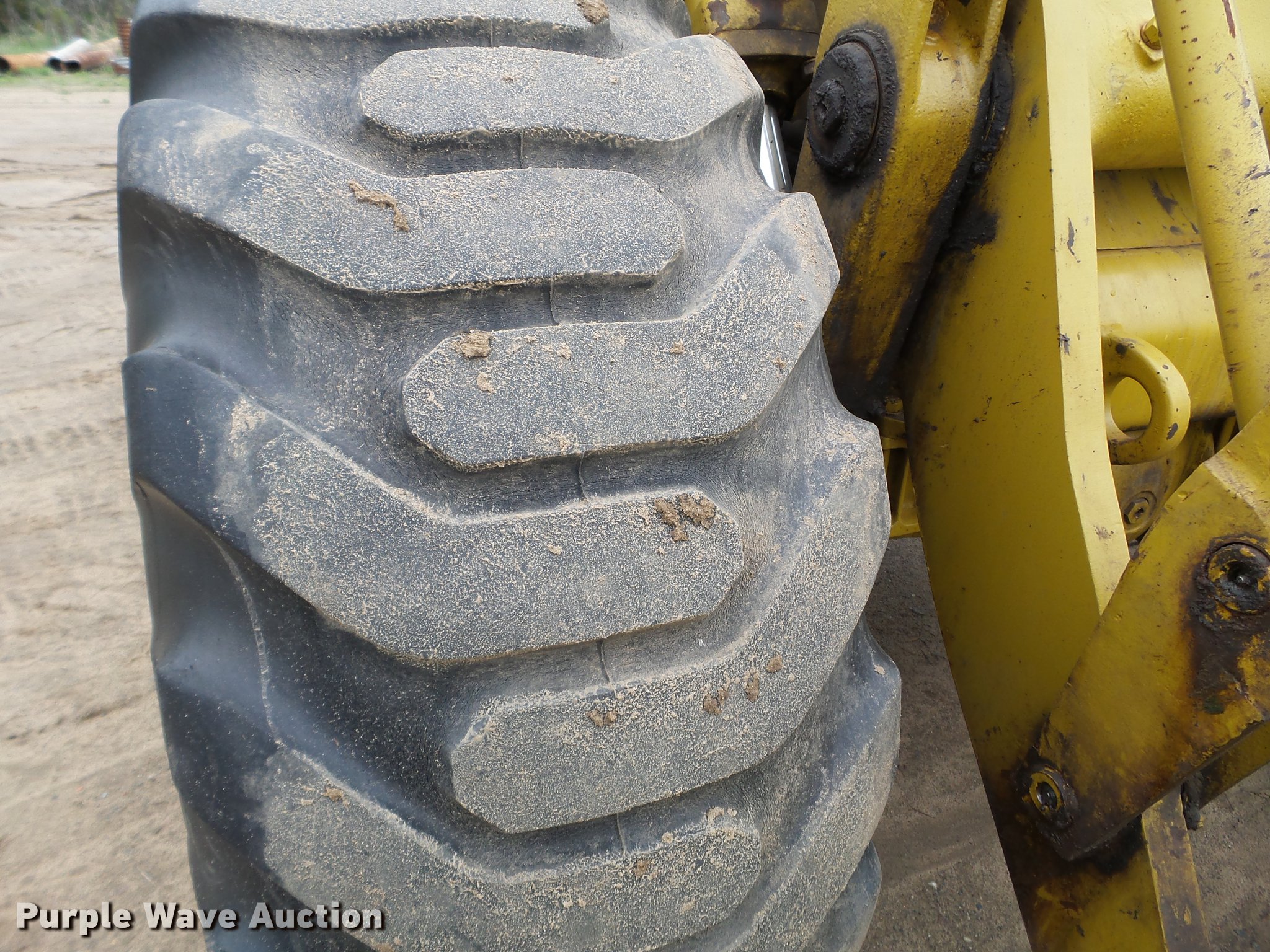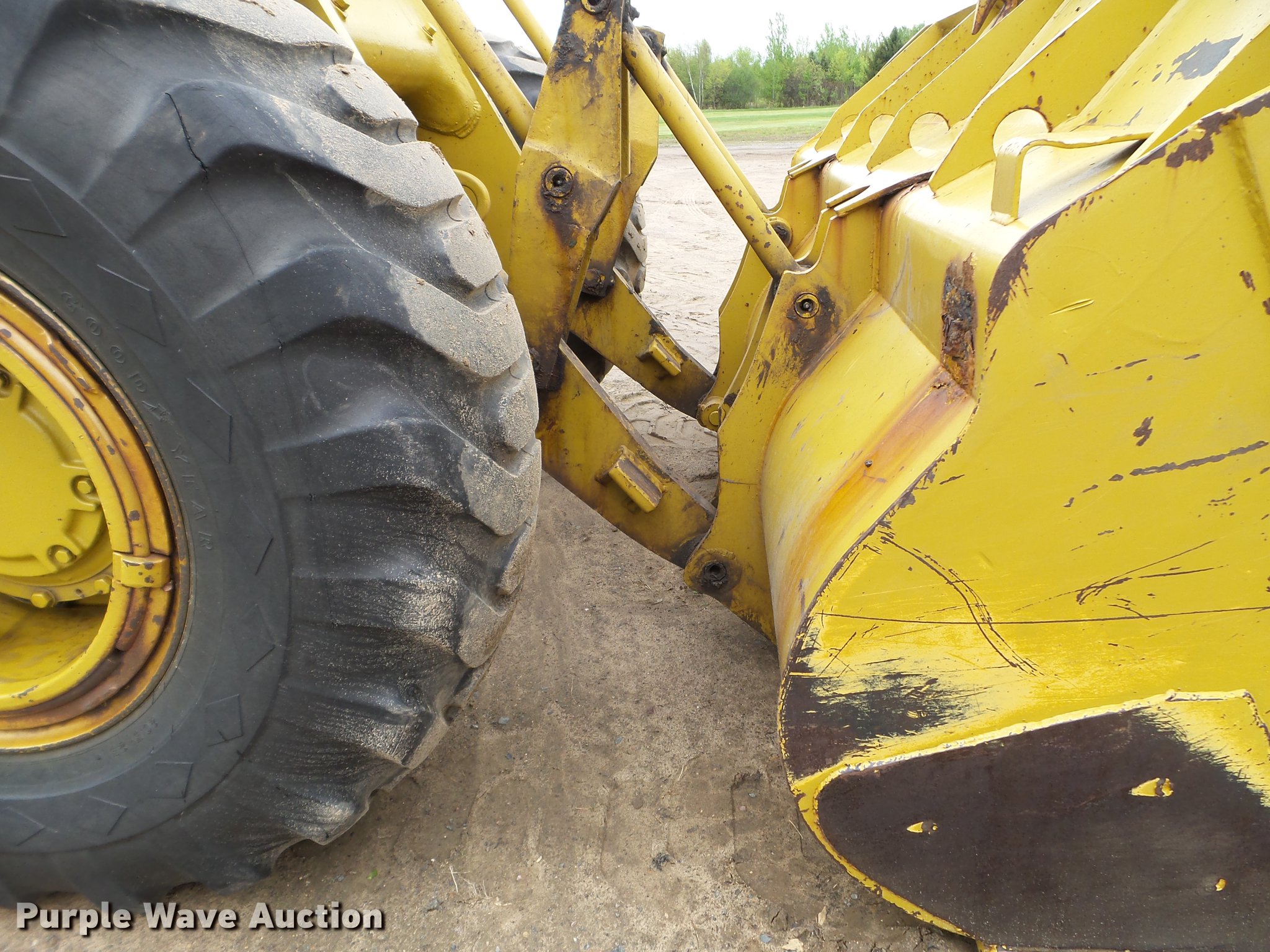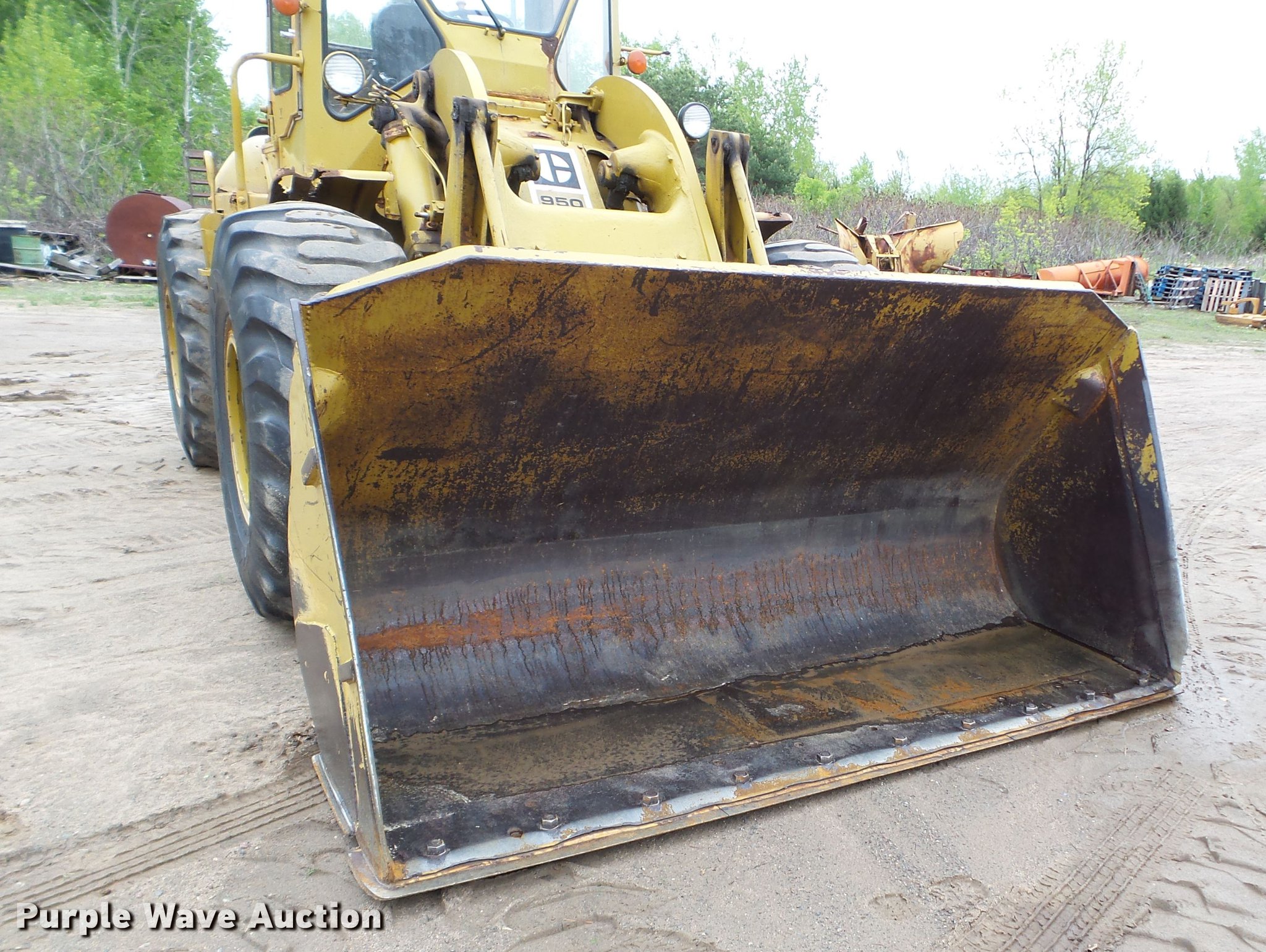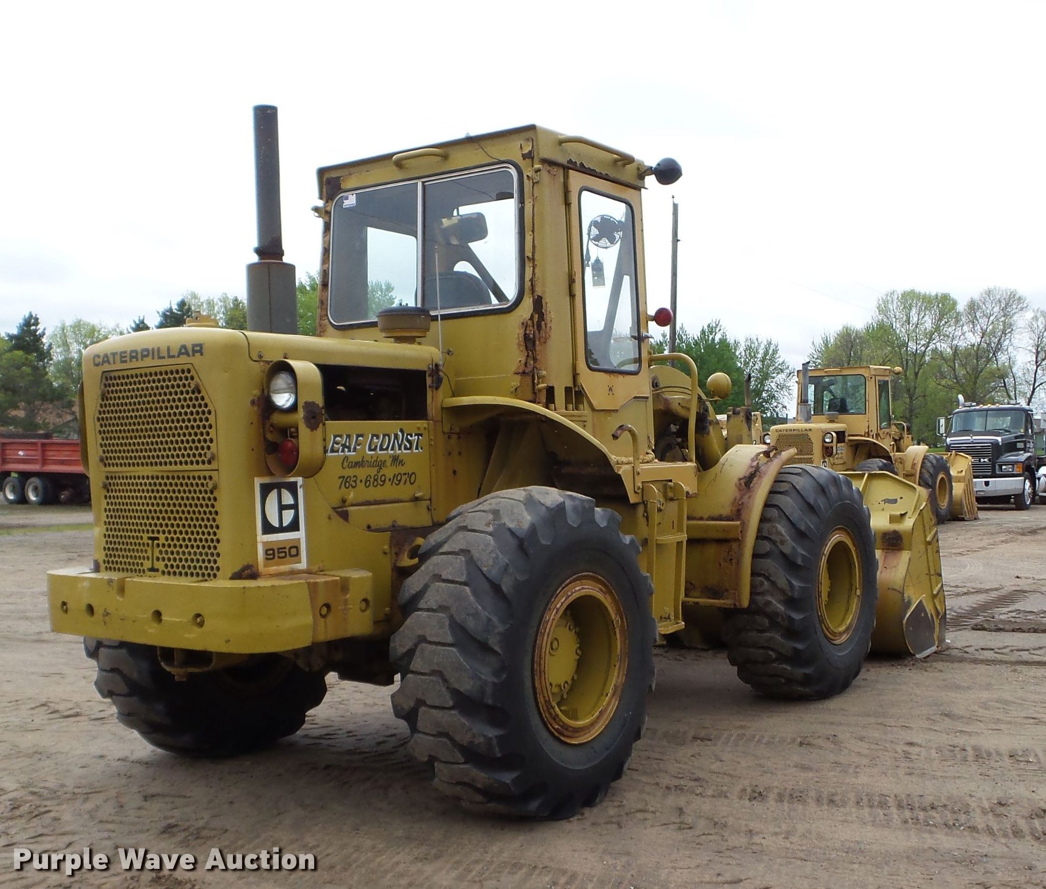 Purple Wave is selling a used Wheel Loader in Minnesota. This item is a 1980 Caterpillar 950 wheel loader with the following: 1,327 hours on meter, Caterpillar four cylinder diesel engine, Powershift transmission, 4F-4R gears, Enclosed cab, Heat, Two-lever bucket controls, 103"W general purpose bucket, Counterweights, 20.5-25 tires, Serial 81J13522