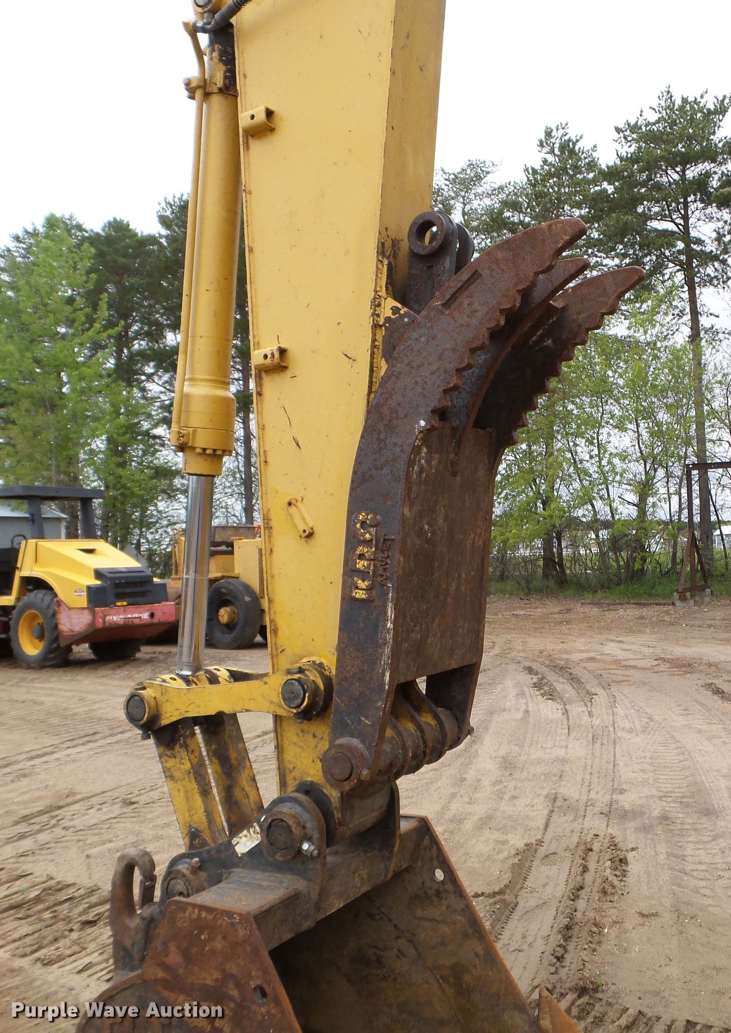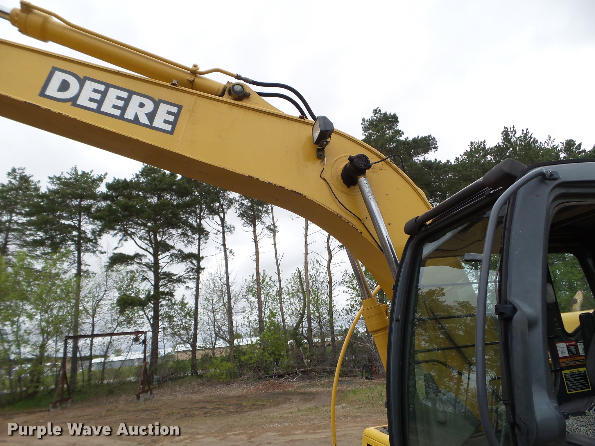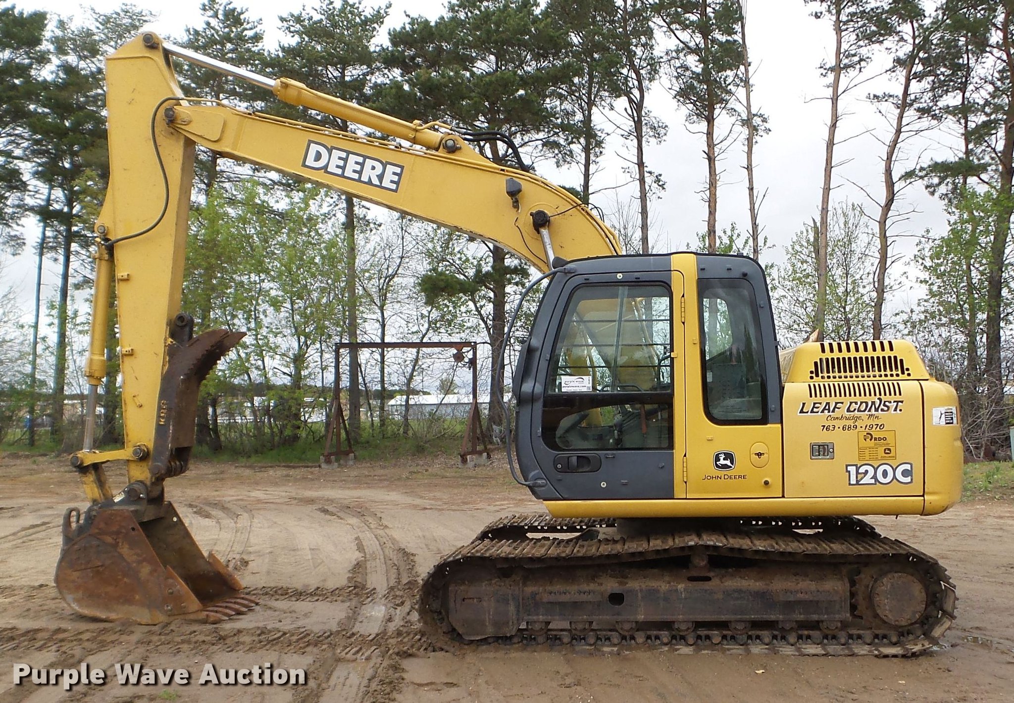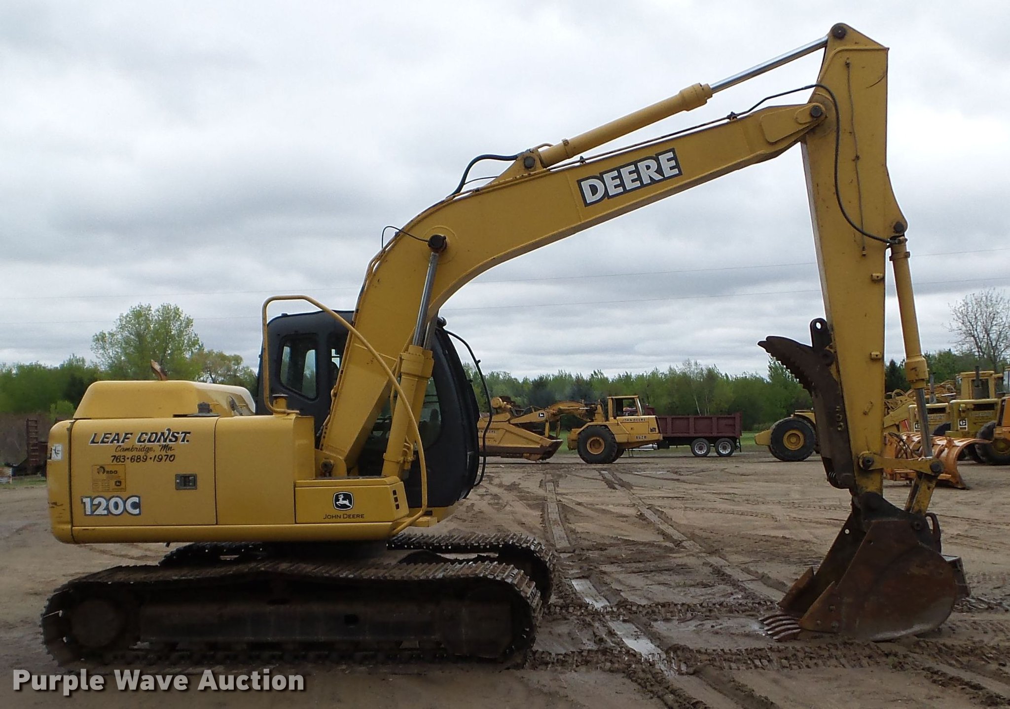 Purple Wave is selling a used Hydraulic Excavator in Minnesota. This item is a 2004 John Deere 120C excavator with the following: 6,097 hours on meter, John Deere four cylinder diesel engine, Two speed hydrostatic transmission, Enclosed cab, AC and heat, Pattern changer, Standard boom, 9'11" stick length, EBI 35.5"W bucket, 31" ripper shank, Manual thumb, 27.5"W steel triple grouser track pads, Serial FF120CX034435