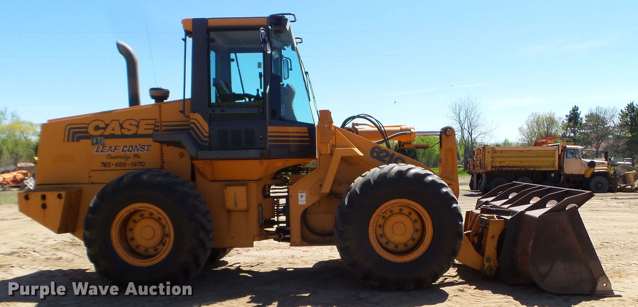 2001 Case 621C wheel loader. 5,203 hours on meter, Case 6T-590 six cylinder diesel engine, Powershift transmission 4F-4R gears, EROPS, Heat, Joystick bucket controls, EBI 104"W general purpose bucket Bolt-on cutting edge, ACS S730 12'W snow plow Bolt-on cutting edge, Hydraulic quick coupler, Falls 12' snow plow Reversible cutting edge, Front auxiliary hydraulics, Counterweights, 20.5-25 tires, Serial JEE0125593. Leaf Construction. 3024 Hwy 95 NE. Cambridge, MN 55008