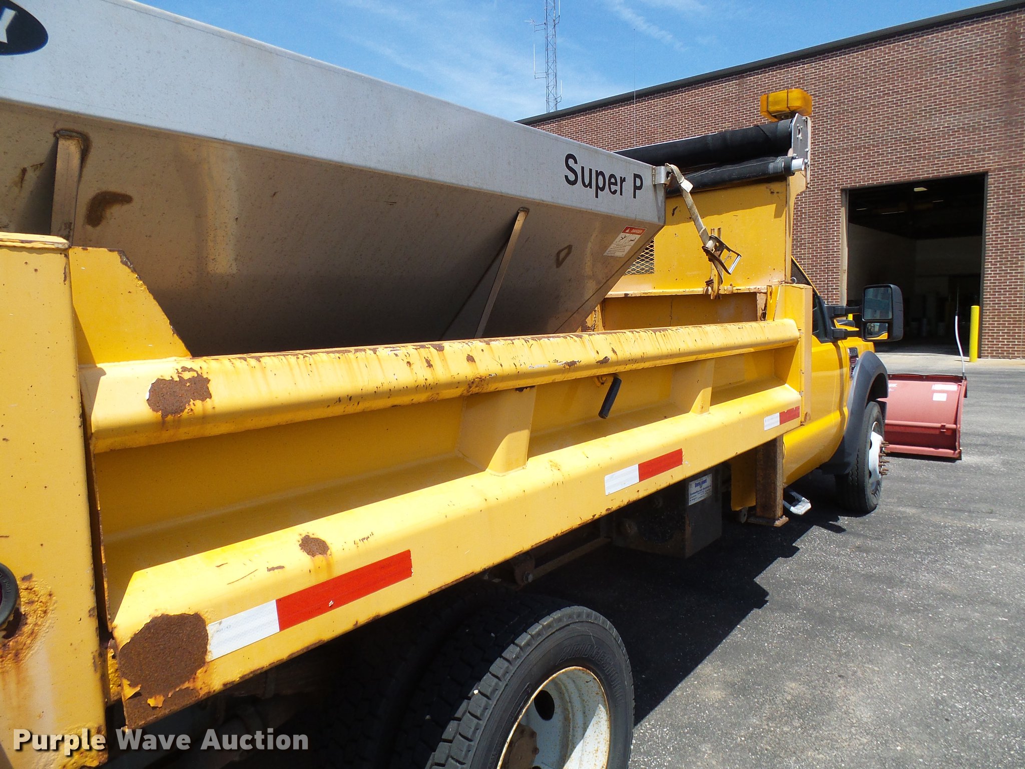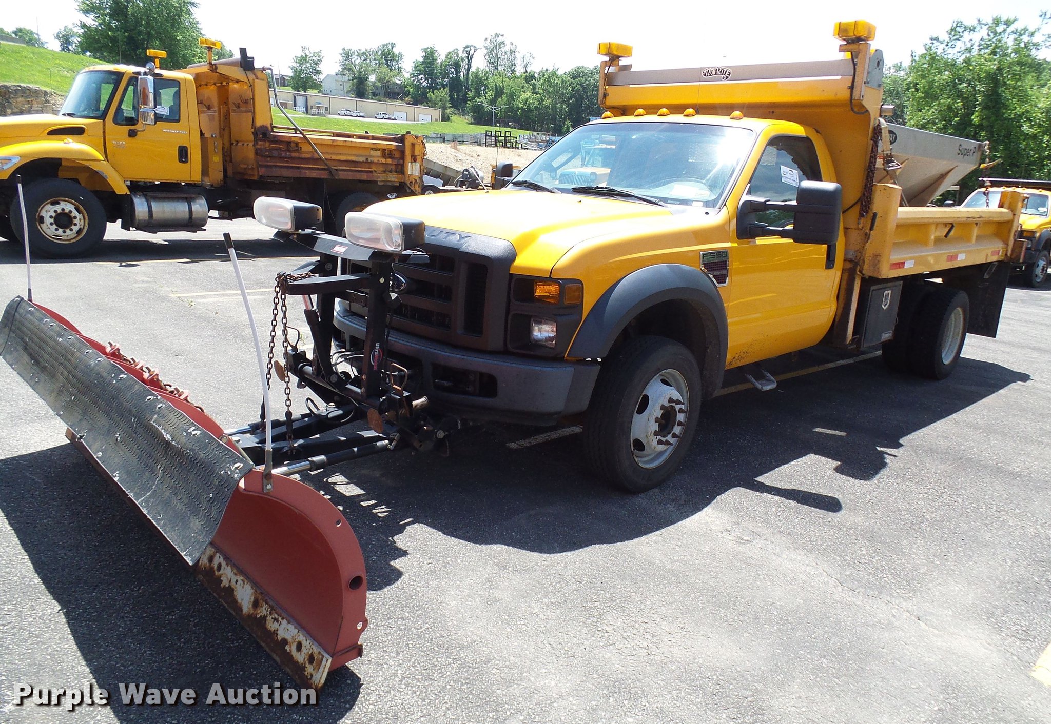 Purple Wave is selling a used Construction Dump Truck in Missouri. This item is a 2008 Ford F550 Super Duty dump truck with the following: 165,791 miles on odometer, 6.4L V8 OHV 32V diesel engine, Automatic transmission, Single axle, AC and heat, 11'L x 8'W steel dump bed, Single ram hoist, Manual operated end gate, Hiway SCEPEPP-9 spreader, Western 9' snow plow, MODOT ID P2569, Spring suspension, Hydraulic brakes, 225/70R19.5 tires, MODOT ID 8013