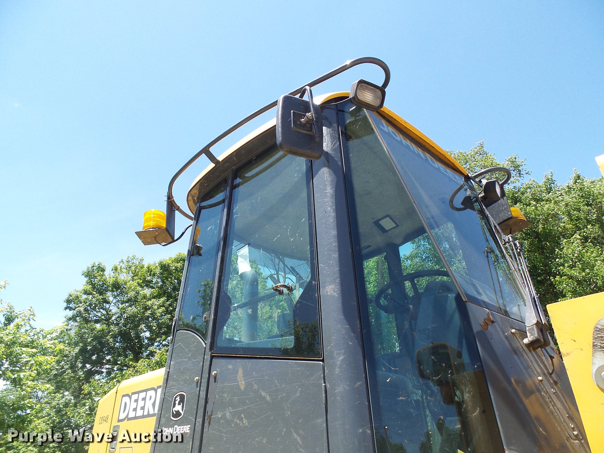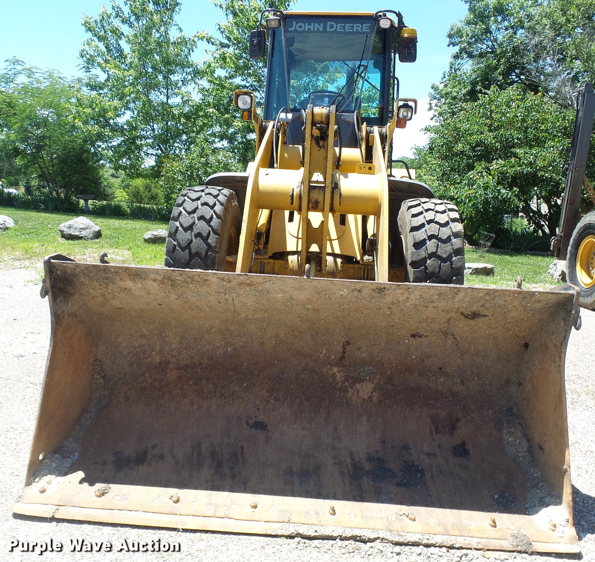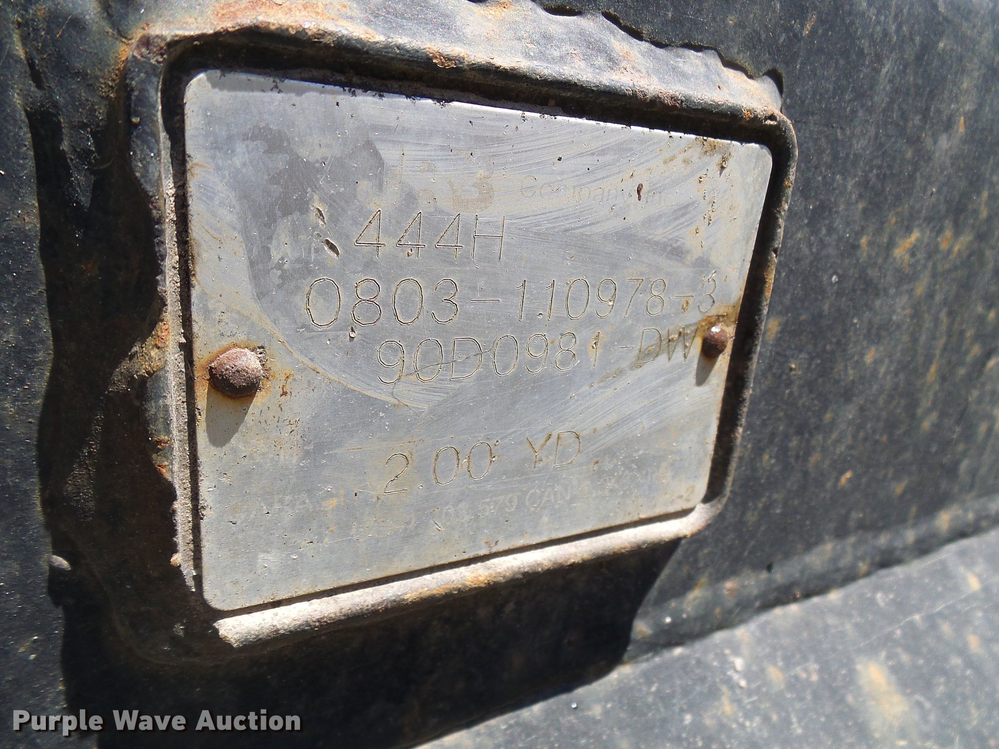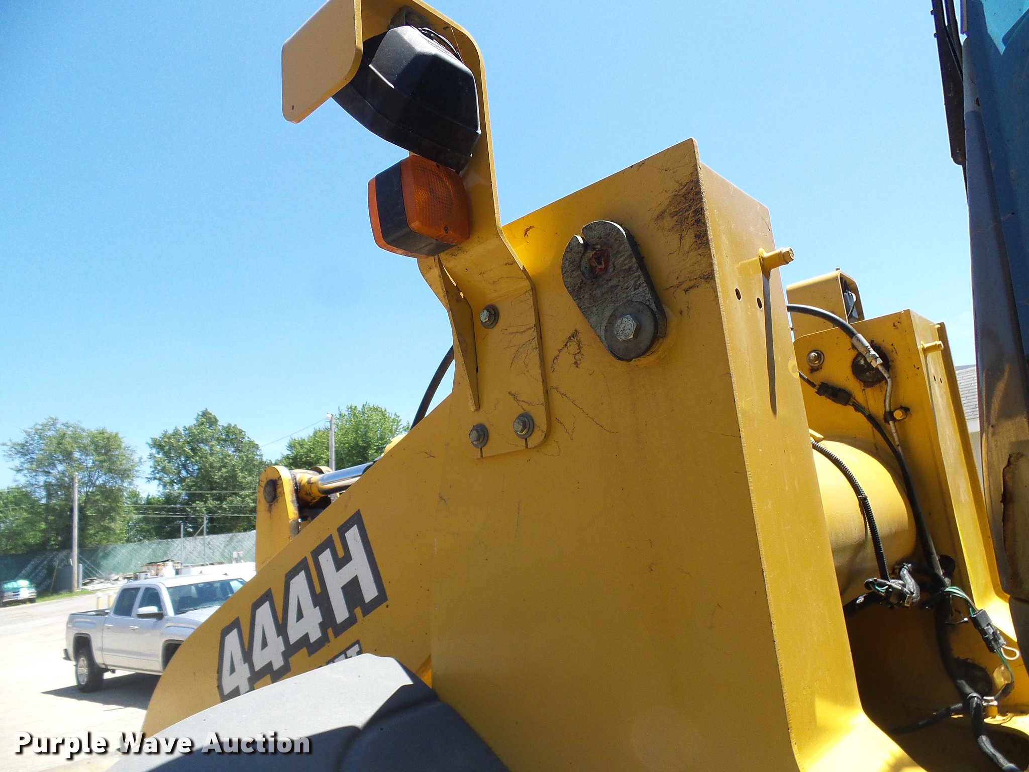 Purple Wave is selling a used Wheel Loader in Missouri. This item is a 2003 John Deere 444H wheel loader with the following: 6,476 hours on meter, John Deere four cylinder diesel engine, Powershift transmission, 4F-4R gears, Enclosed cab, AC and heat, Joystick bucket controls, Hydraulic quick coupler, JRB bucket, 8'W, Bolt-on cutting edge, Counterweights, 17.5R25 tires, Serial DW444HX589721, Unit# G8948