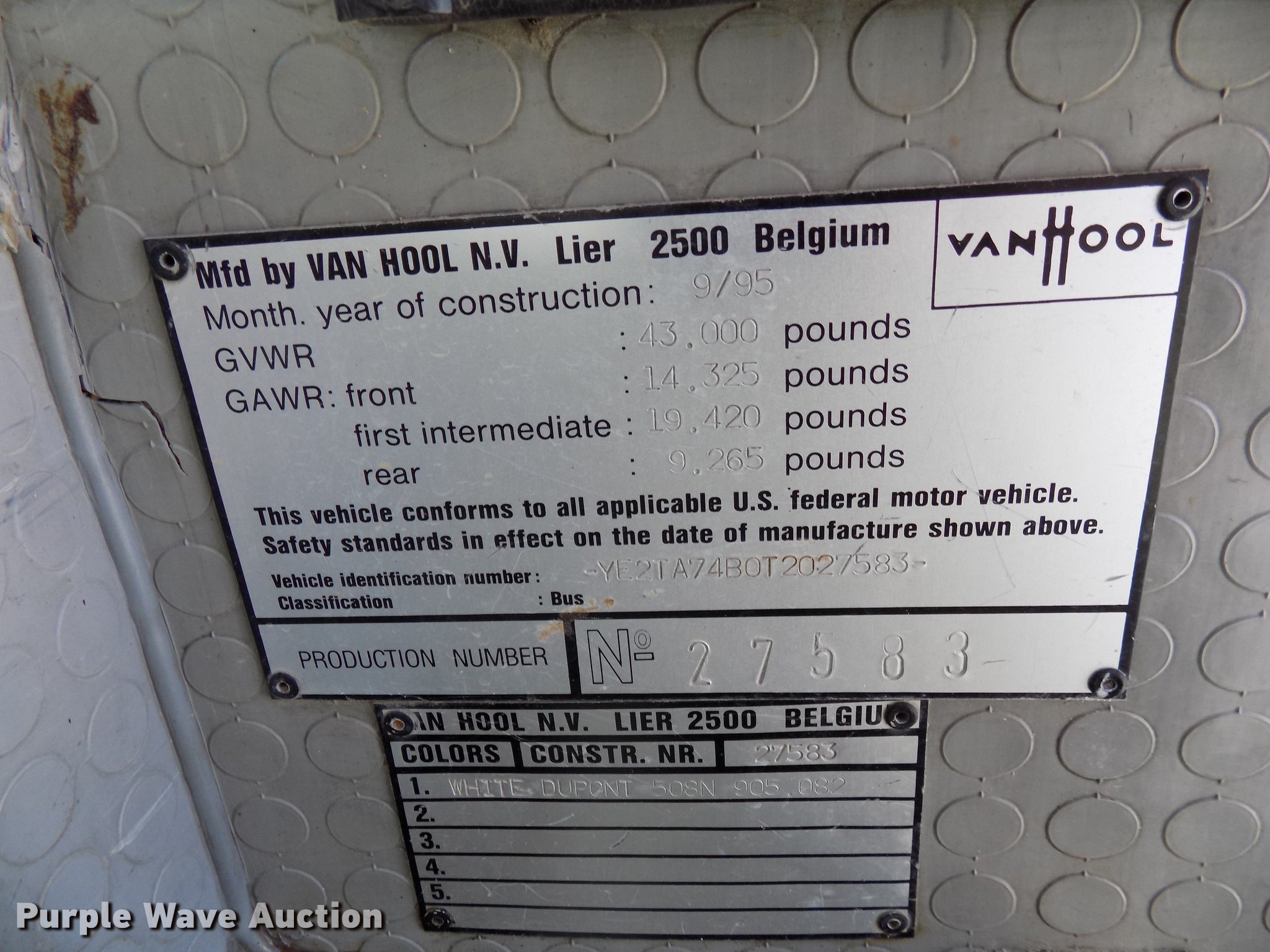 Purple Wave is selling a used Bus in Oklahoma. This item is a 1996 Van Hool T840 coach bus with the following: 436,462 miles on odometer, Cummins M11 10.8L L6 diesel engine, Automatic transmission, Tandem axle, AC and heat, On-board restroom, 50 passenger capacity, (50) adult seats, 315/80R22.5 tires, GVWR 43,000 lbs, Non-operational vehicle