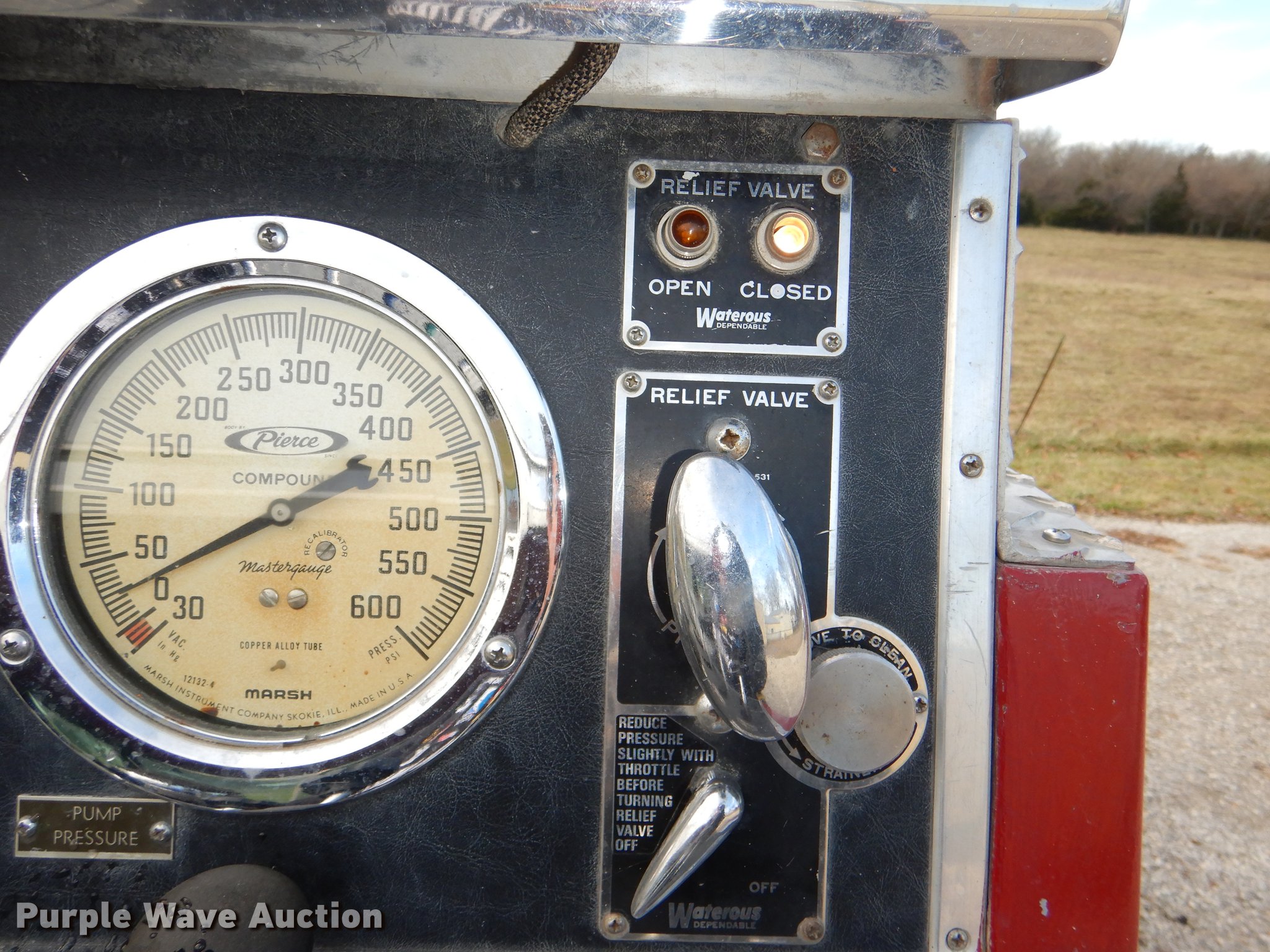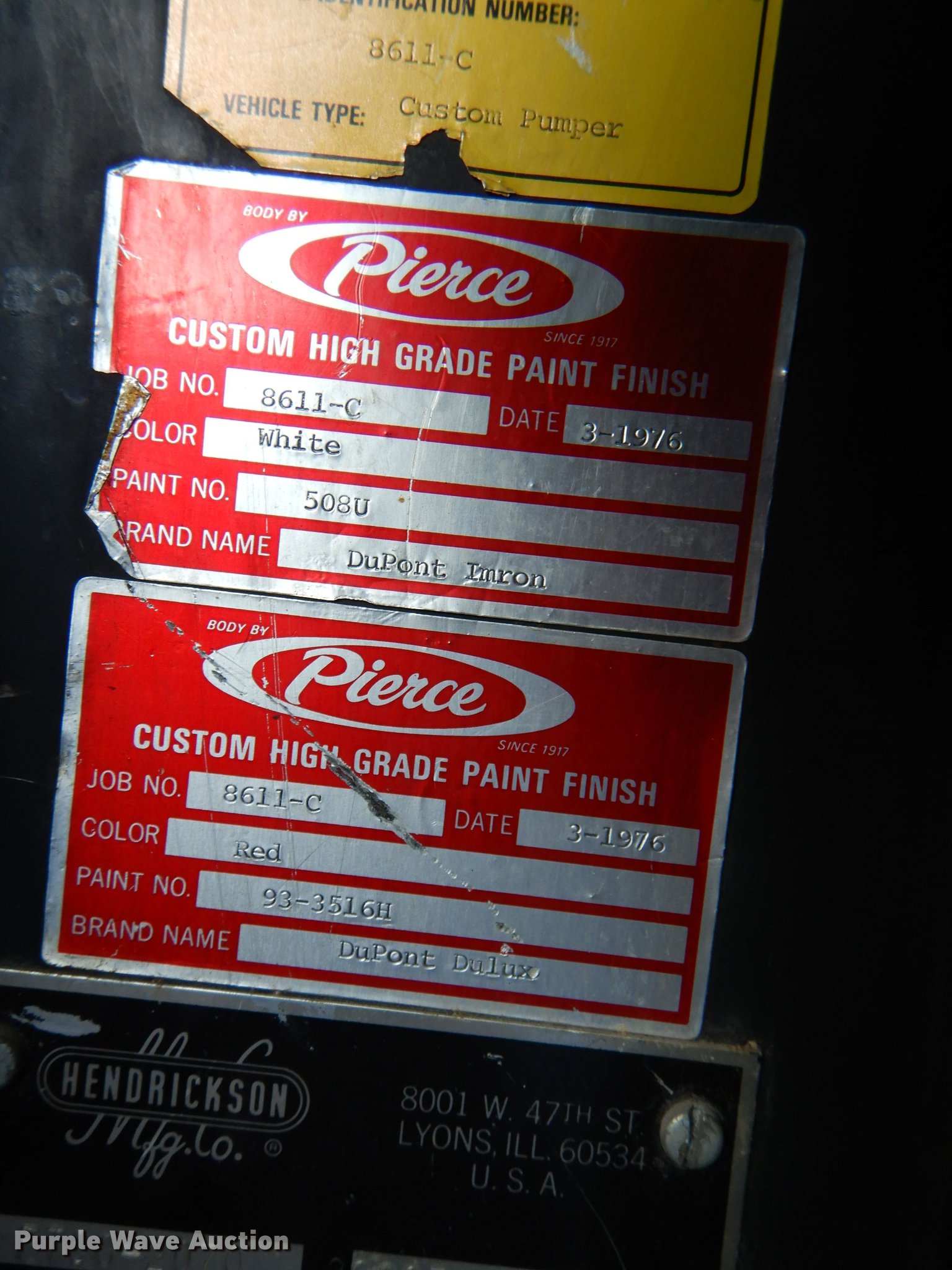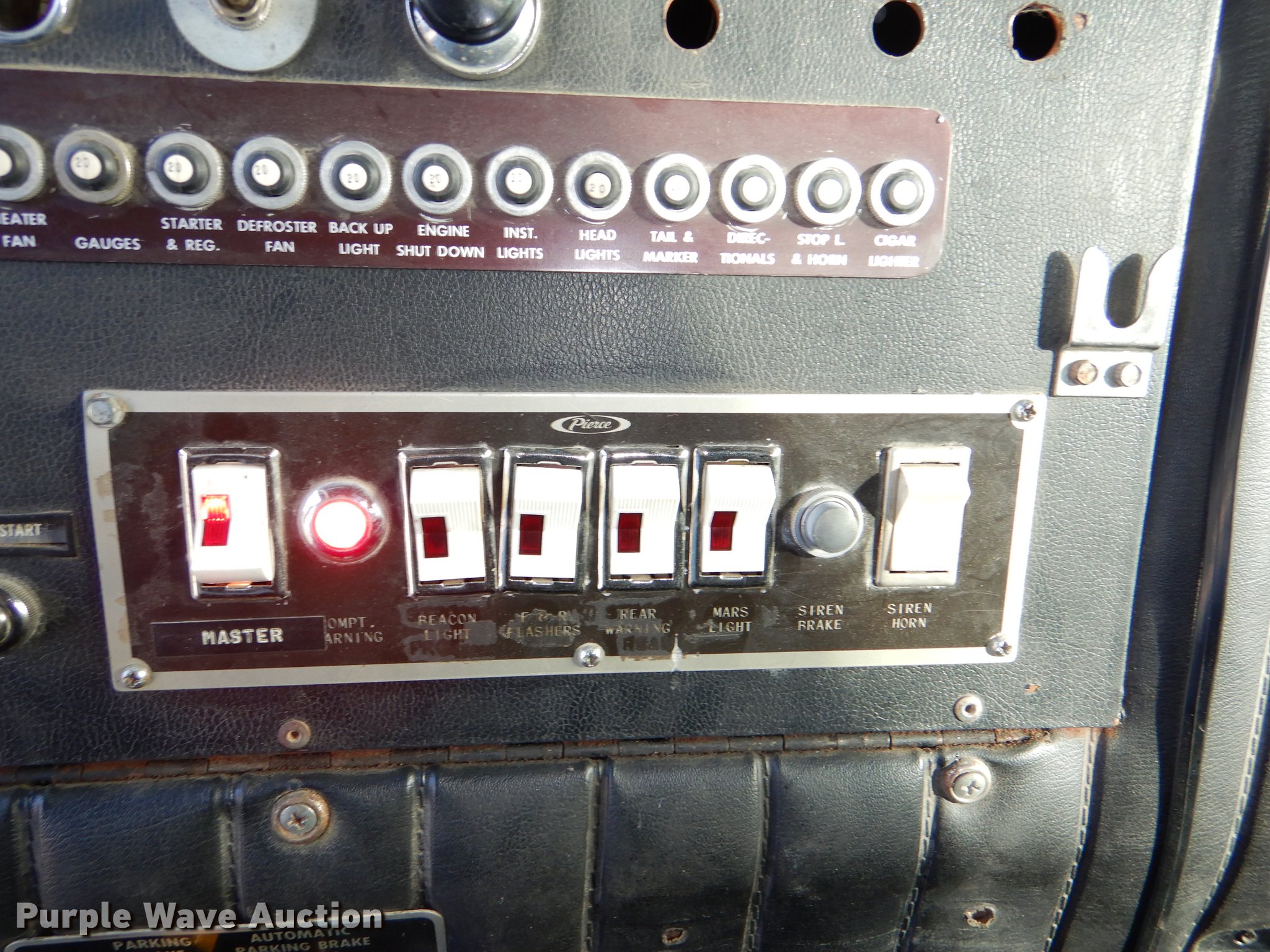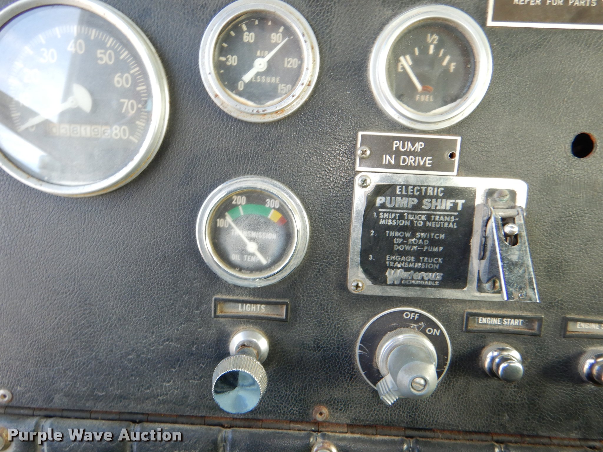 Purple Wave is selling a used Fire Truck or Emergency Vehicle in Kansas. This item is a 1976 Pierce Hendrickson FTCO-2070 fire truck with the following: 38,196 miles on odometer, 1,370 hours on meter, 7.1L V8 diesel engine, 350 HP, Serial 8VA305138, Allison automatic transmission, Single axle, Heat, Emergency lights and sirens, Firecom 3000C intercom system, Waterous electric pump shift switch, 1,500 gallon per minute water gun capacity, Spring suspension, Air brakes, 11R22.5 front tires, 11.00-20 rear tires, GVWR 33,940 lbs, In cab air leak issue, No water gun