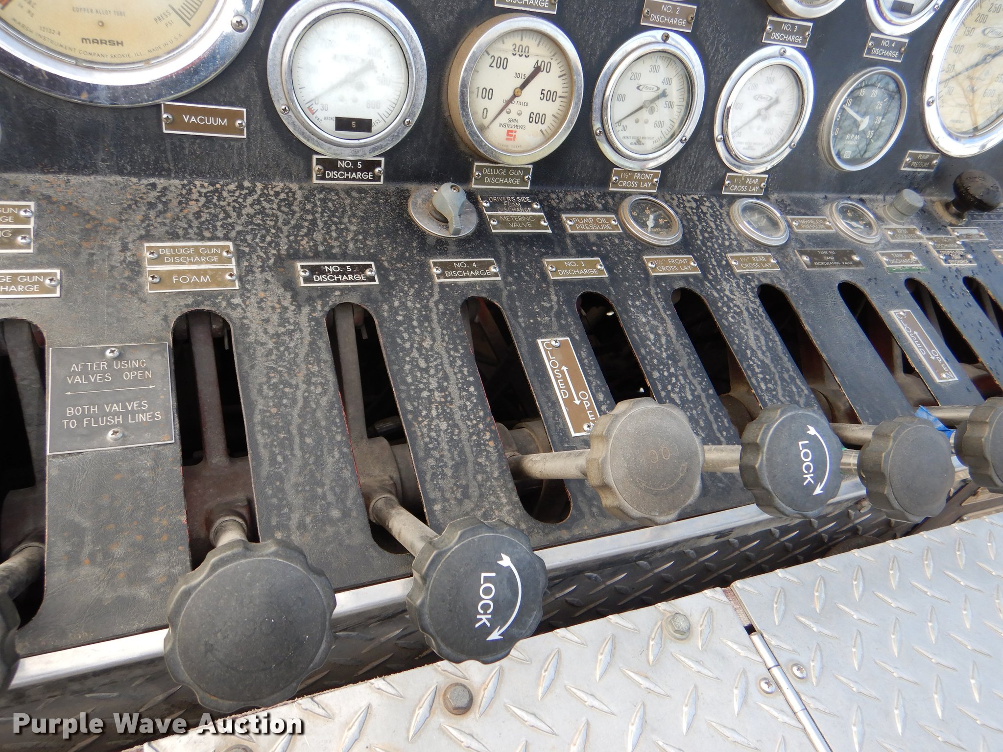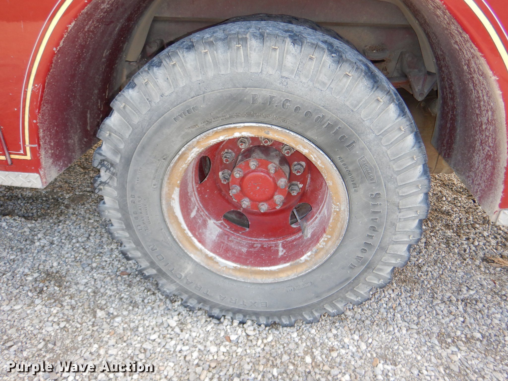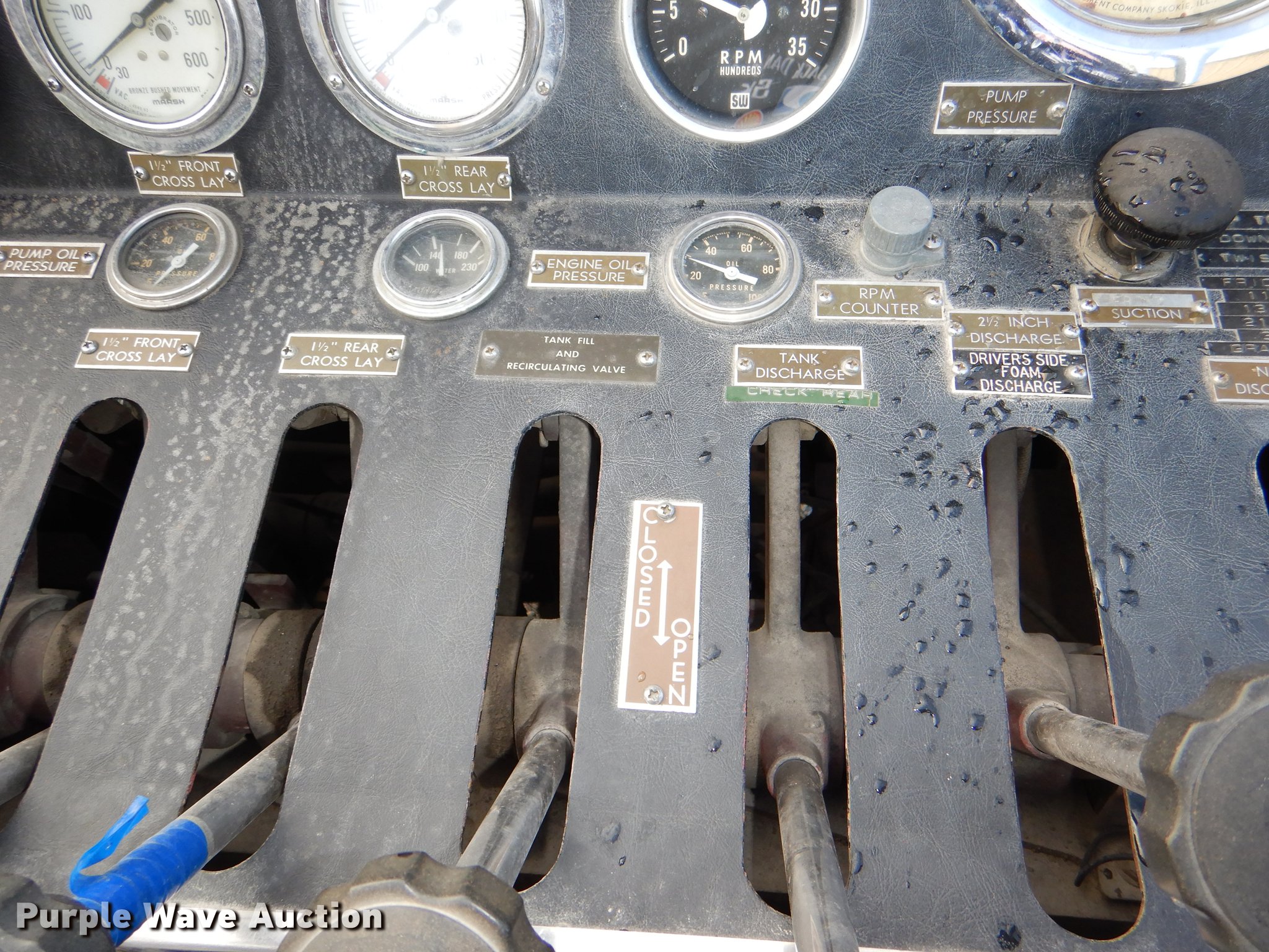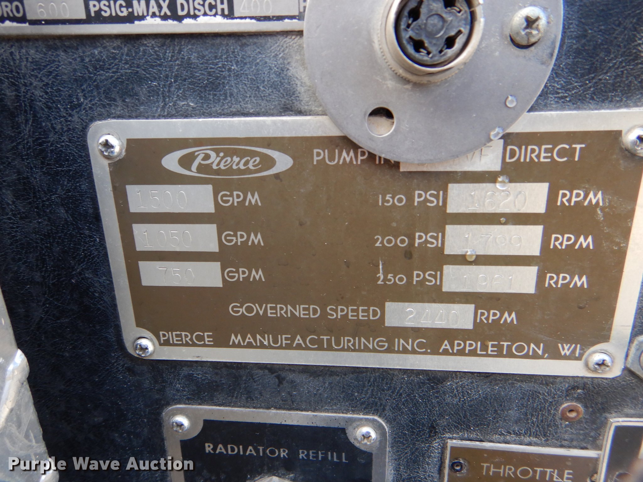 Purple Wave is selling a used Fire Truck or Emergency Vehicle in Kansas. This item is a 1976 Pierce Hendrickson FTCO-2070 fire truck with the following: 38,196 miles on odometer, 1,370 hours on meter, 7.1L V8 diesel engine, 350 HP, Serial 8VA305138, Allison automatic transmission, Single axle, Heat, Emergency lights and sirens, Firecom 3000C intercom system, Waterous electric pump shift switch, 1,500 gallon per minute water gun capacity, Spring suspension, Air brakes, 11R22.5 front tires, 11.00-20 rear tires, GVWR 33,940 lbs, In cab air leak issue, No water gun