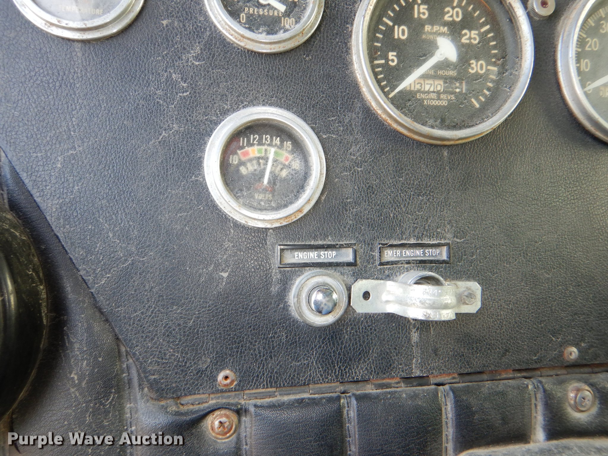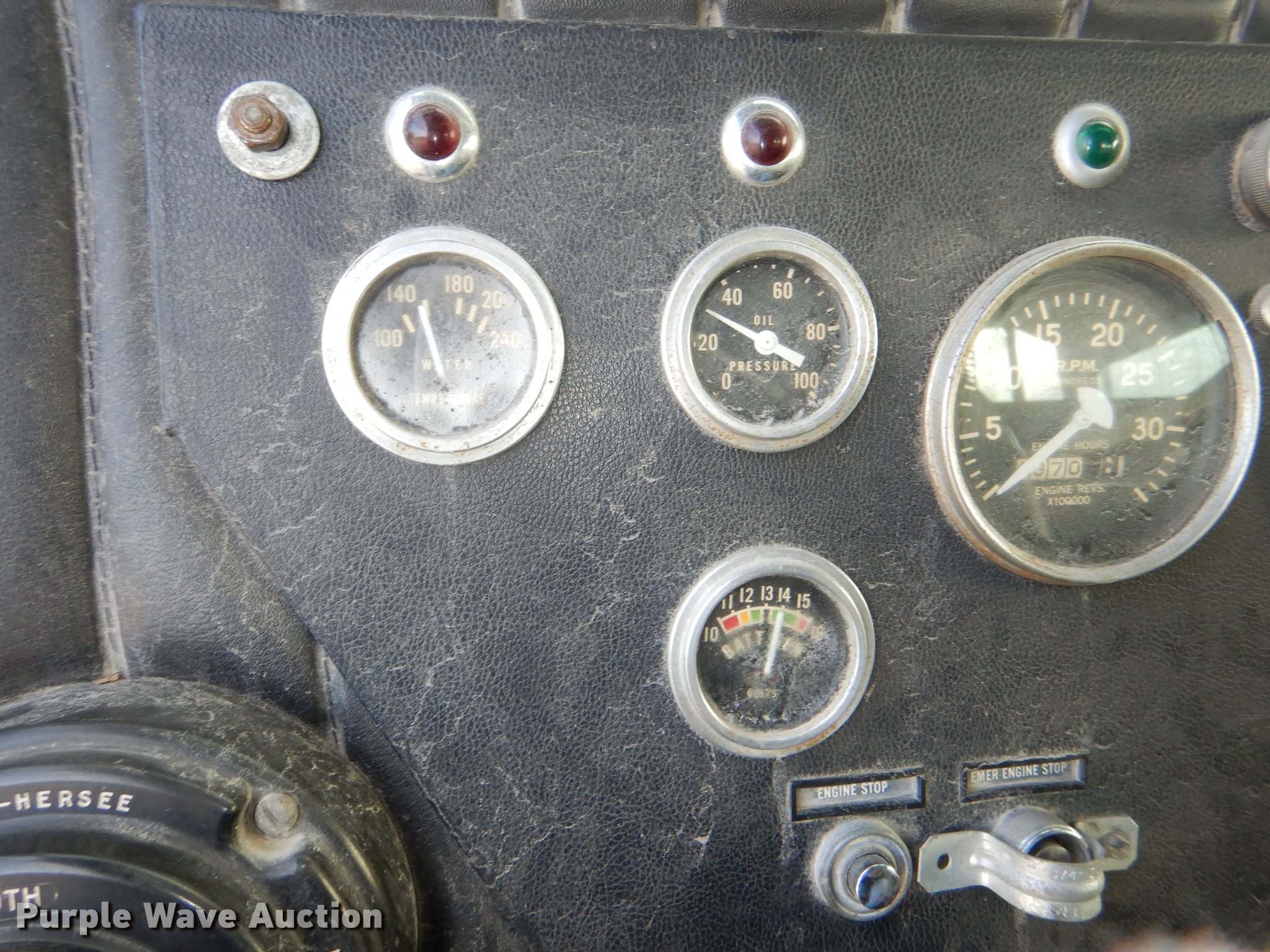 1976 Pierce Hendrickson FTCO-2070 fire truck. 38,196 miles on odometer, 1,370 hours on meter, 7.1L V8 diesel engine 350 HP, Serial 8VA305138, Allison automatic transmission, Single axle, Heat, Emergency lights and sirens, Firecom 3000C intercom system, Waterous electric pump shift switch, 1,500 gallon per minute water gun capacity, Spring suspension, Air brakes, 11R22.5 front tires, 11.00-20 rear tires, GVWR 33,940 lbs, In cab air leak issue, No water gun. Kansas title. 8611C. Pomona, KS 66076