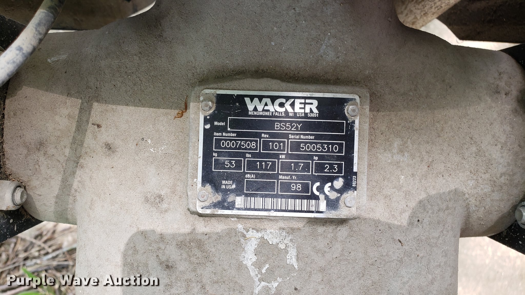 Purple Wave is selling a used Walk Behind Compactor in Missouri. This item is a 1998 Wacker BS52Y plate compactor with the following: Gas engine, 2.3 HP, 13" x 10" plate, Unknown operating condition, Serial 5005310
