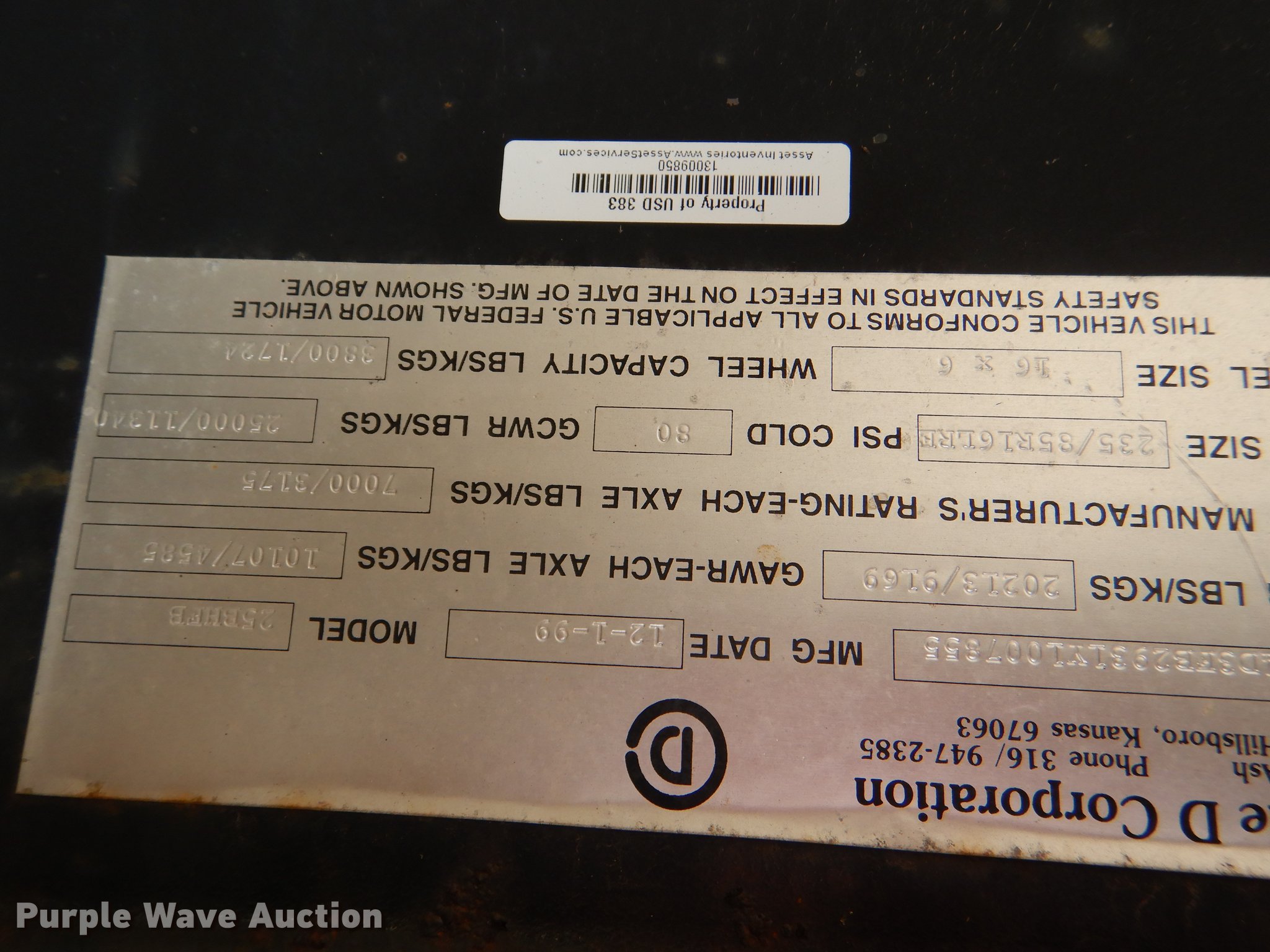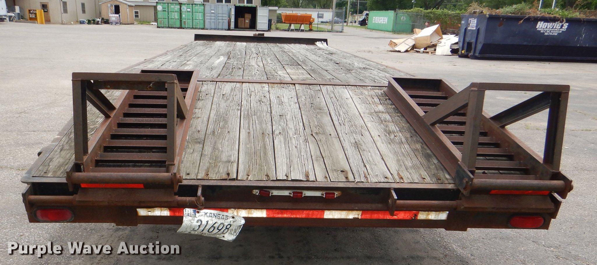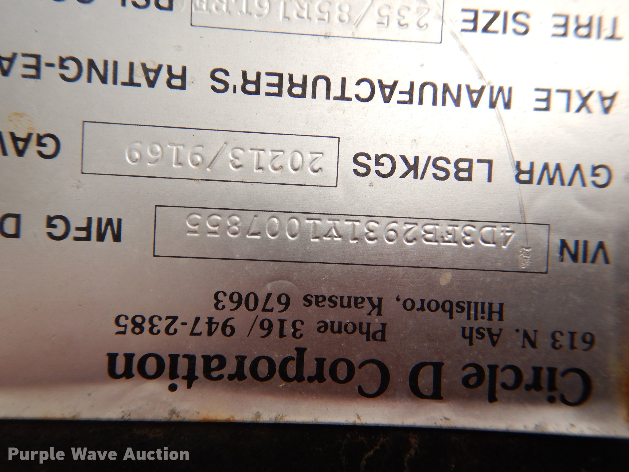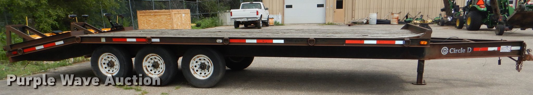Purple Wave is selling a used Equip. Trailer in Kansas. This item is a 2000 Circle D 25BHFB equipment trailer with the following: 31'L overall, 20'L x 99"W wood deck, 5' tail length, 5'L x 17"W ramps, 2 5/16" ball hitch, Jack stand, Triple axle, 235/85R16 tires, GVWR 20,213 lbs