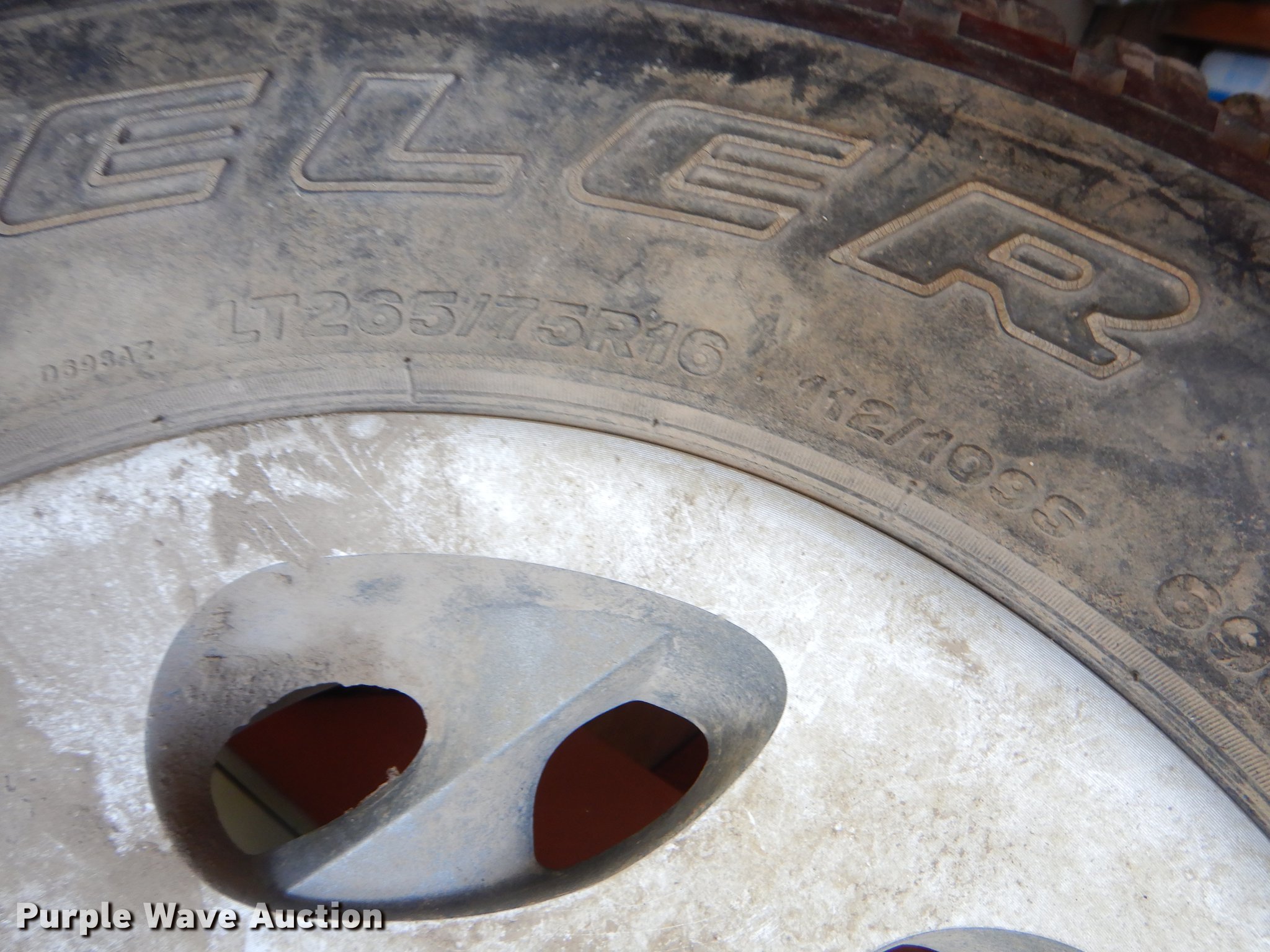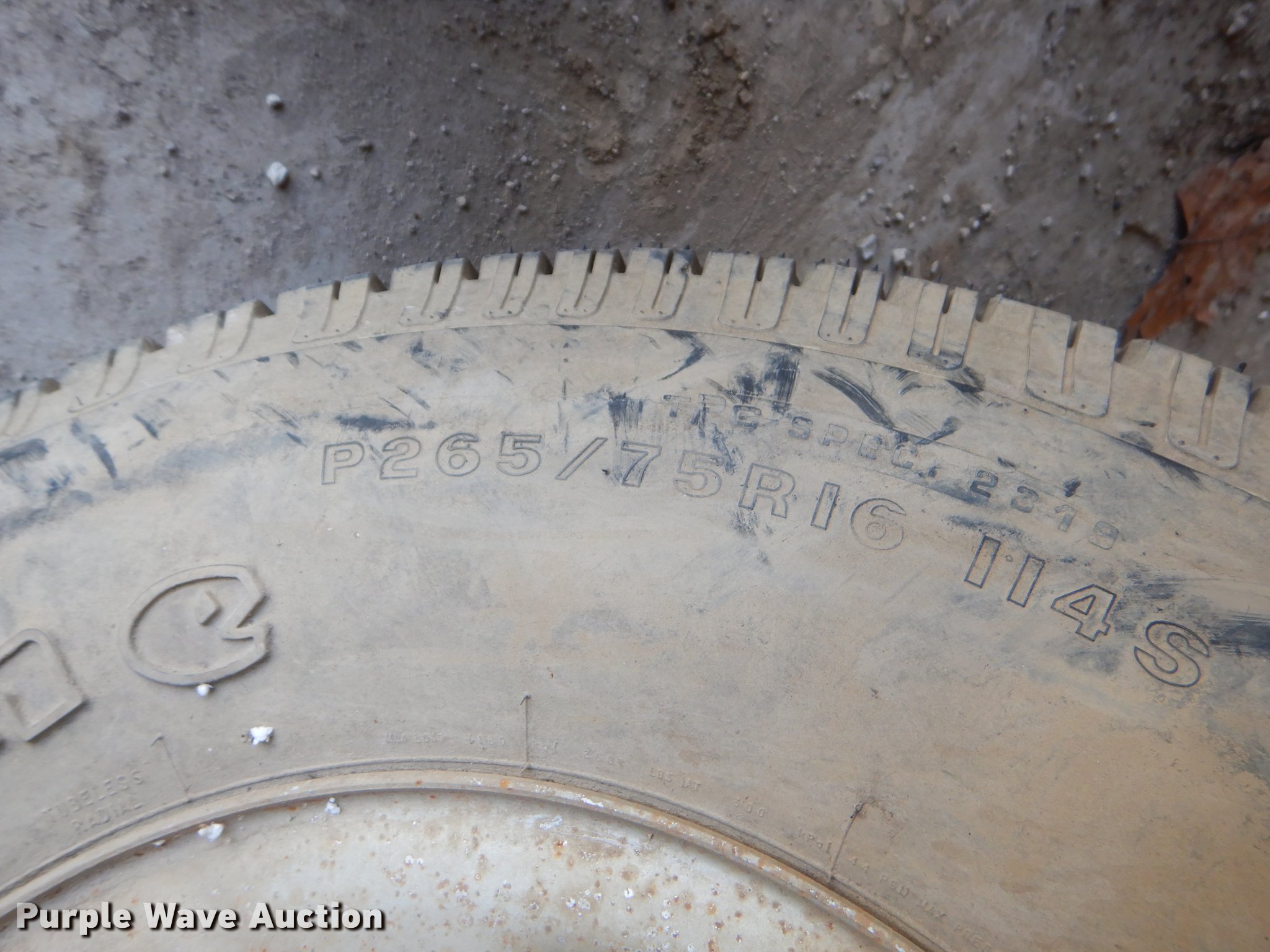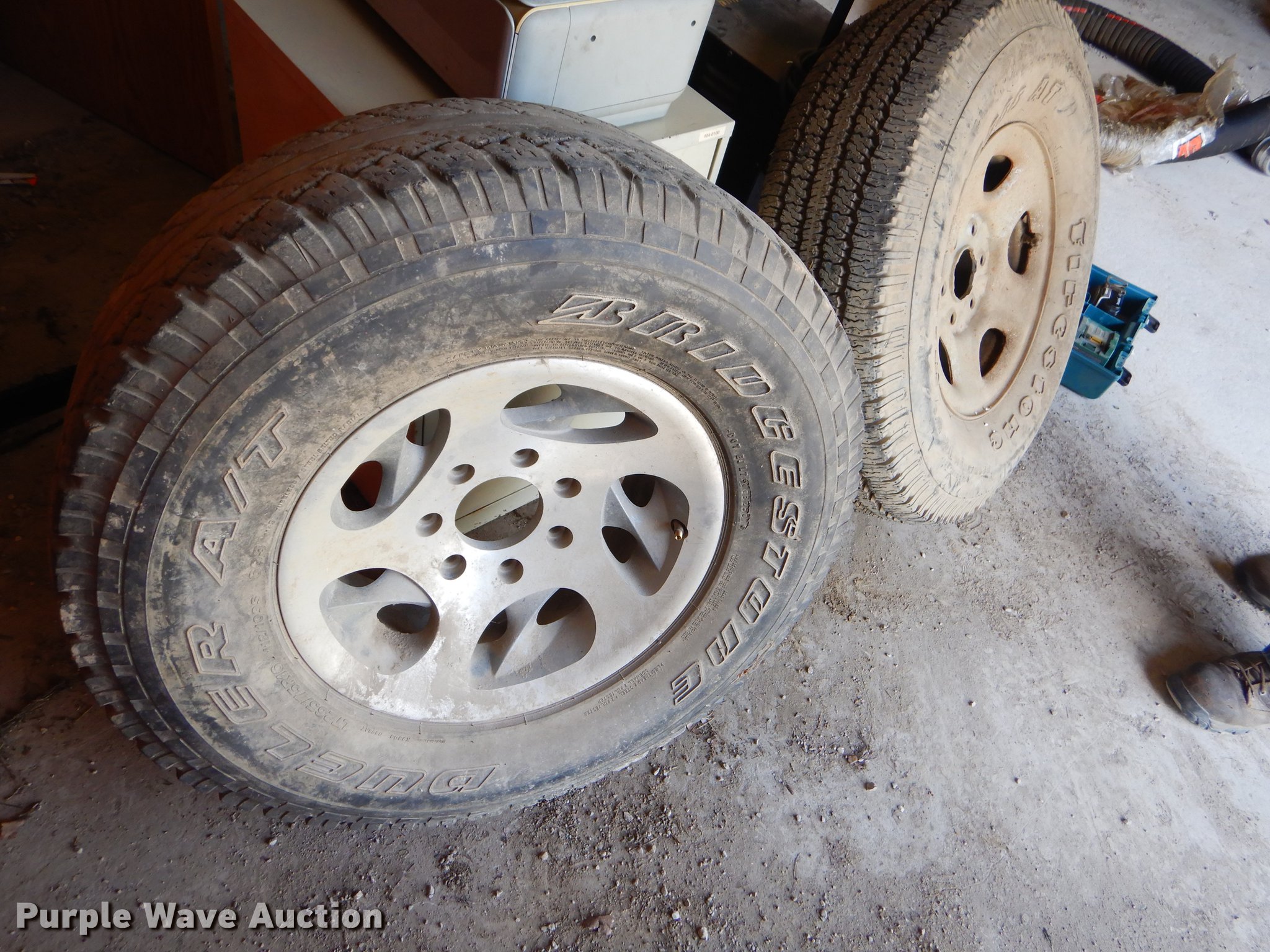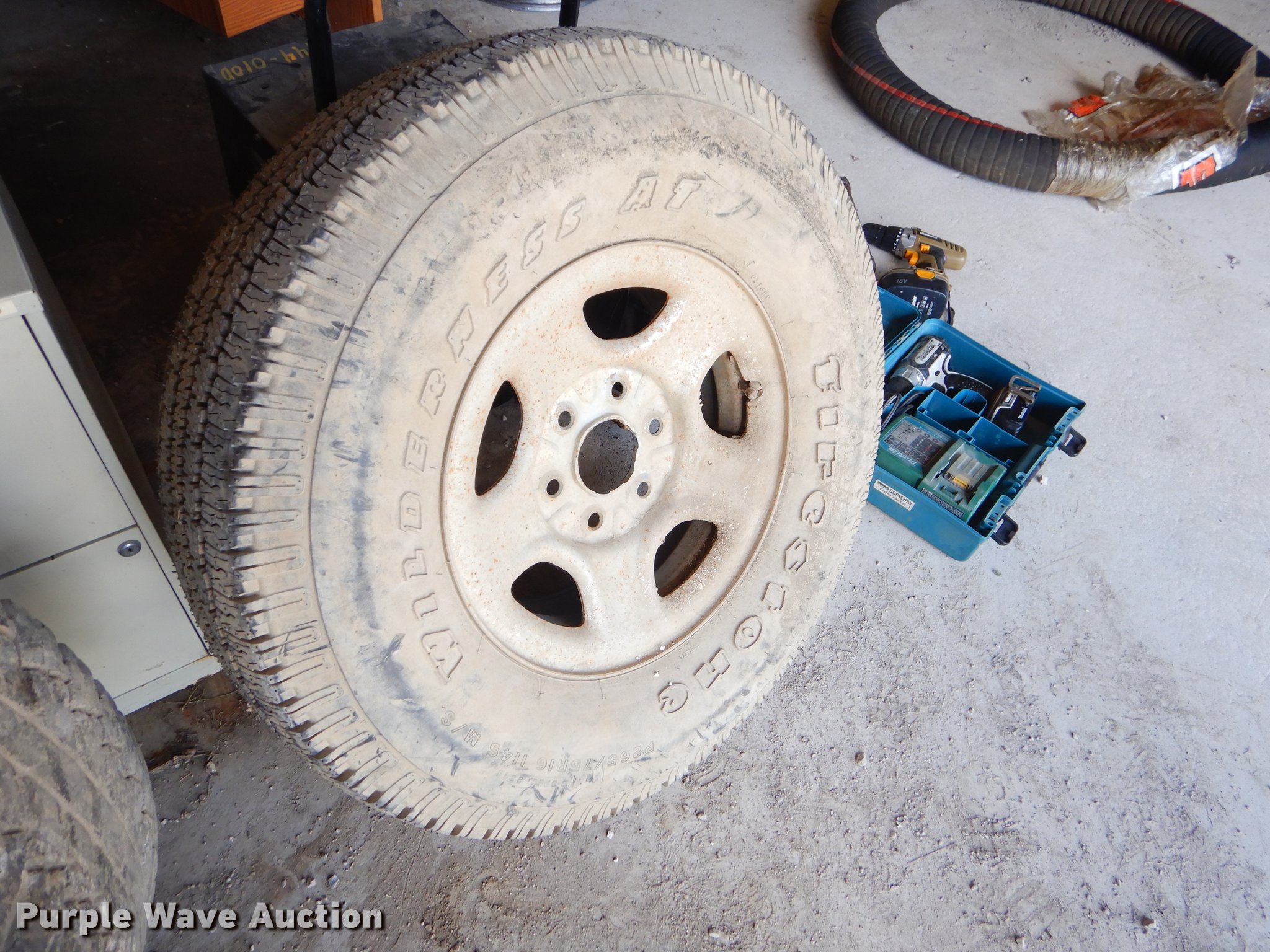 Purple Wave is selling a used Tools in Oklahoma. This item is a Tools with the following: 265/75R16 tire and wheel, (4) six lug aluminum wheels, Schumaker battery charger, Unknown operating condition, 1000 PTO driveline, (2) air grease guns, Grease gun, Makita 18V drill, Unknown operating condition, Shop series 18V drill, Unknown operating condition, (2) 2" high pressure lines, 4" high pressure line