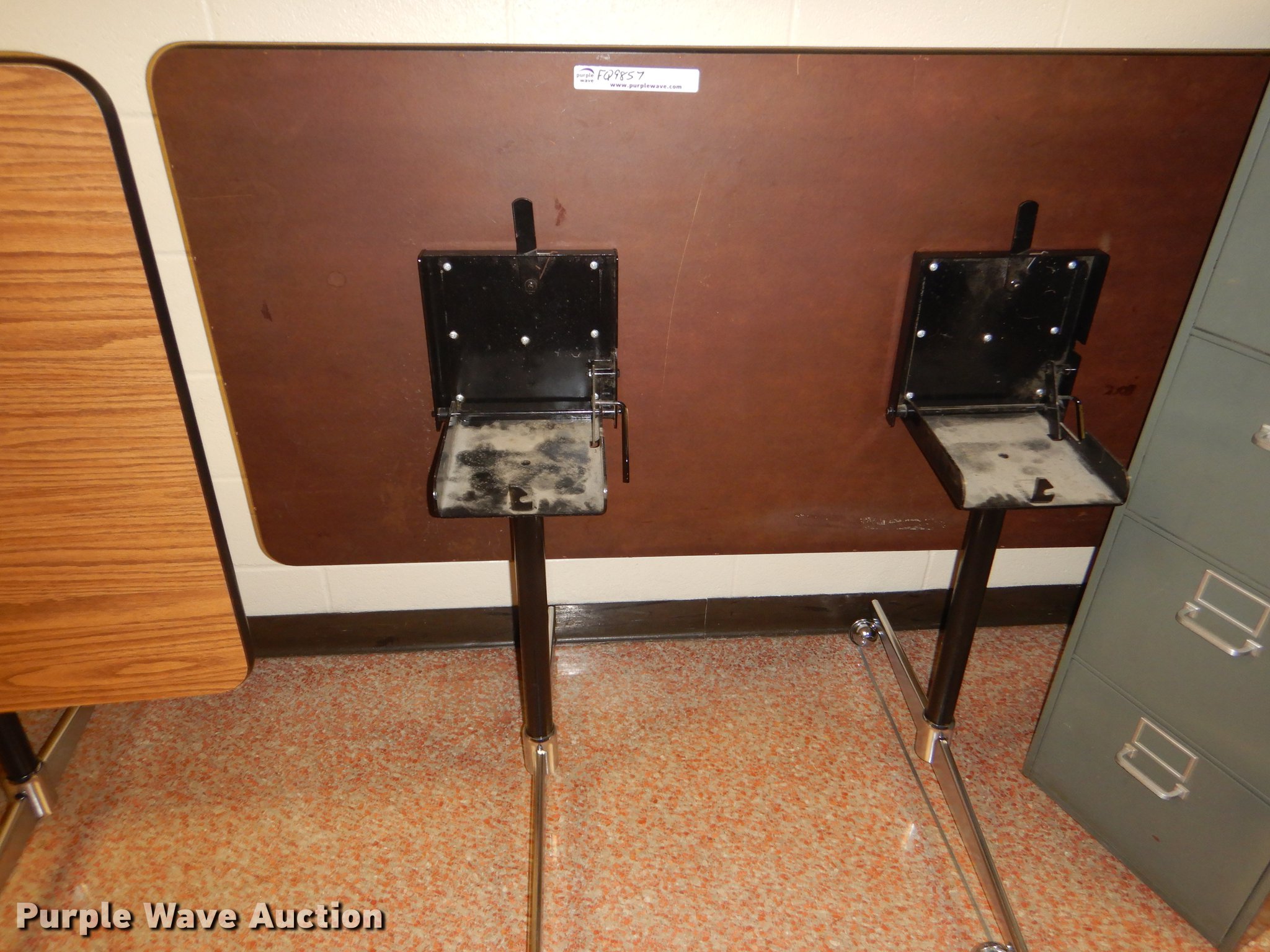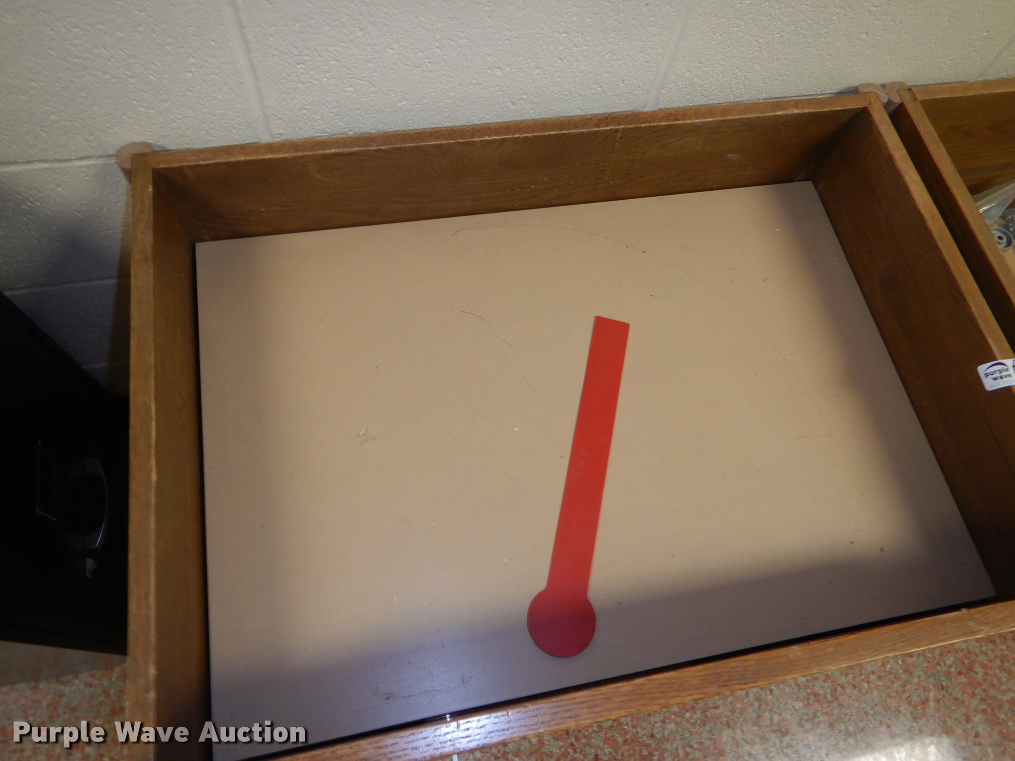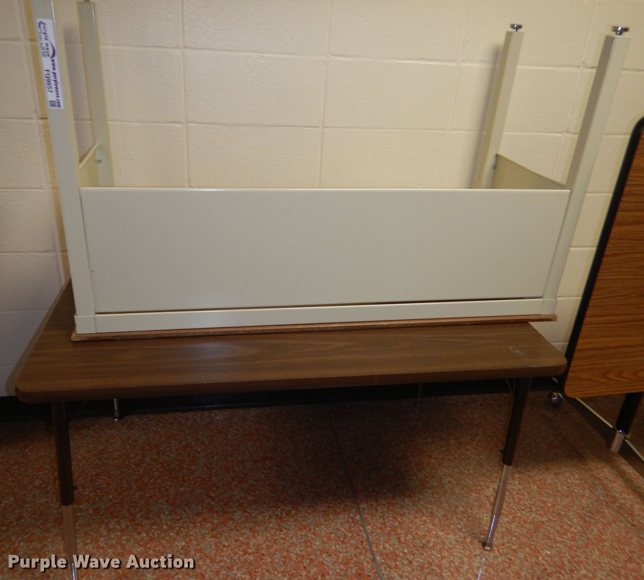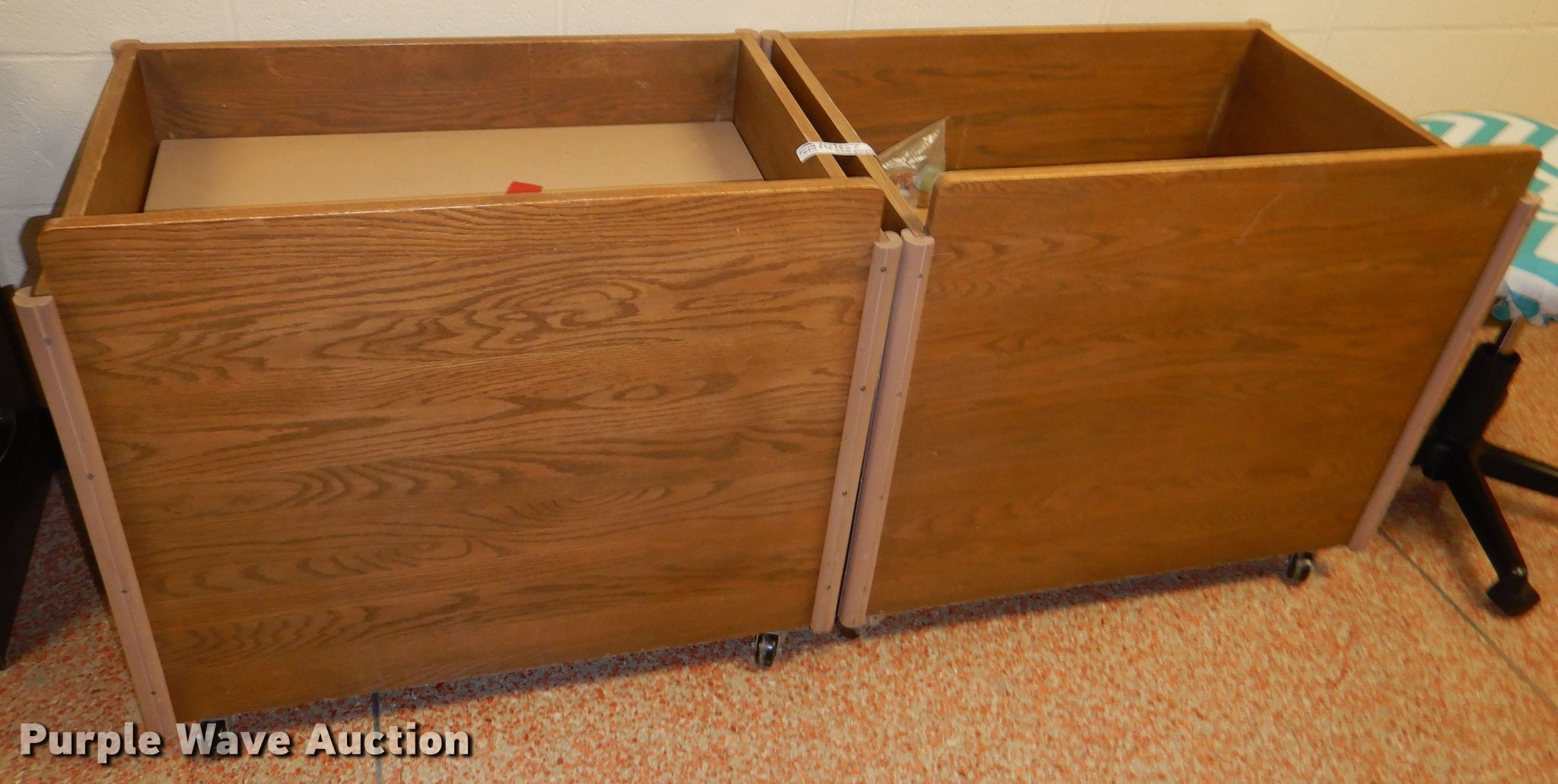 Purple Wave is selling a used Furniture in Kansas. This item is a Furniture with the following: Four drawer file cabinet, (3) two drawer file cabinets, Roll around seat, (2) wood storage bins, Paper tray, (2) fold up tables, 5' x 30", (2) tables