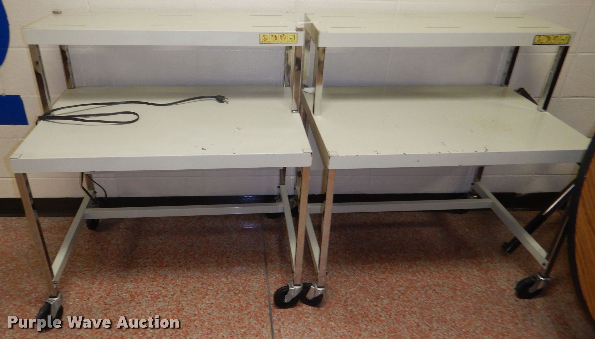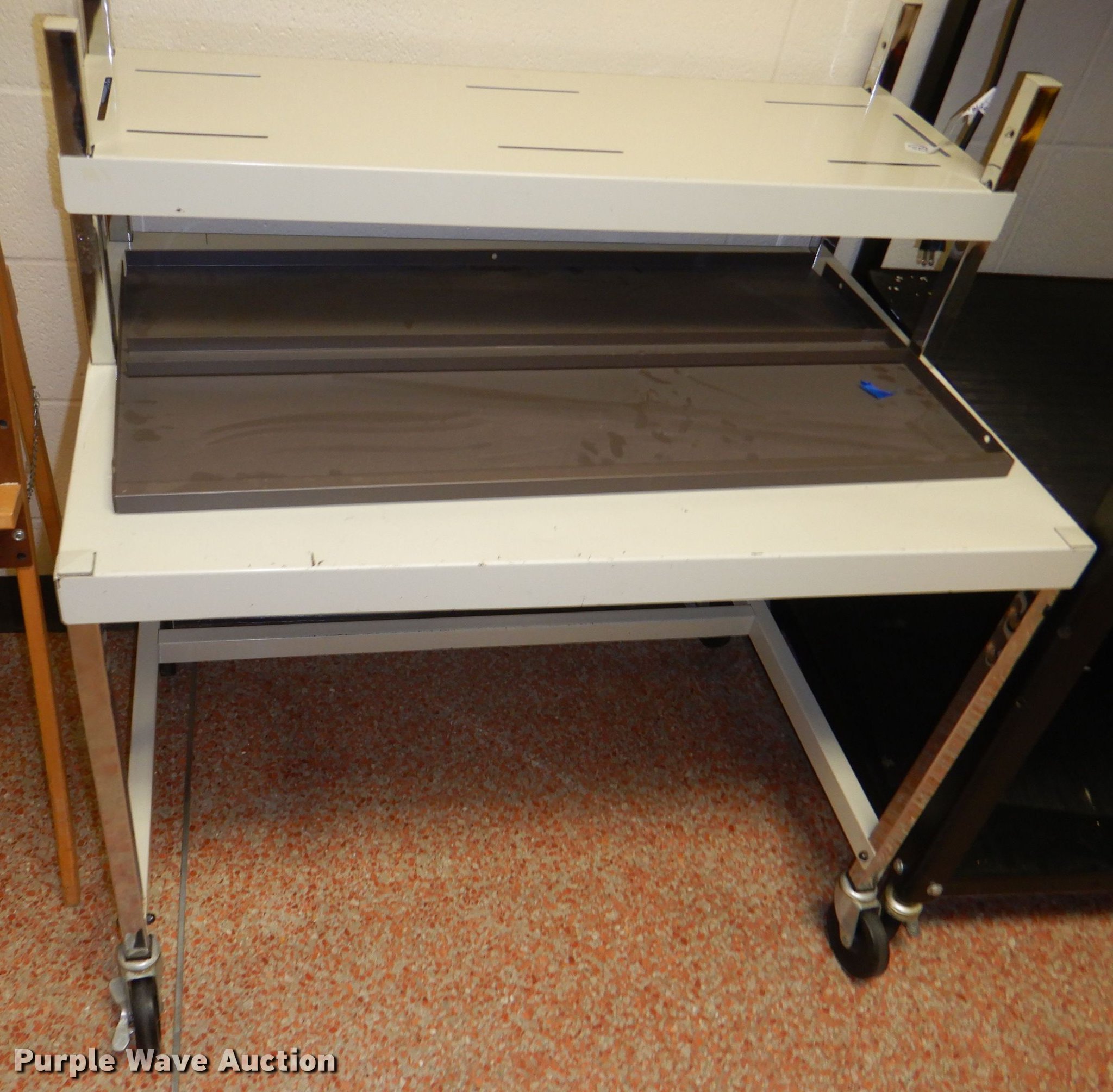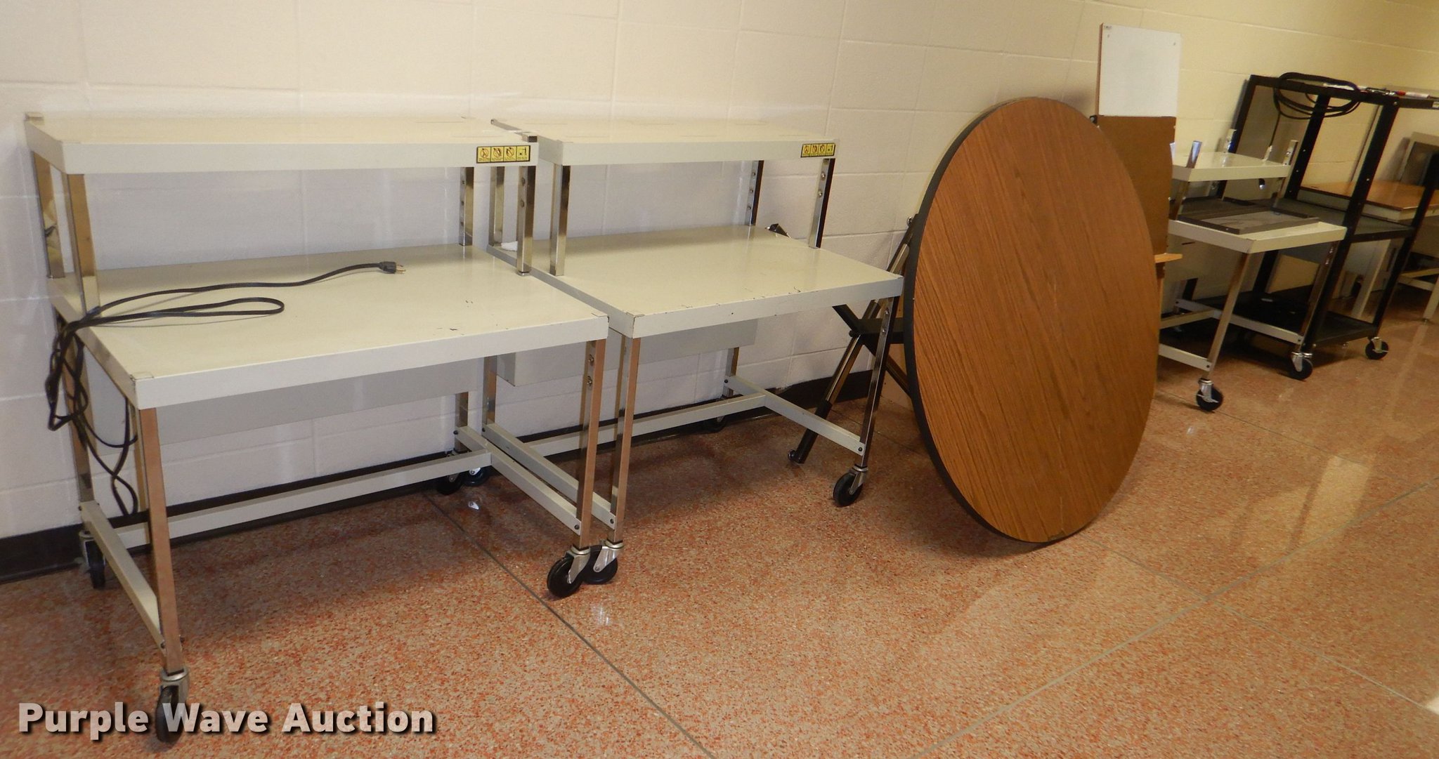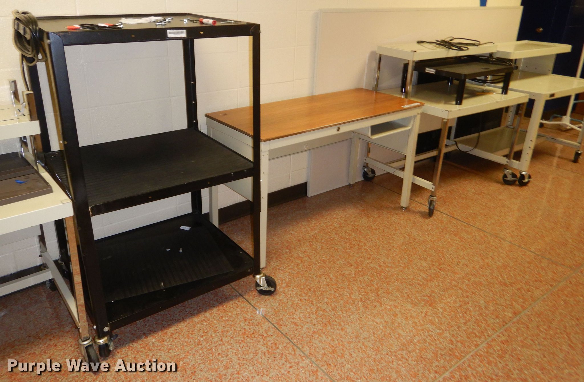 Purple Wave is selling a used Furniture in Kansas. This item is a Furniture with the following: (6) carts, Table, 4" diameter, Two drawer file cabinet, Easel, Desk, (2) wall boards