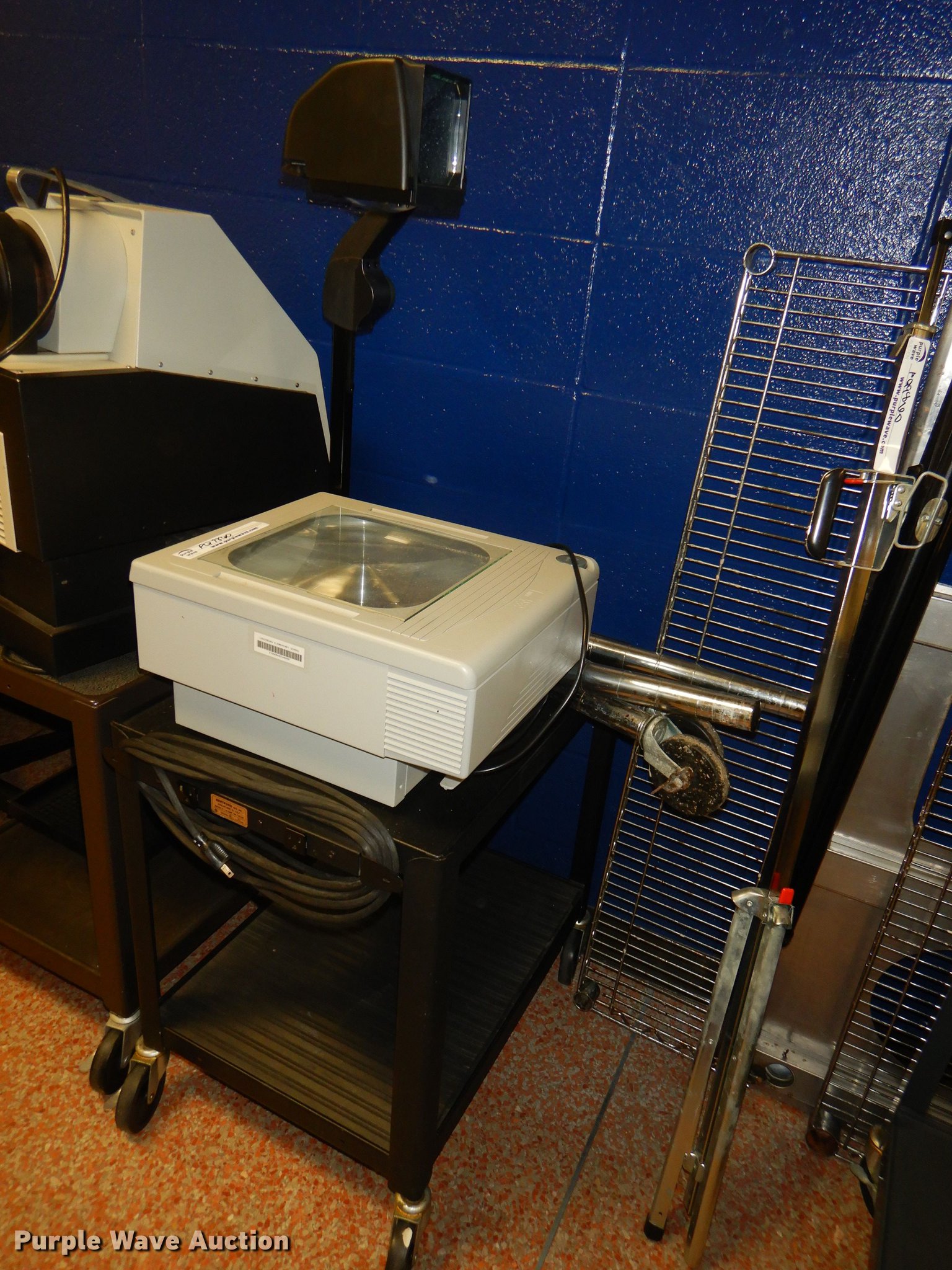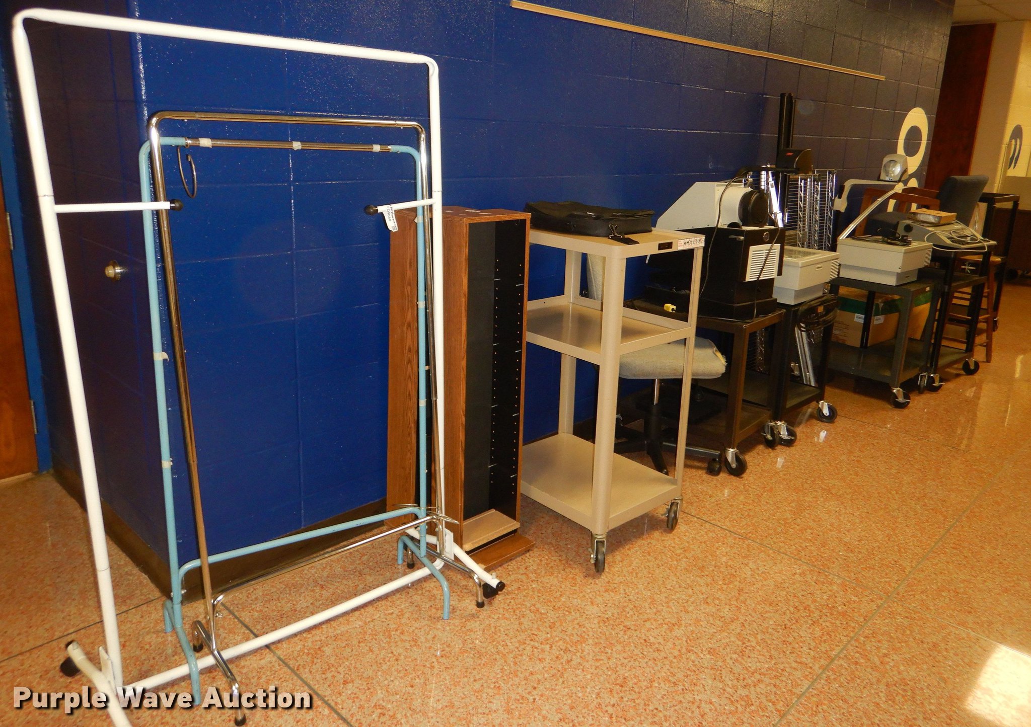 Furniture. (3) curtain dividers, (2) CD stands One base damaged, (6) carts, (2) chairs One damaged, (3) projectors, Typewriter, Stainless steel rack Disassembled, Wood stool. Louisburg, KS 66053