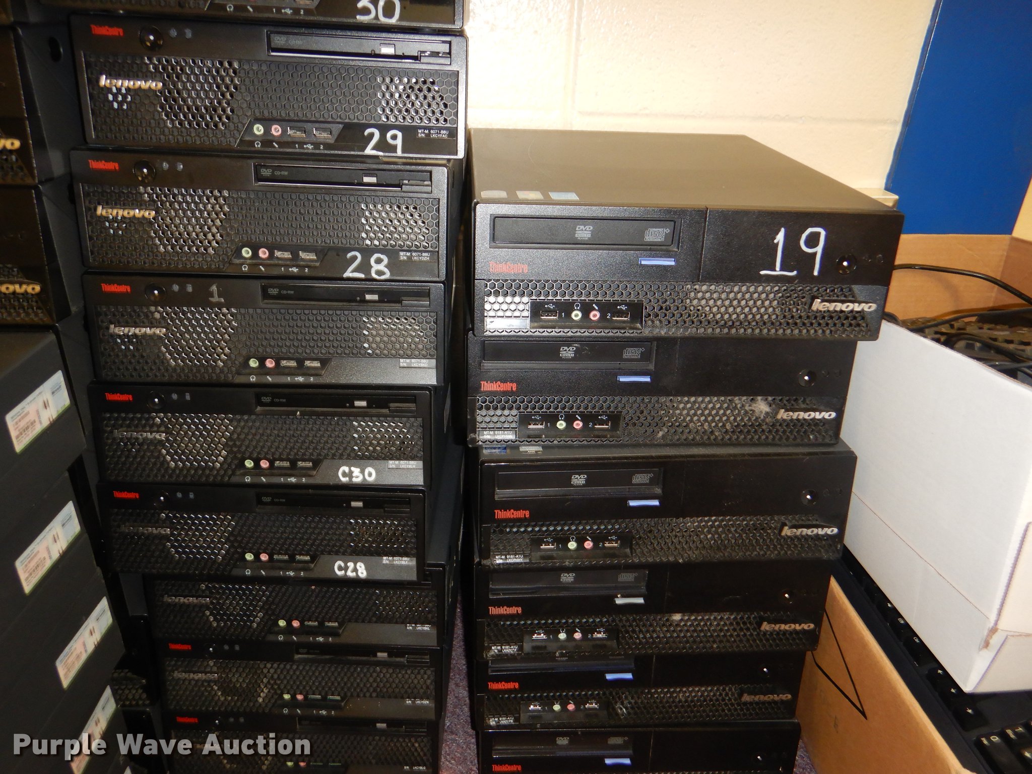 Purple Wave is selling a used Computers in Kansas. This item is a (42) Lenovo ThinkCentre CPUs with the following: Keyboards, Mice, Power cords