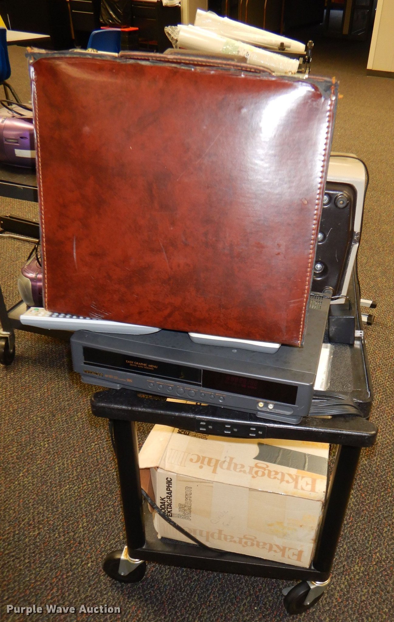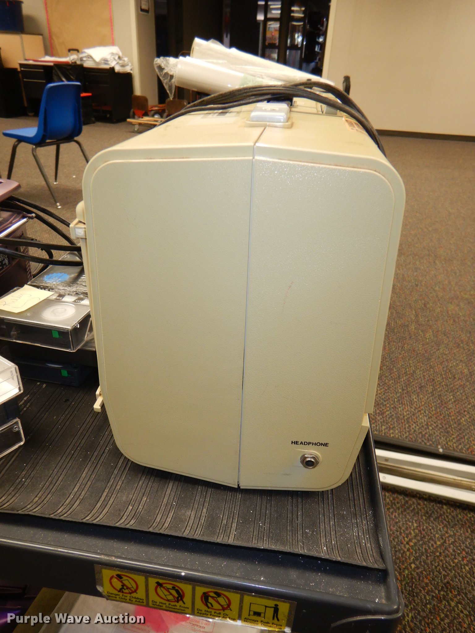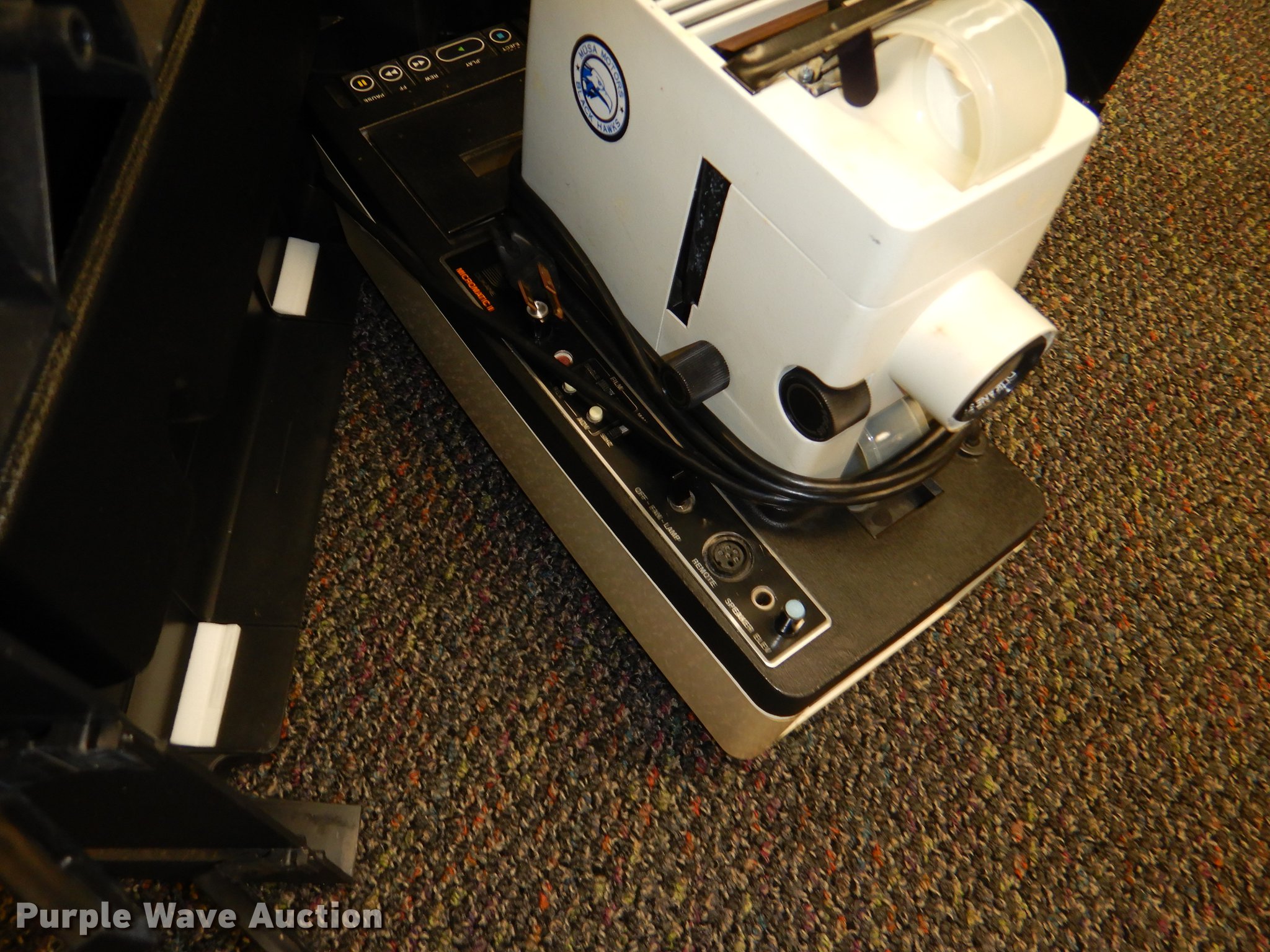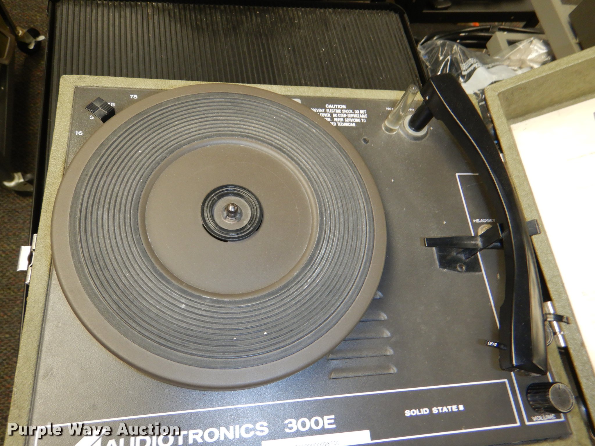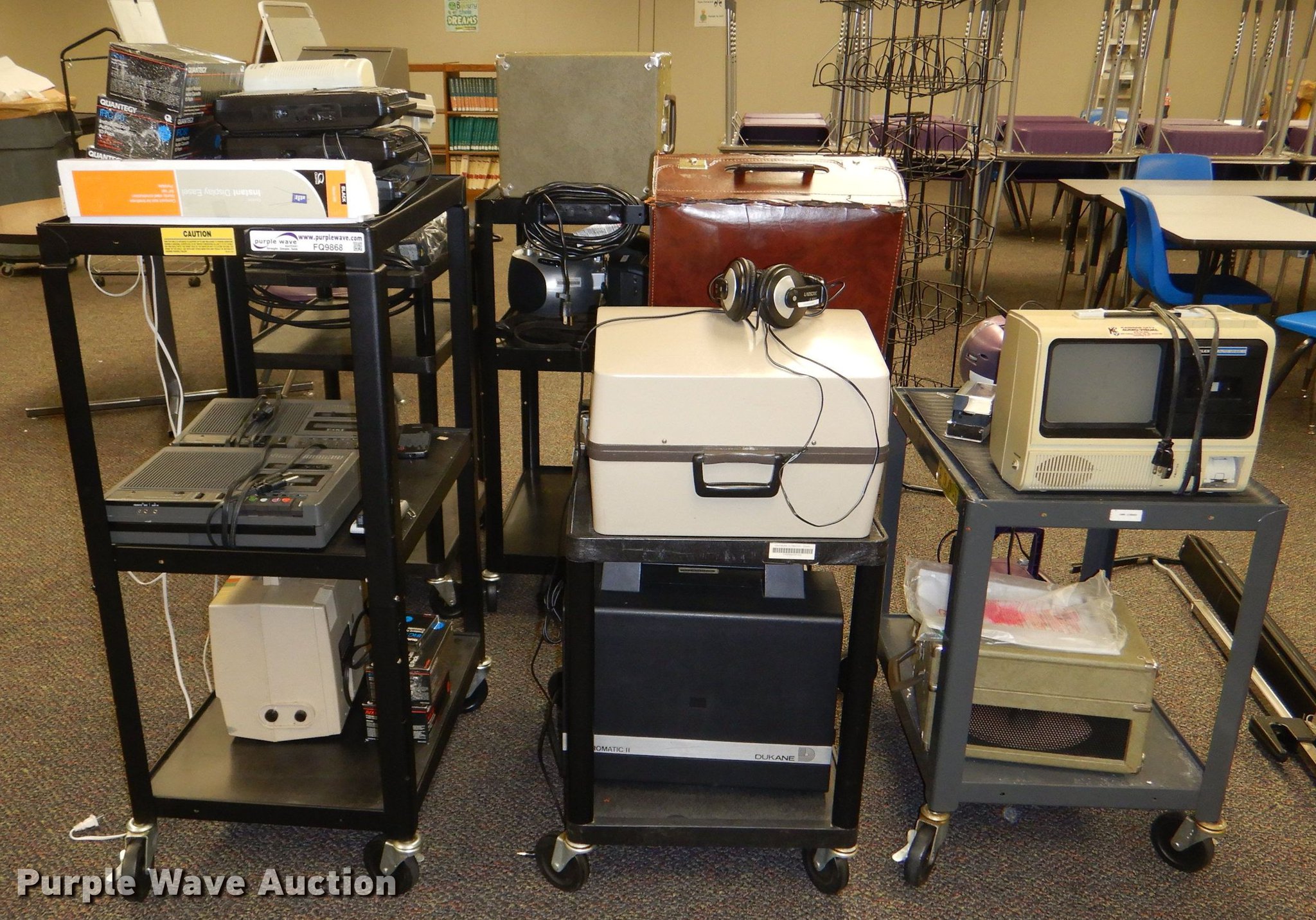 Purple Wave is selling a used Electronics in Kansas. This item is a Electronics with the following: Cassette player, (2) AudioTronics 300E record players, (3) music players, Cassette tapes and players, Projector screen, Easel stand, Singer and Telex Microfische readers, VHS players, Kodiak Ektagraphic III projector, Headphones, Speakers, Leaflet stand and more, Carts not included
