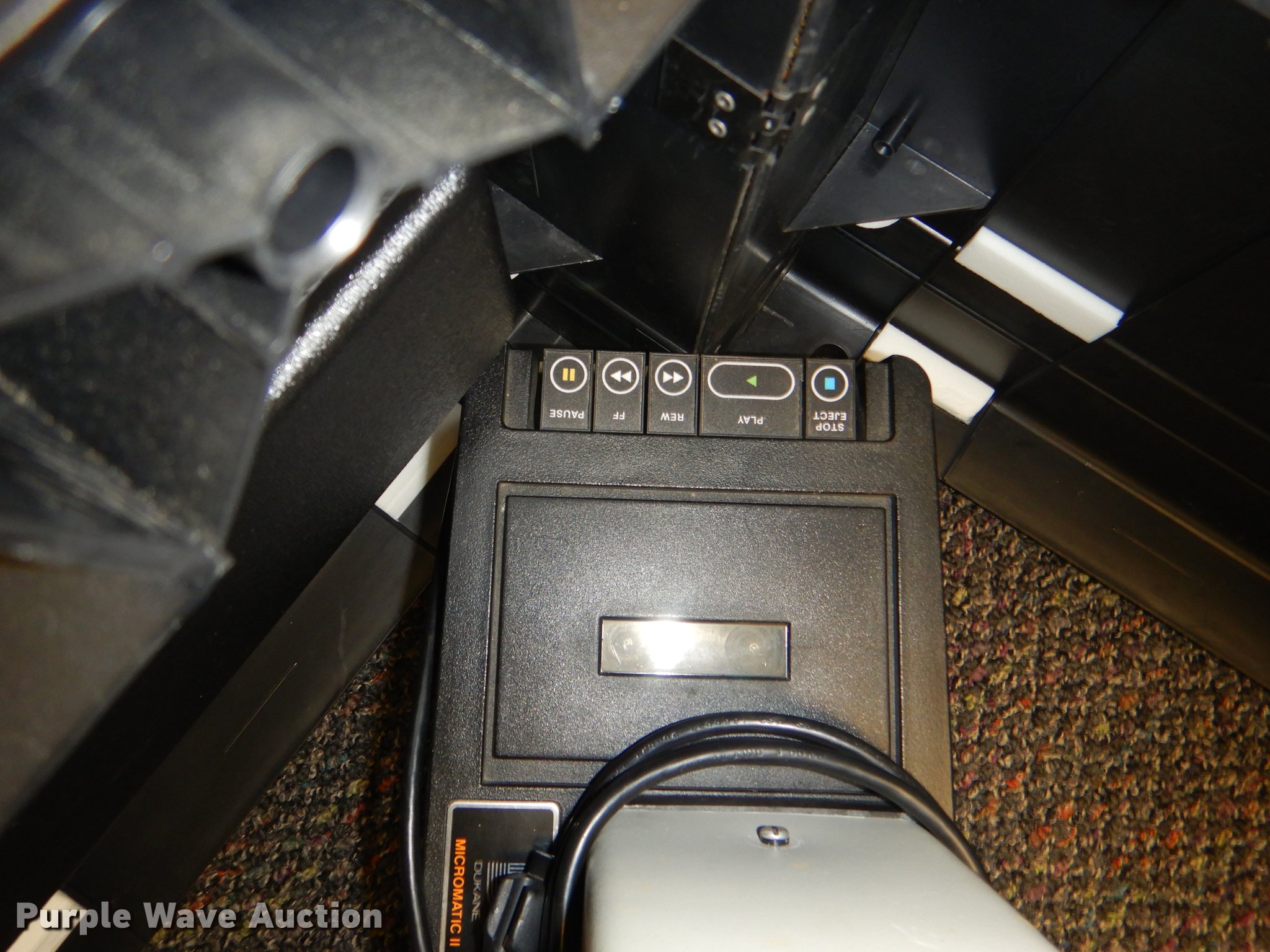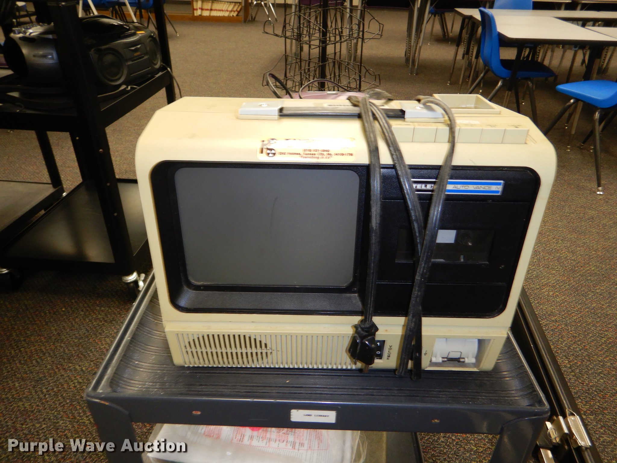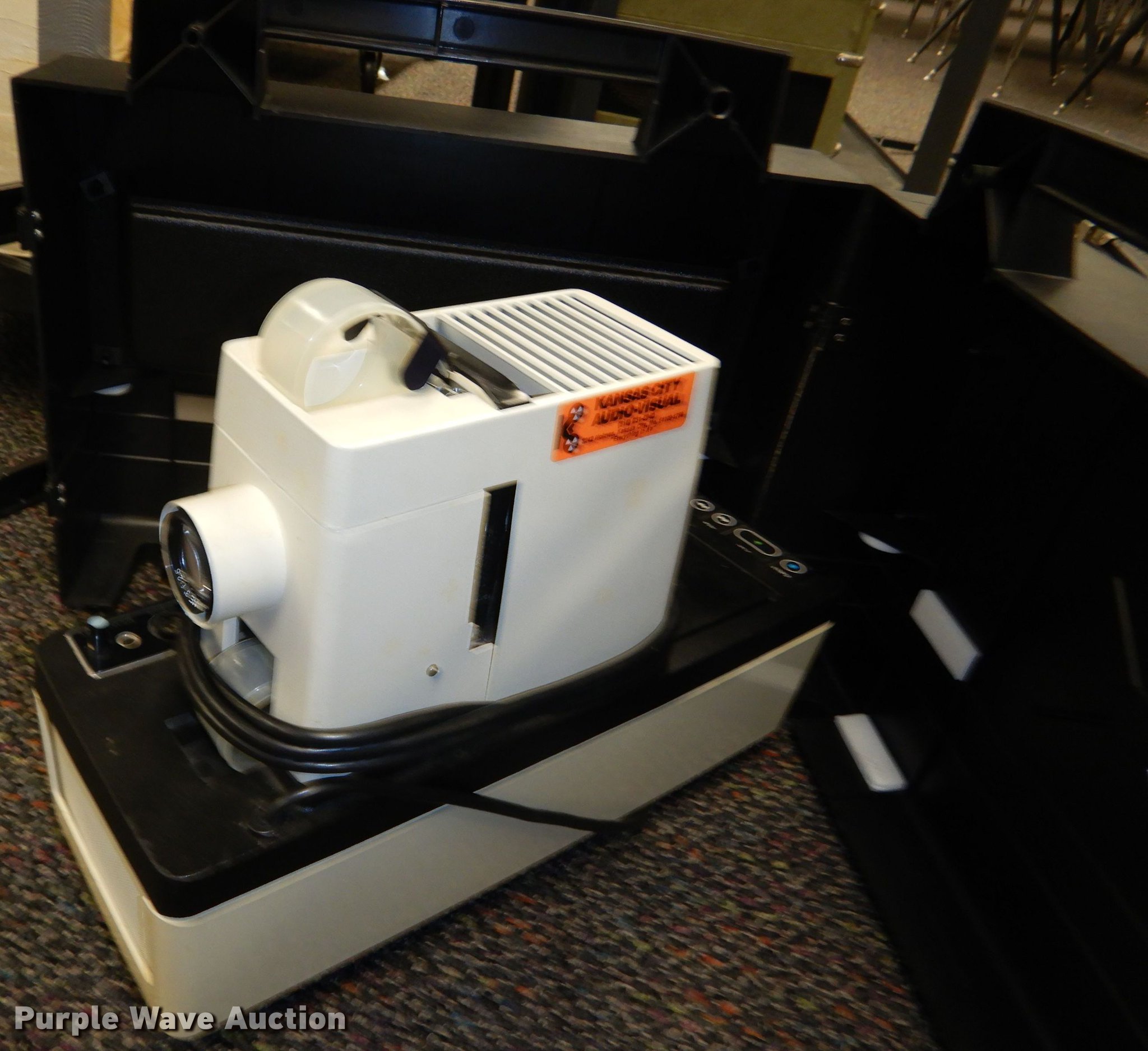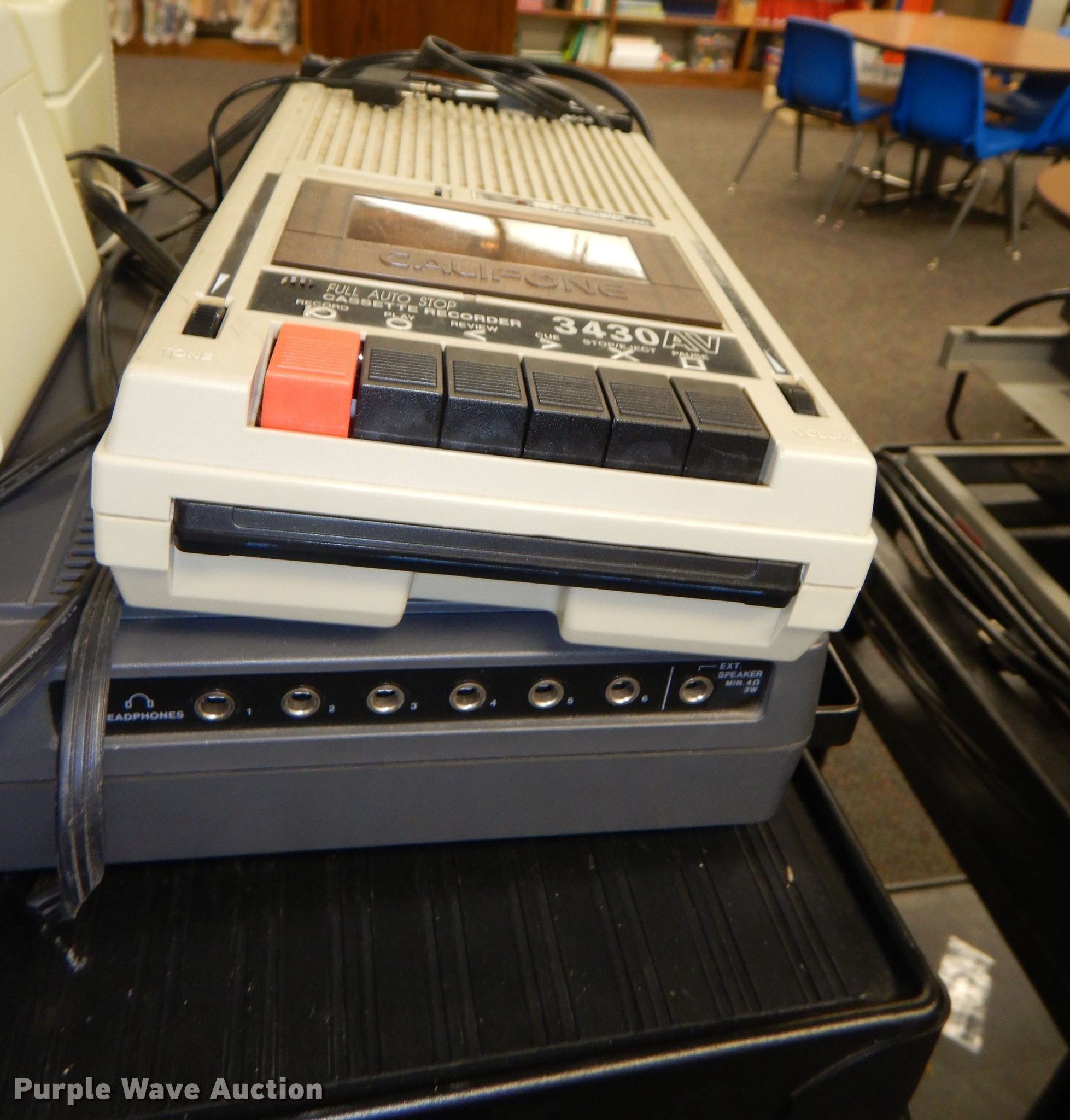 Purple Wave is selling a used Electronics in Kansas. This item is a Electronics with the following: Cassette player, (2) AudioTronics 300E record players, (3) music players, Cassette tapes and players, Projector screen, Easel stand, Singer and Telex Microfische readers, VHS players, Kodiak Ektagraphic III projector, Headphones, Speakers, Leaflet stand and more, Carts not included