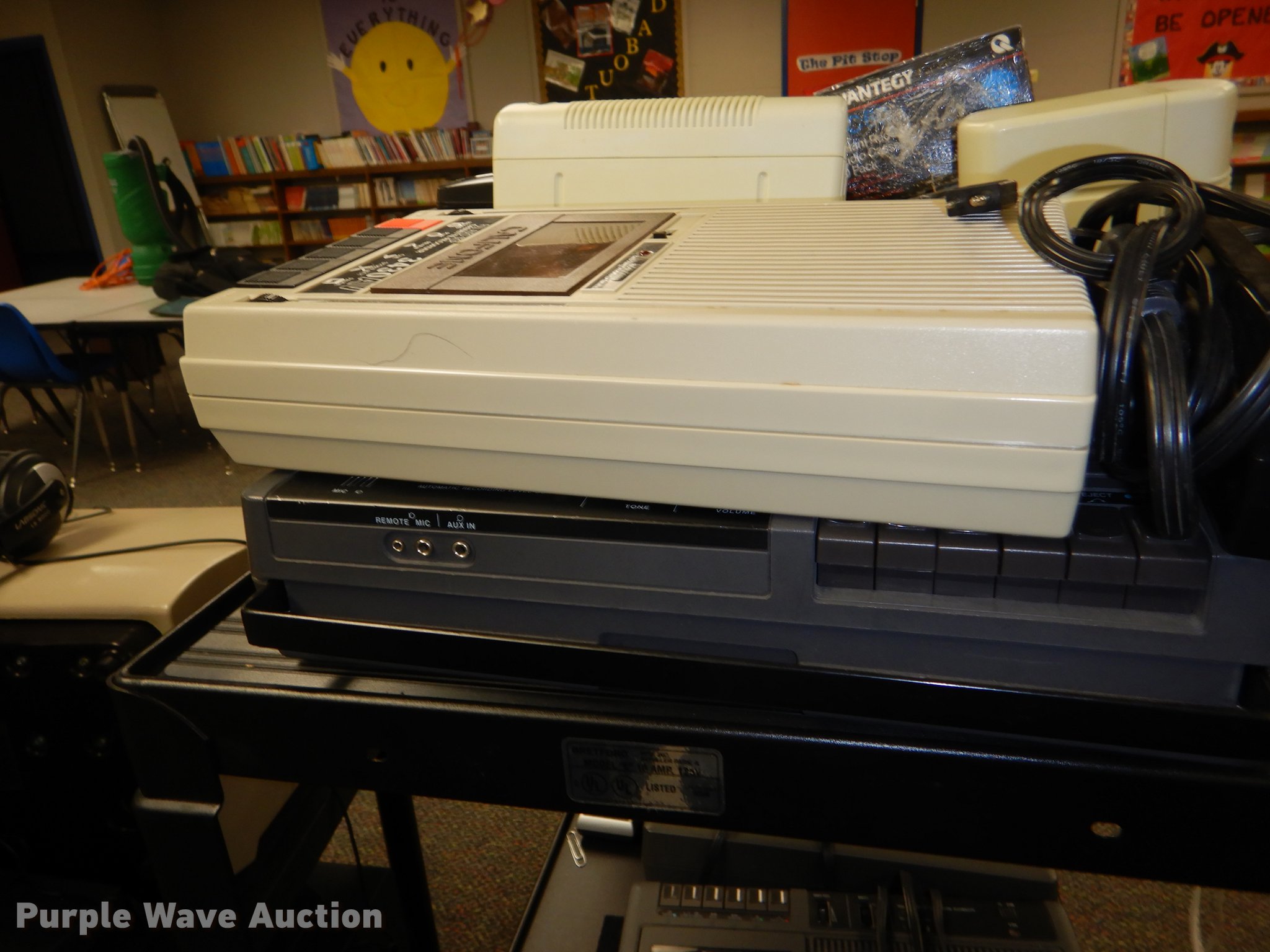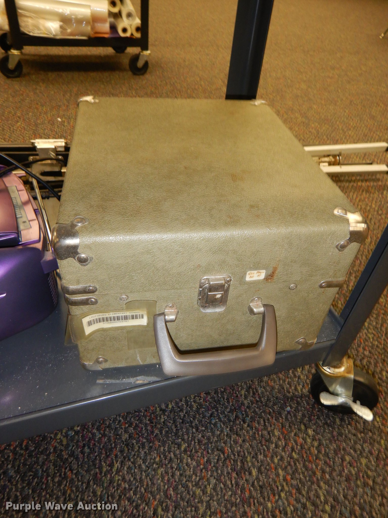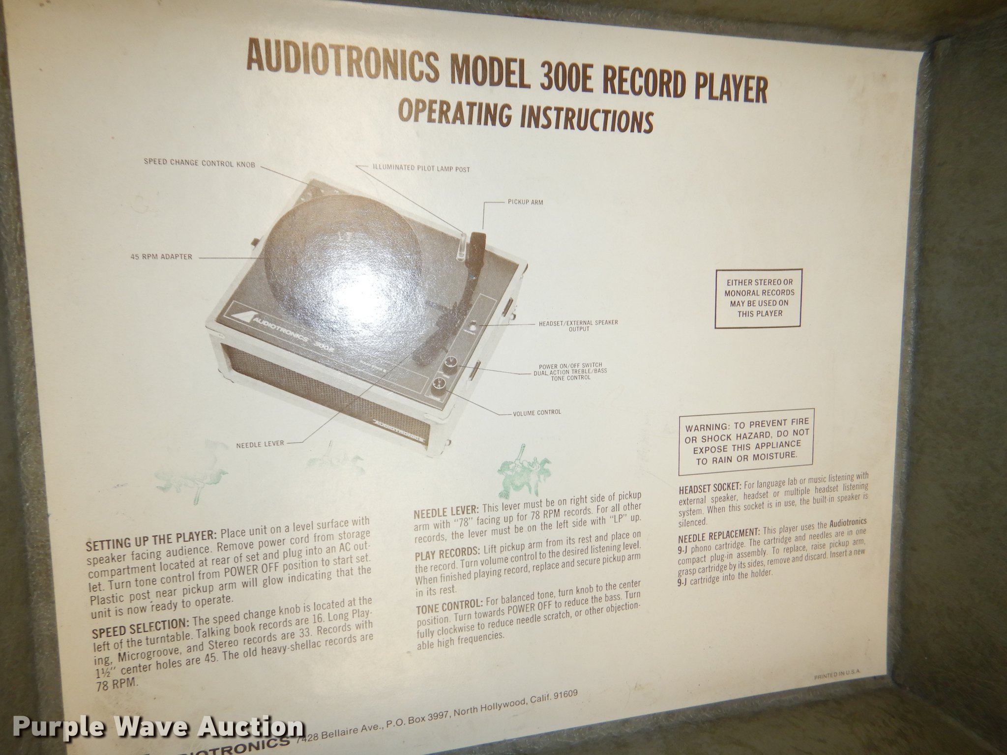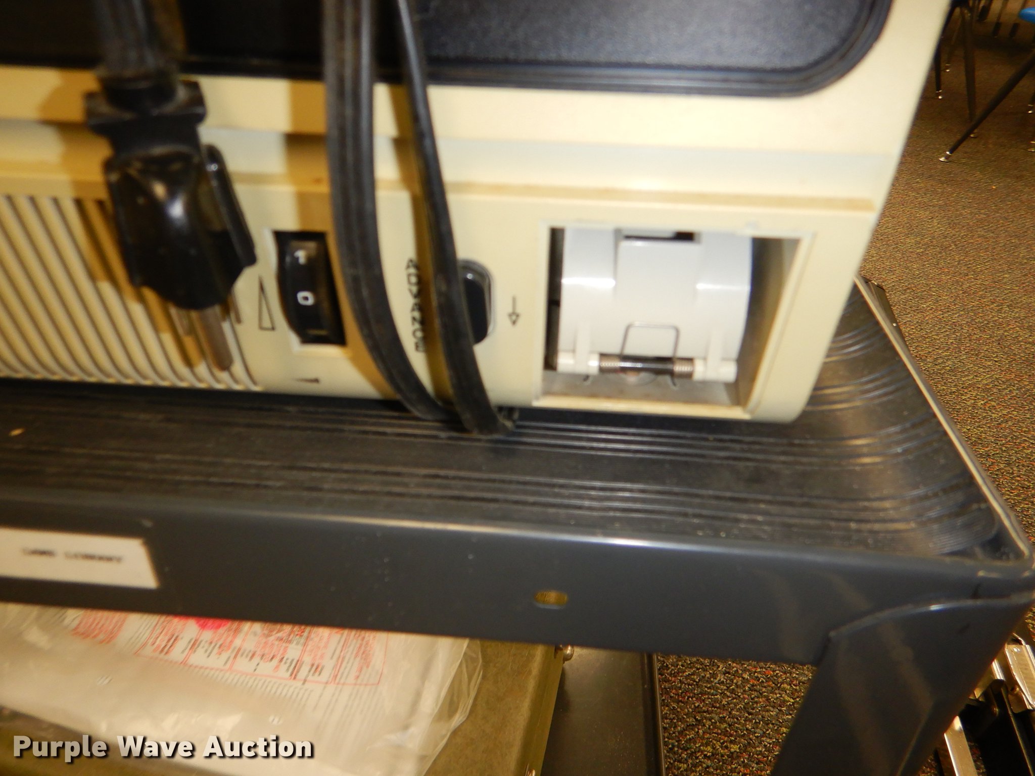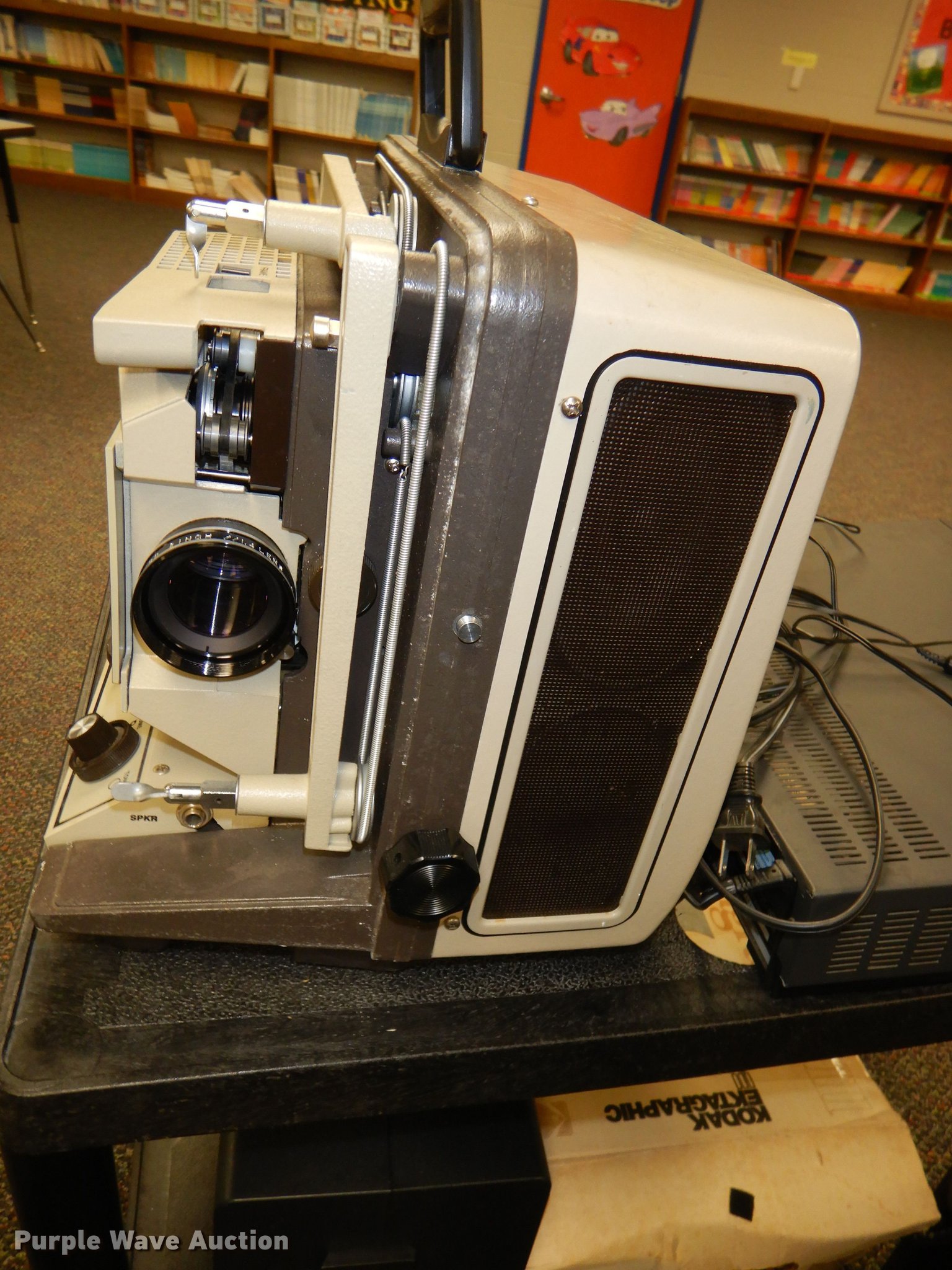 Purple Wave is selling a used Electronics in Kansas. This item is a Electronics with the following: Cassette player, (2) AudioTronics 300E record players, (3) music players, Cassette tapes and players, Projector screen, Easel stand, Singer and Telex Microfische readers, VHS players, Kodiak Ektagraphic III projector, Headphones, Speakers, Leaflet stand and more, Carts not included