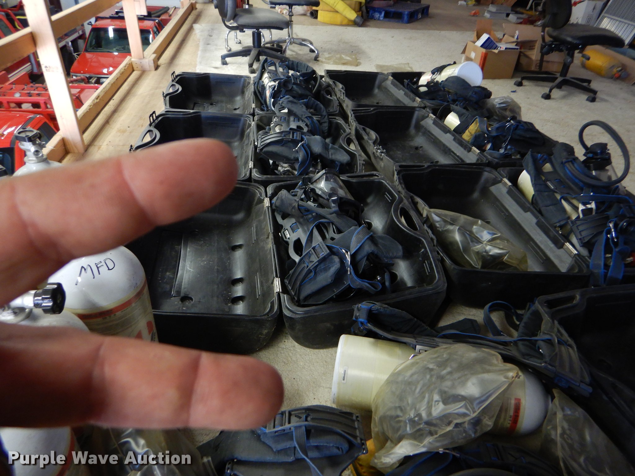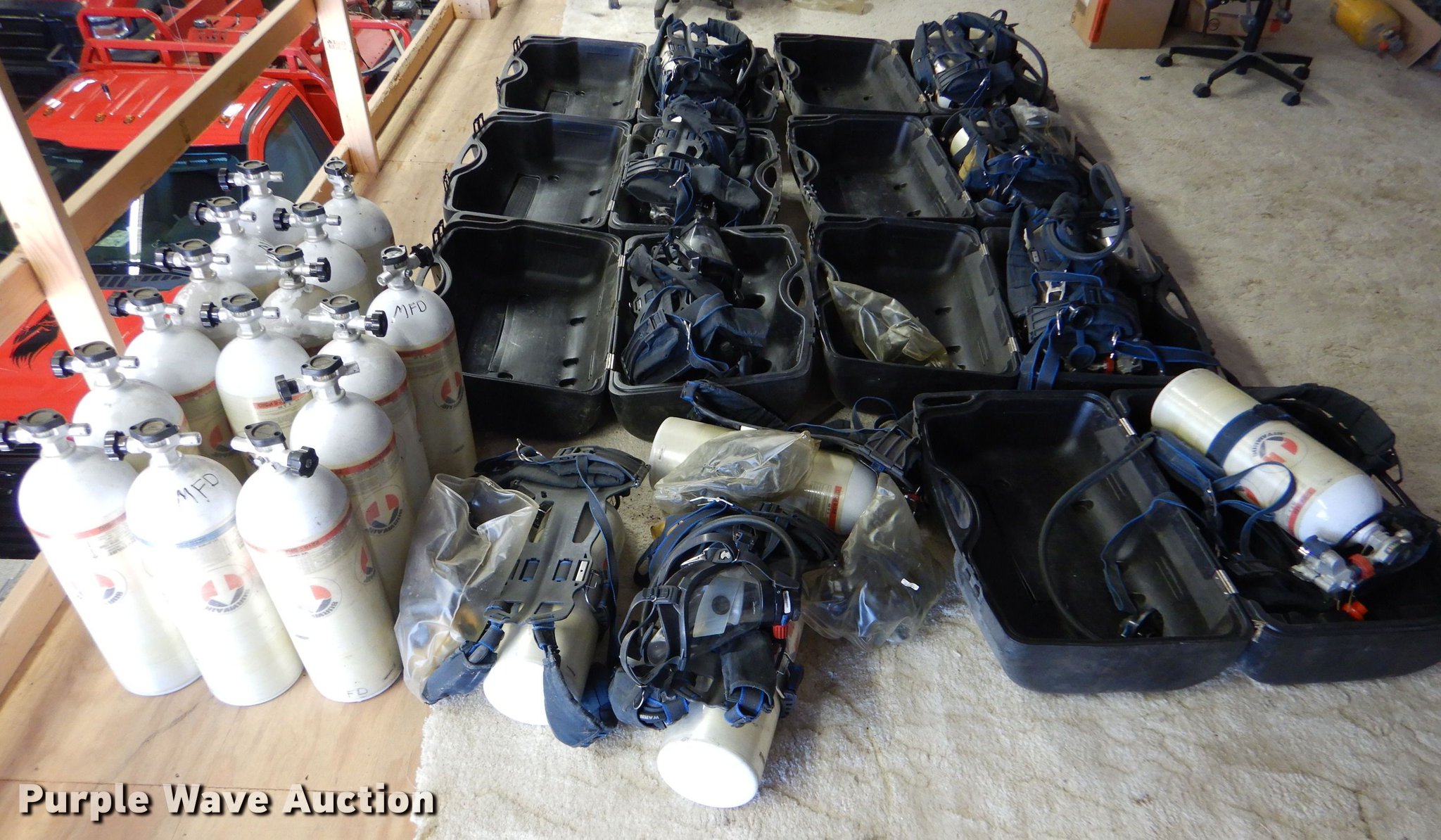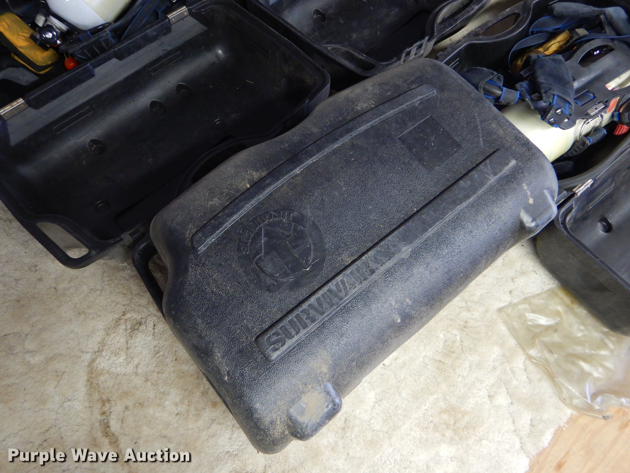 Purple Wave is selling a used Tools in Kansas. This item is a Fire fighting equipment with the following: (10) Survivair air packs, (24) Survivair air tanks, (7) Surviair plastic cases, Non-certifiable, out of certification
