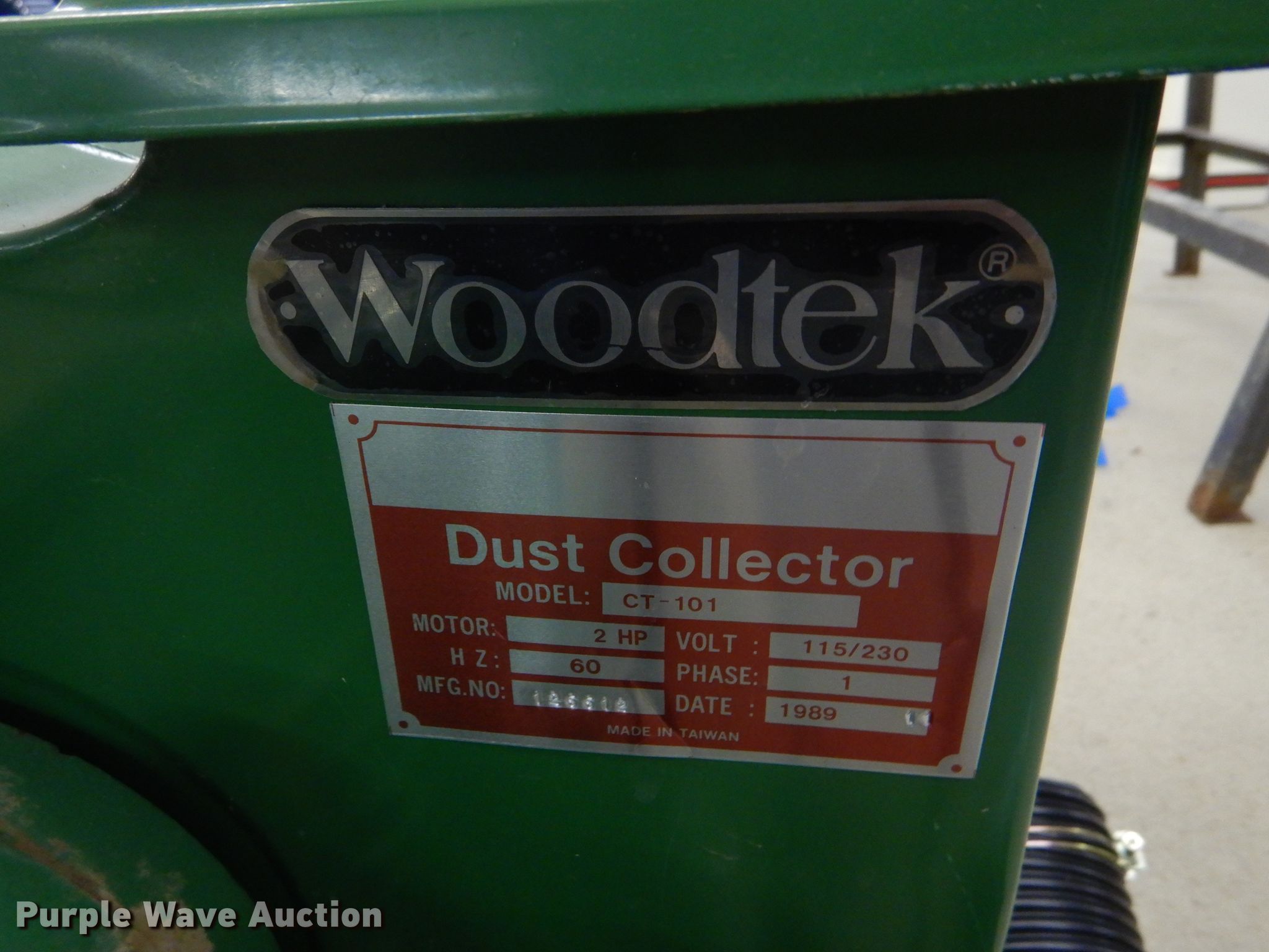Purple Wave is selling a used Tools in Kansas. This item is a Woodtek CT-101 dust collector with the following: 2 HP, 240V, Single phase, Serial 126612