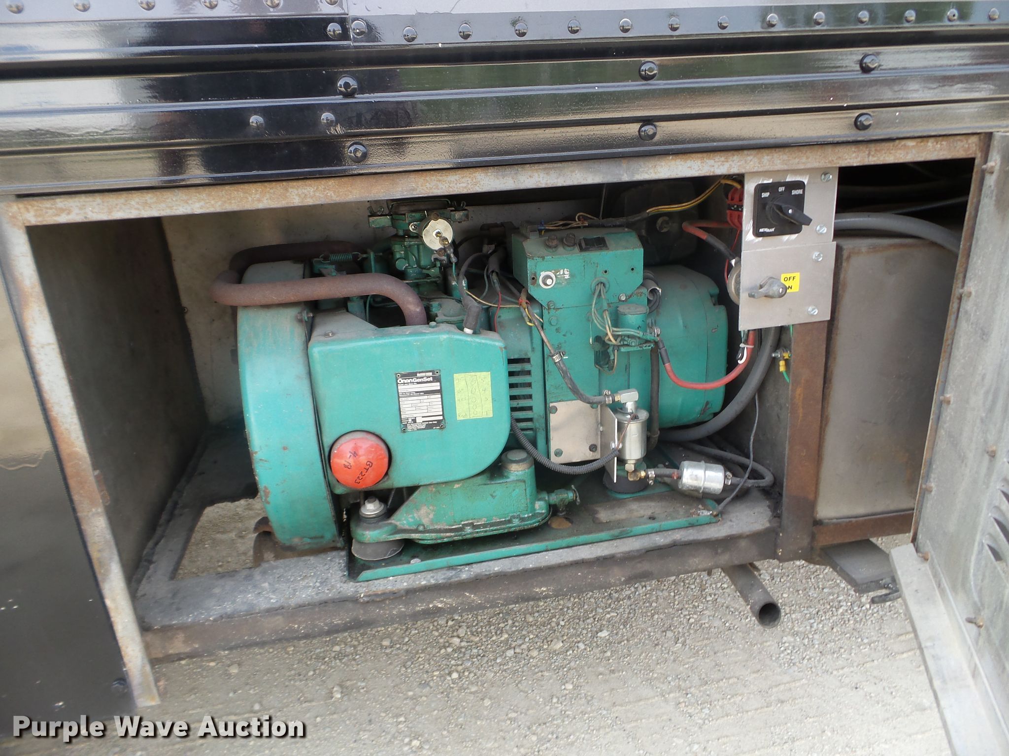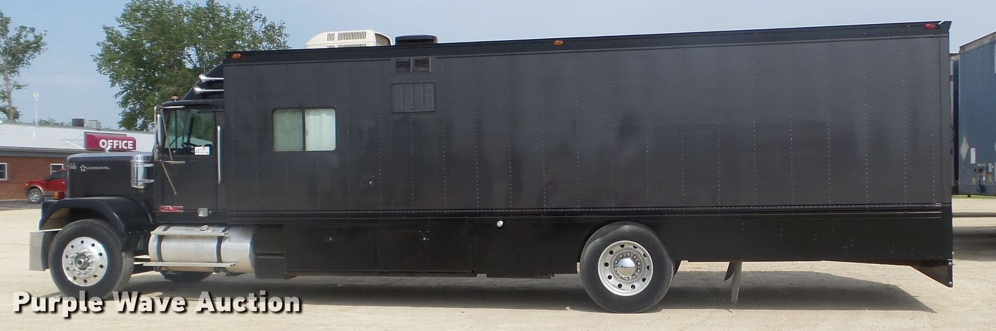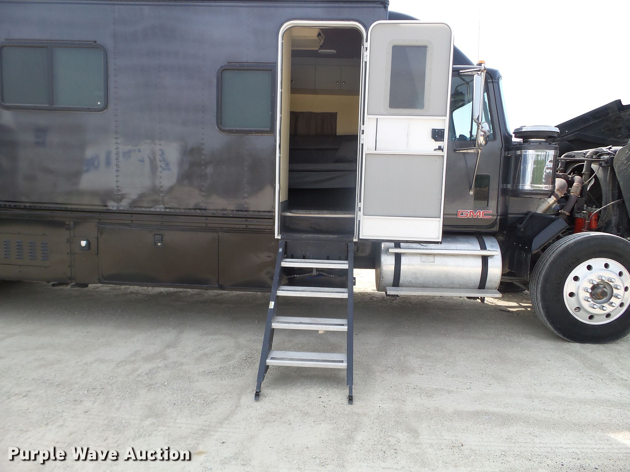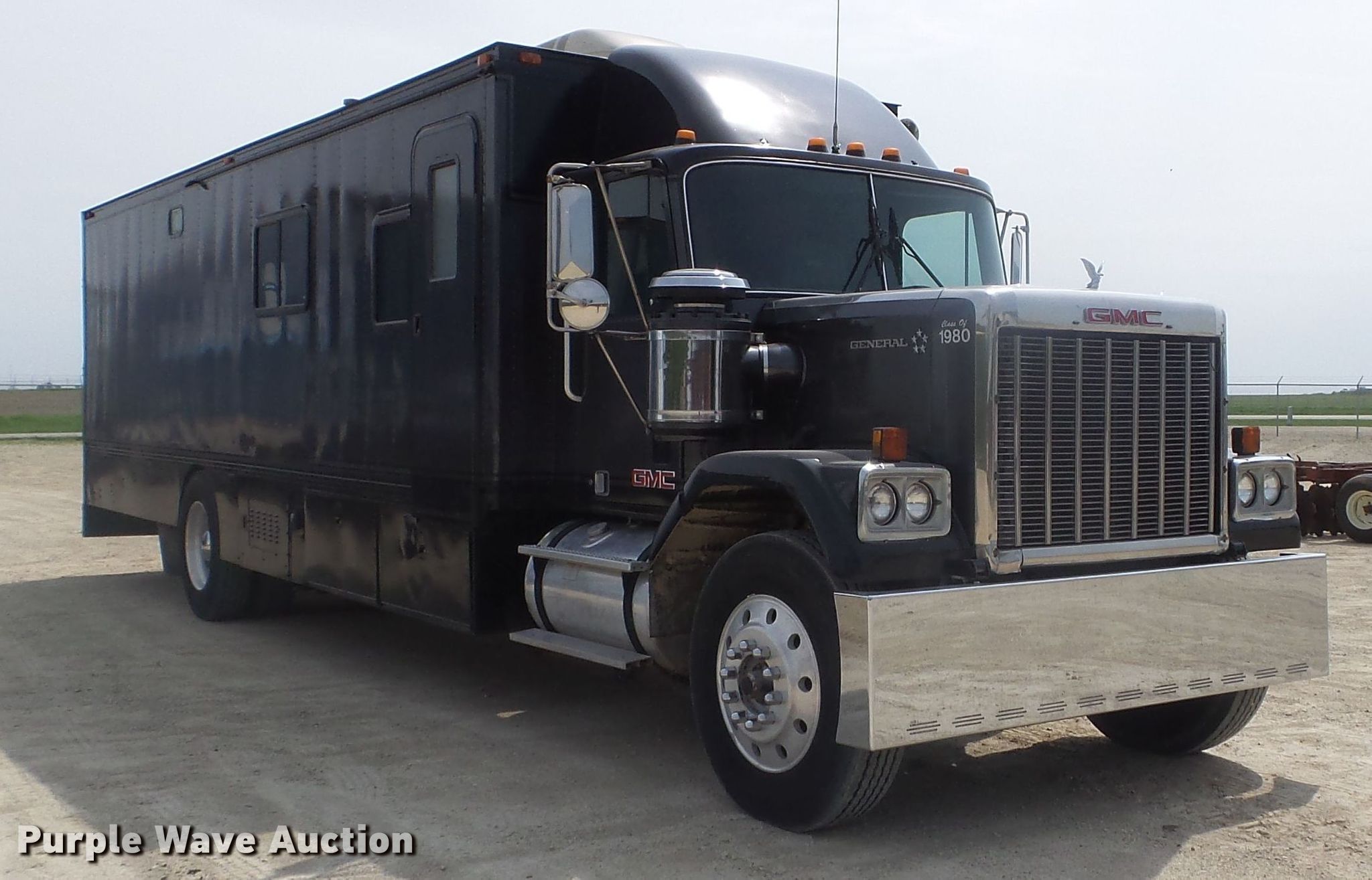 Purple Wave is selling a used RV in Minnesota. This item is a 1980 GMC General toy hauler RV with the following: 358,888 miles on odometer, 8,886 hours on meter, Detroit Diesel 6V92 six cylinder diesel engine, 13 speed manual transmission, Single axle, Cruise, Kitchen, Sink, Refrigerator, Microwave, Living room table, Bathroom, (3) twin beds, Televinsion, AC unit, Rear ramp door, Onan 408F-1R160004 generator, Gas engine, 11R24.5 tires, GVWR 48,460 lbs