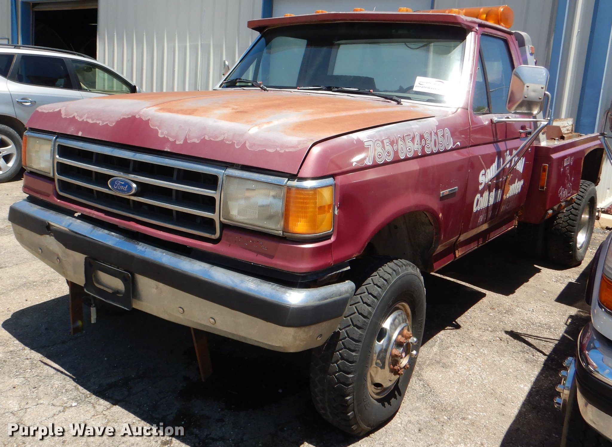 Purple Wave is selling a used 3/4 or 1 Ton Pickup or Van in Kansas. This item is a 1990 Ford F350 XLT Lariat tow truck with the following: 21,919 miles on odometer, 7.3L V8 OHV 16V diesel engine, Five speed manual transmission, Four wheel drive, Single axle, AC and heat, Cruise, Power locks, Light bar, PTO, Century wrecker bed, 92"L x 7'W, Winch, Underlift, Tow bar, Spring suspension, Hydraulic brakes, Kelly 235/85R16 tires, GVWR 11,000 lbs, Dead battery, Unit must be pulled to start, Unknown operating condition