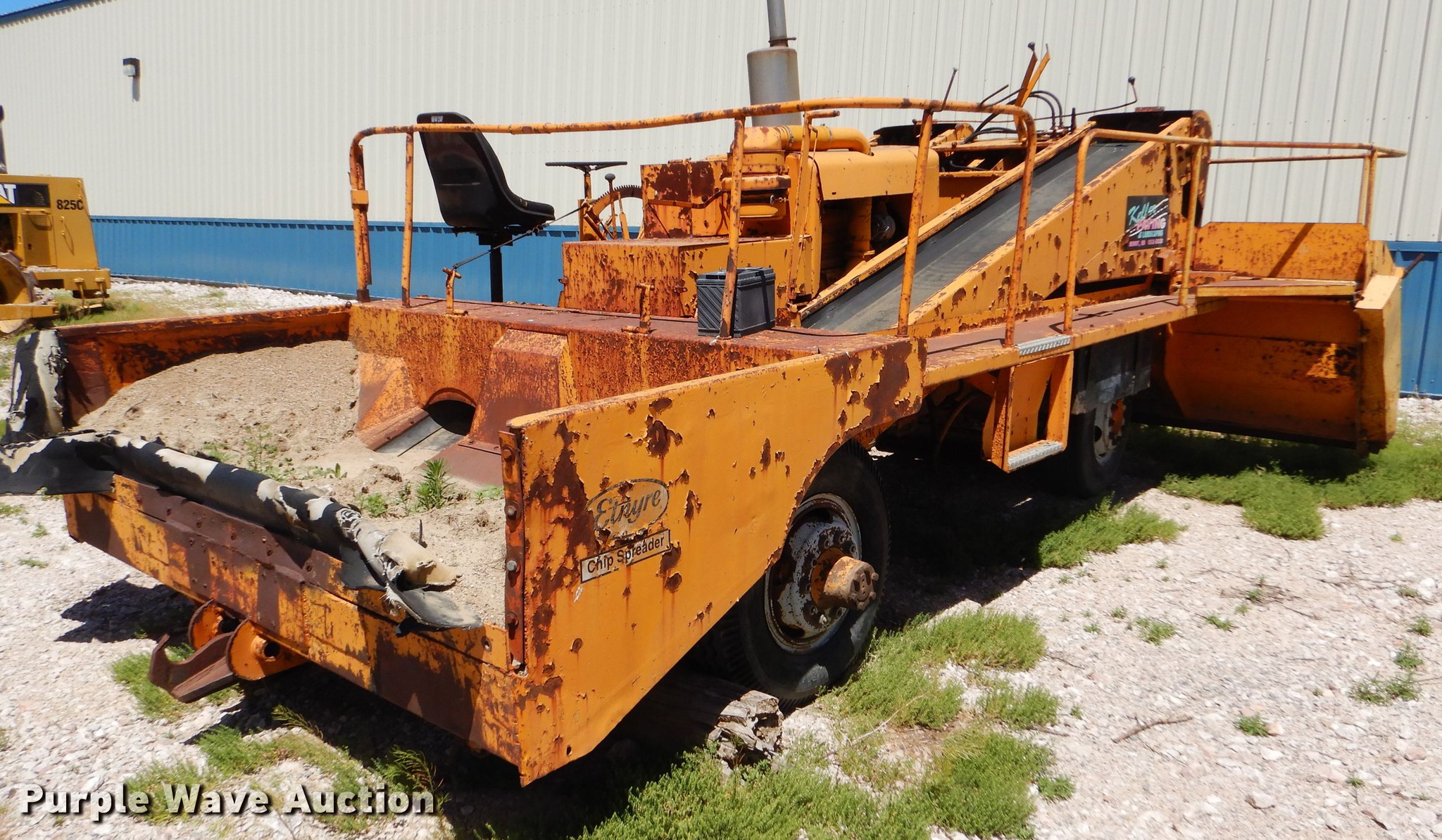 Etnyre 720 chip spreader. Detroit Diesel four cylinder diesel engine, Four speed manual transmission, 9.5' hopper, 18'L x 20"W conveyor, 14' spreader, Unknown operating condition , Serial K3651. RJA Dozer Service. 12946 113 Rd. Minneola, KS 67865
