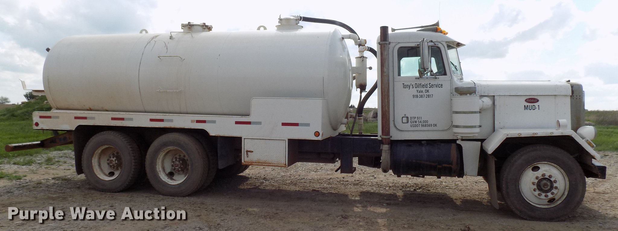 Purple Wave is selling a used Vacuum Truck in Oklahoma. This item is a 1981 Peterbilt 378 vacuum truck with the following: 96,896 miles on odometer, Cummins six cylinder diesel engine, Eight speed manual transmission, Tandem axle, PTO, Steel tank, 100 barrel capacity, 4" rear outlet, Mastport pump, Spring suspension, Air brakes, 11R24.5 tires, GVWR 54,000 lbs