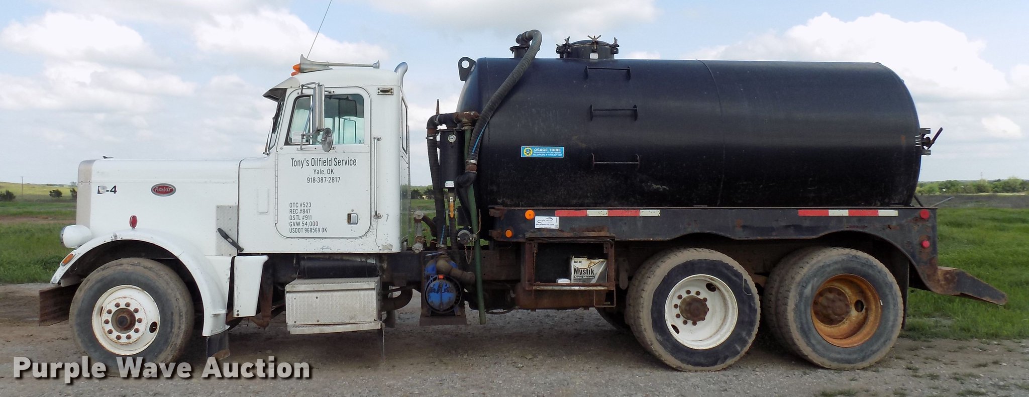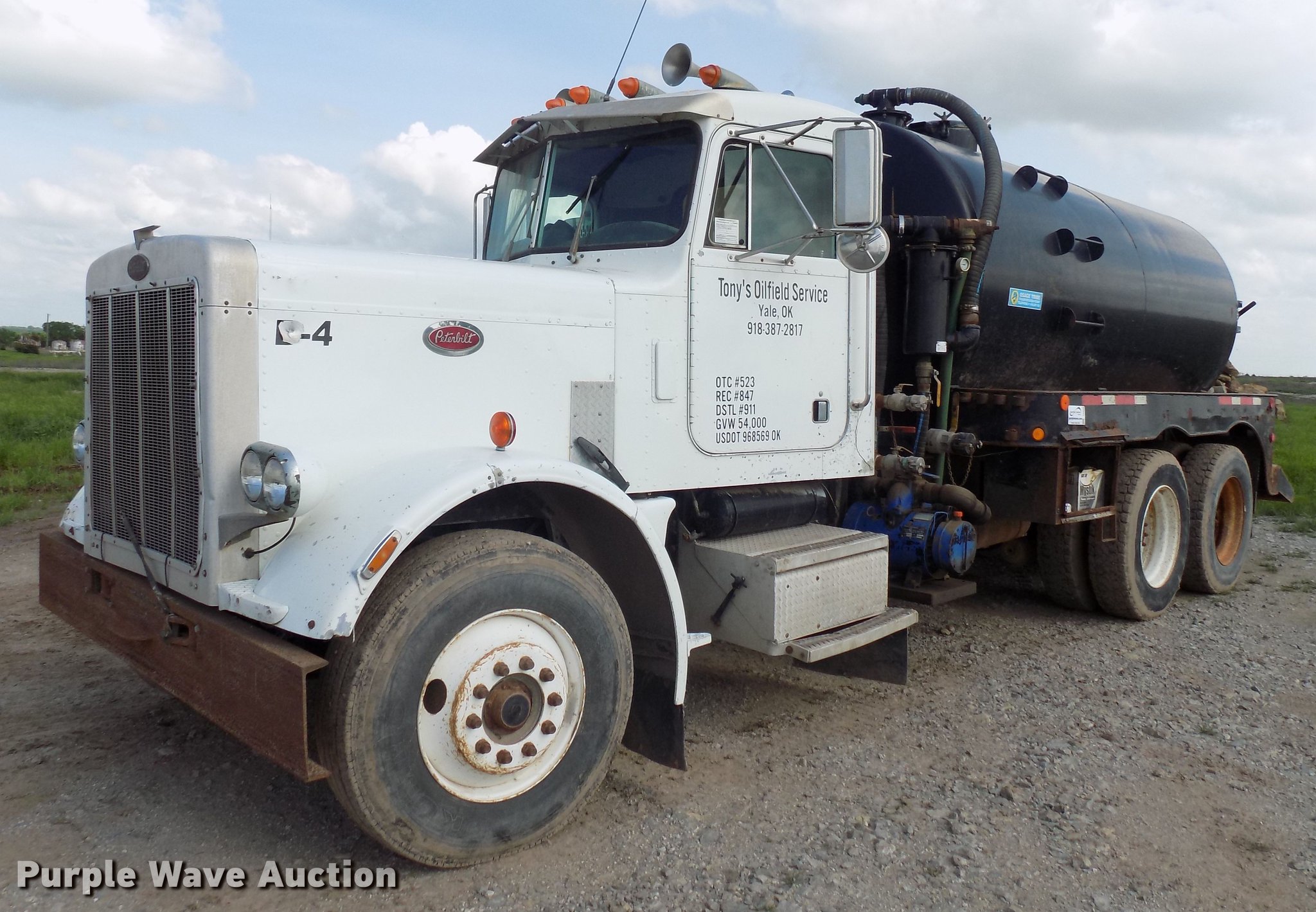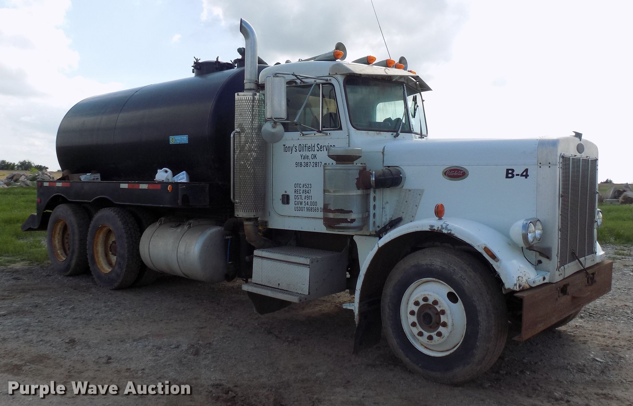 Purple Wave is selling a used Vacuum Truck in Oklahoma. This item is a 1985 Peterbilt 382 vacuum truck with the following: 232,480 miles on odometer, Cummins six cylinder diesel engine, Eight speed manual transmission, Tandem axle, PTO, Steel tank, 70 barrel capacity, 2" rear outlet, 2007 Fruitland RCF370 pump, Serial 871740LU, Spring suspension, Air brakes, 11R24.5 tires