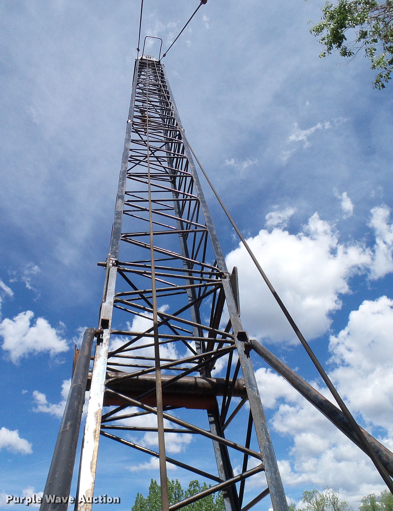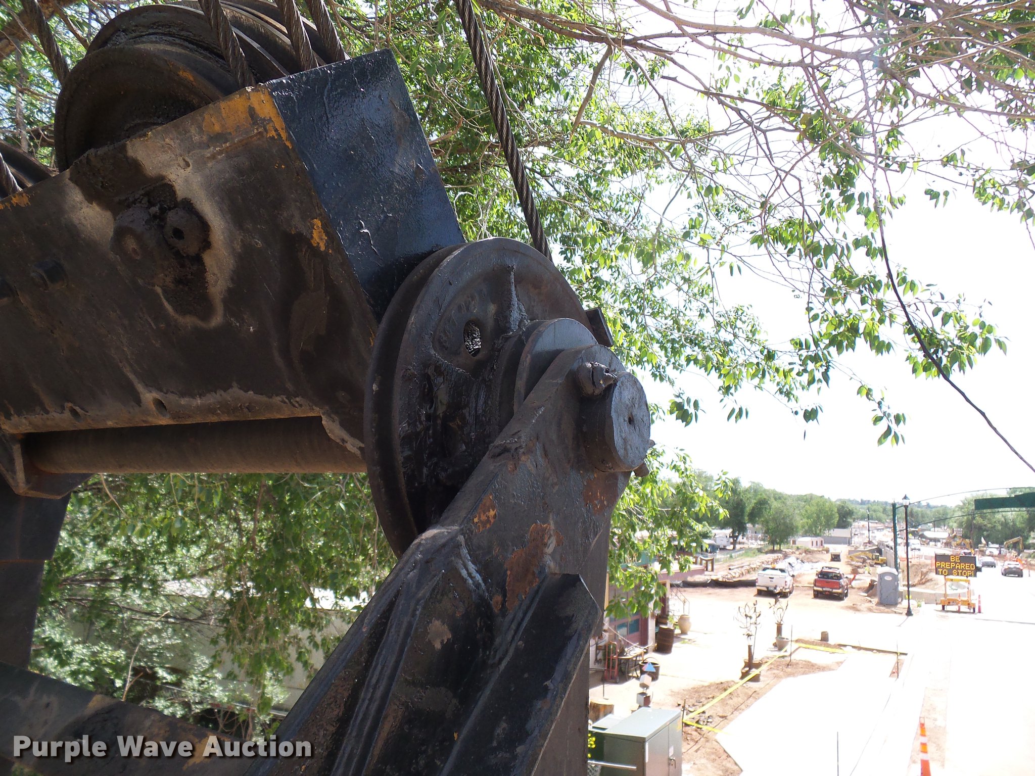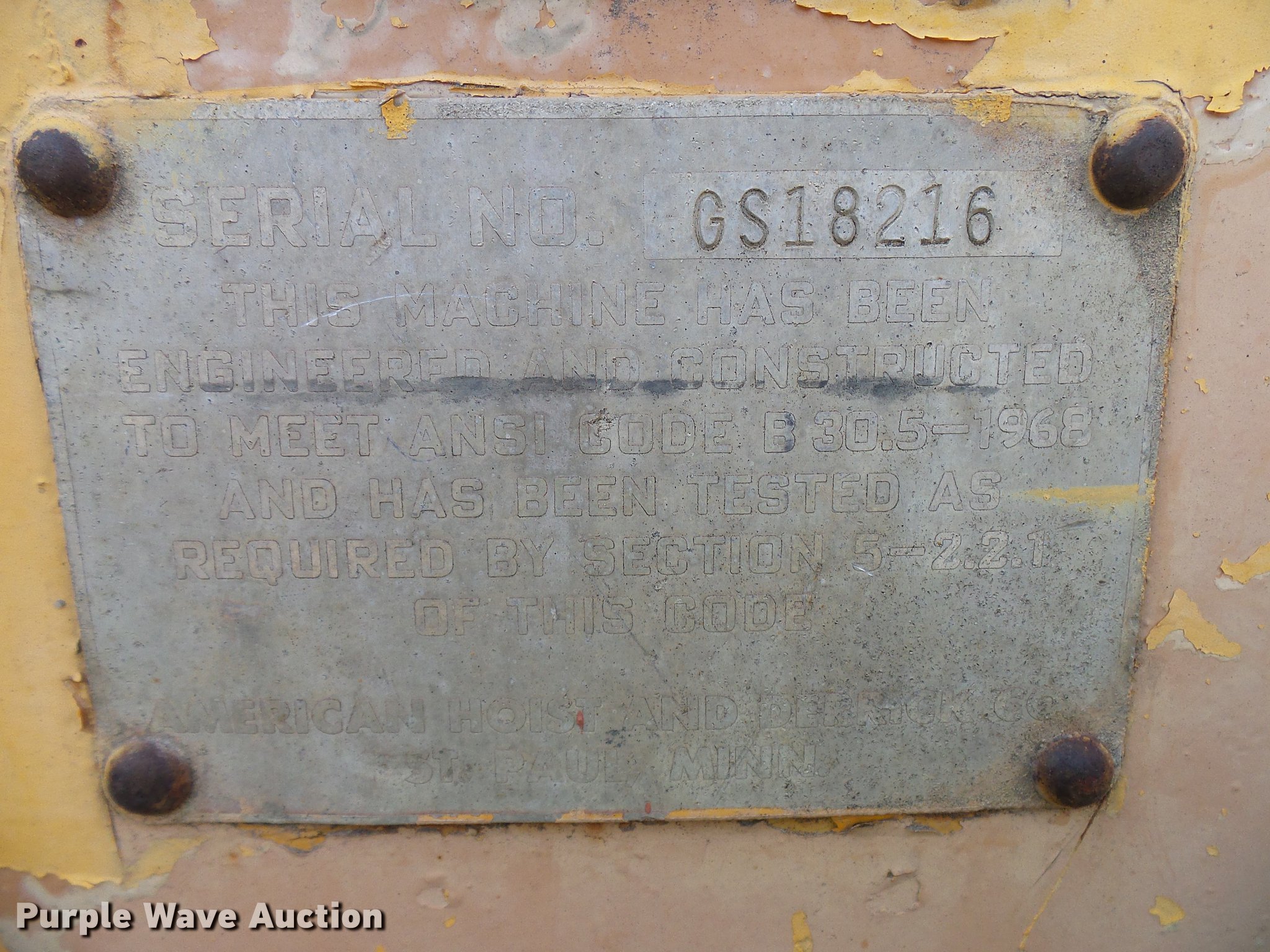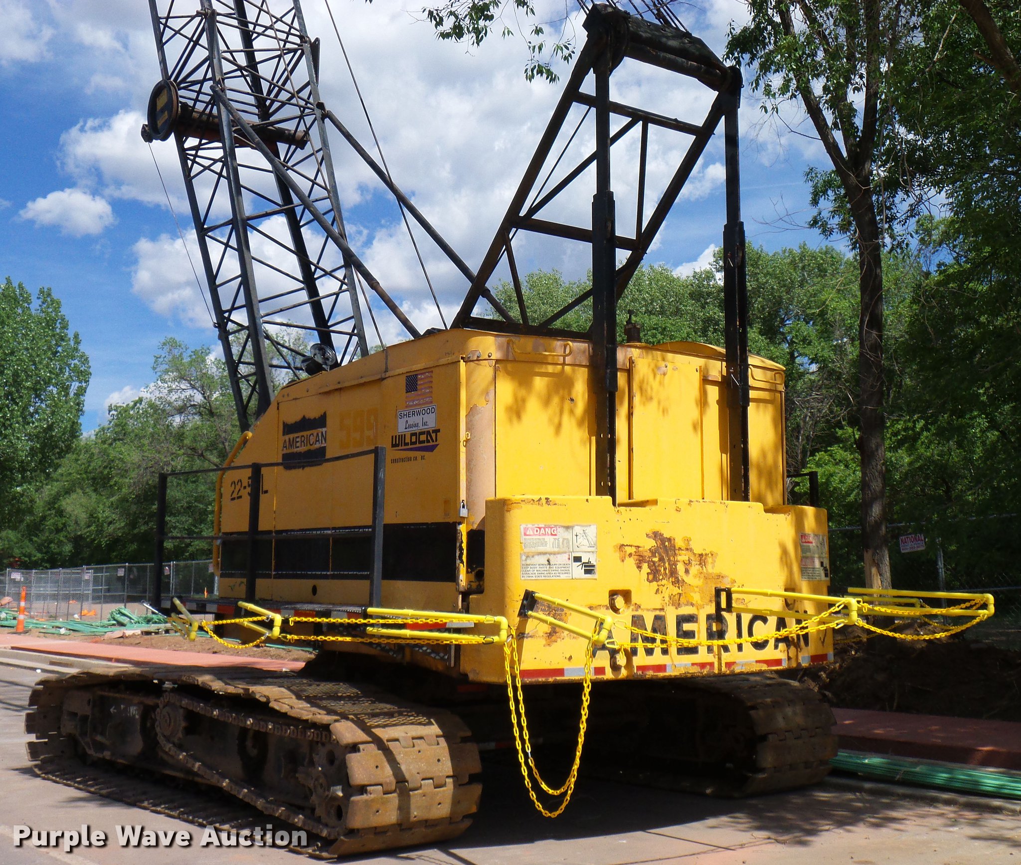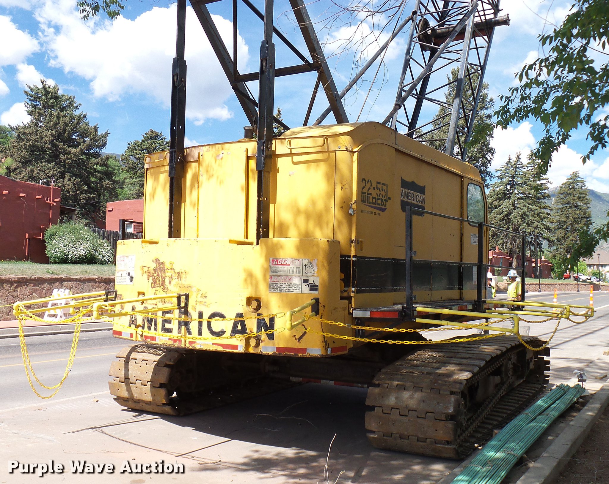 Purple Wave is selling a used Crawler Crane in Colorado. This item is a 1975 American 599-C crane with the following: Detroit Diesel four cylinder diesel engine, Mechanical propulsion, Air actuated control, Stick cane controls, Lattice tubular boom, Three boom sections, 100' overall length, 40 ton lift capacity, Crane block, Crane ball and hook, 36"W tracks, Extendable tracks, Certification valid through March 2020, Swing radius guard not included, Tracks will be slid in, gantry will be layed down, and catwalk will be removed for transport, Serial GS18216, Unit# 22-55L