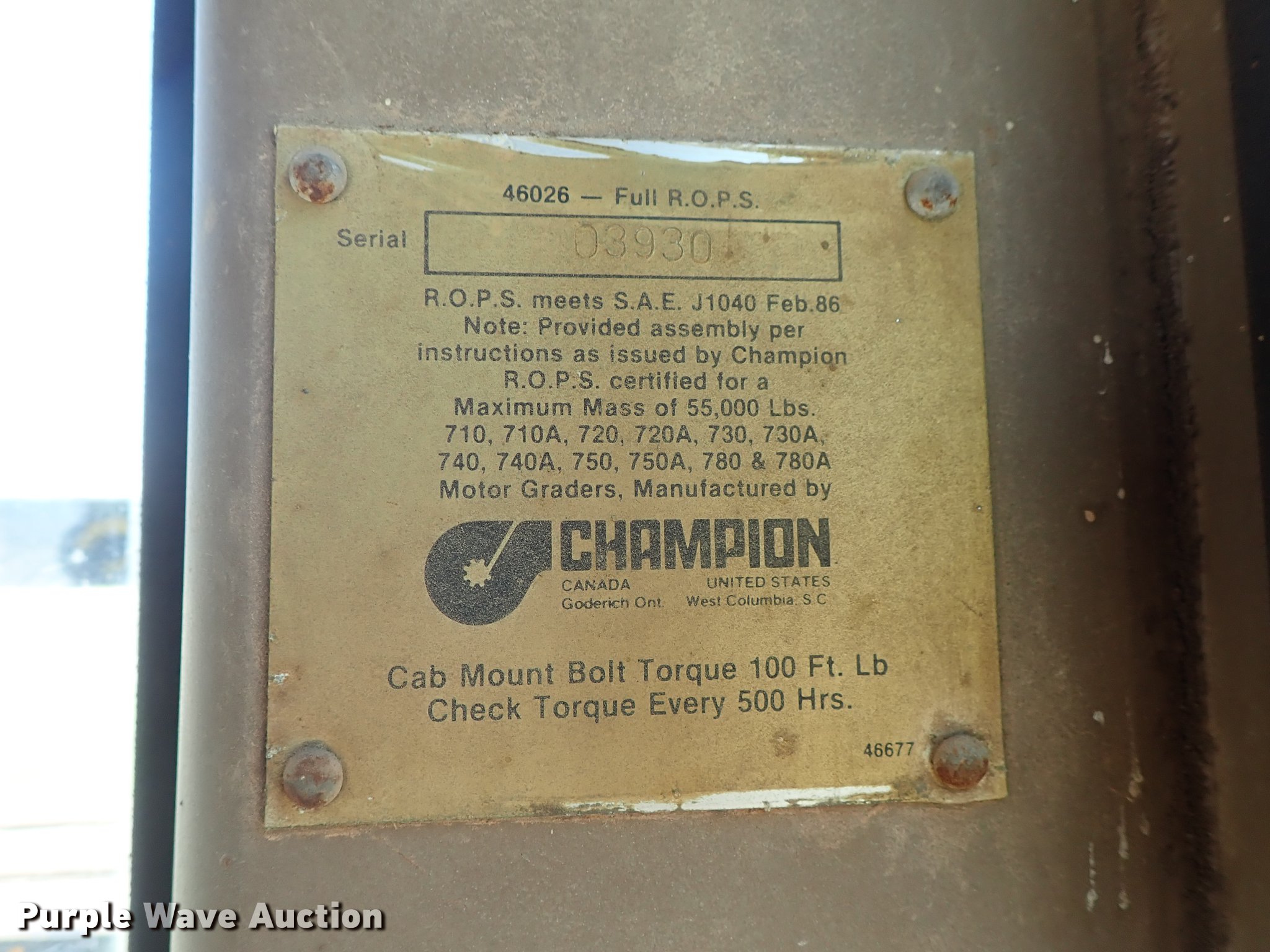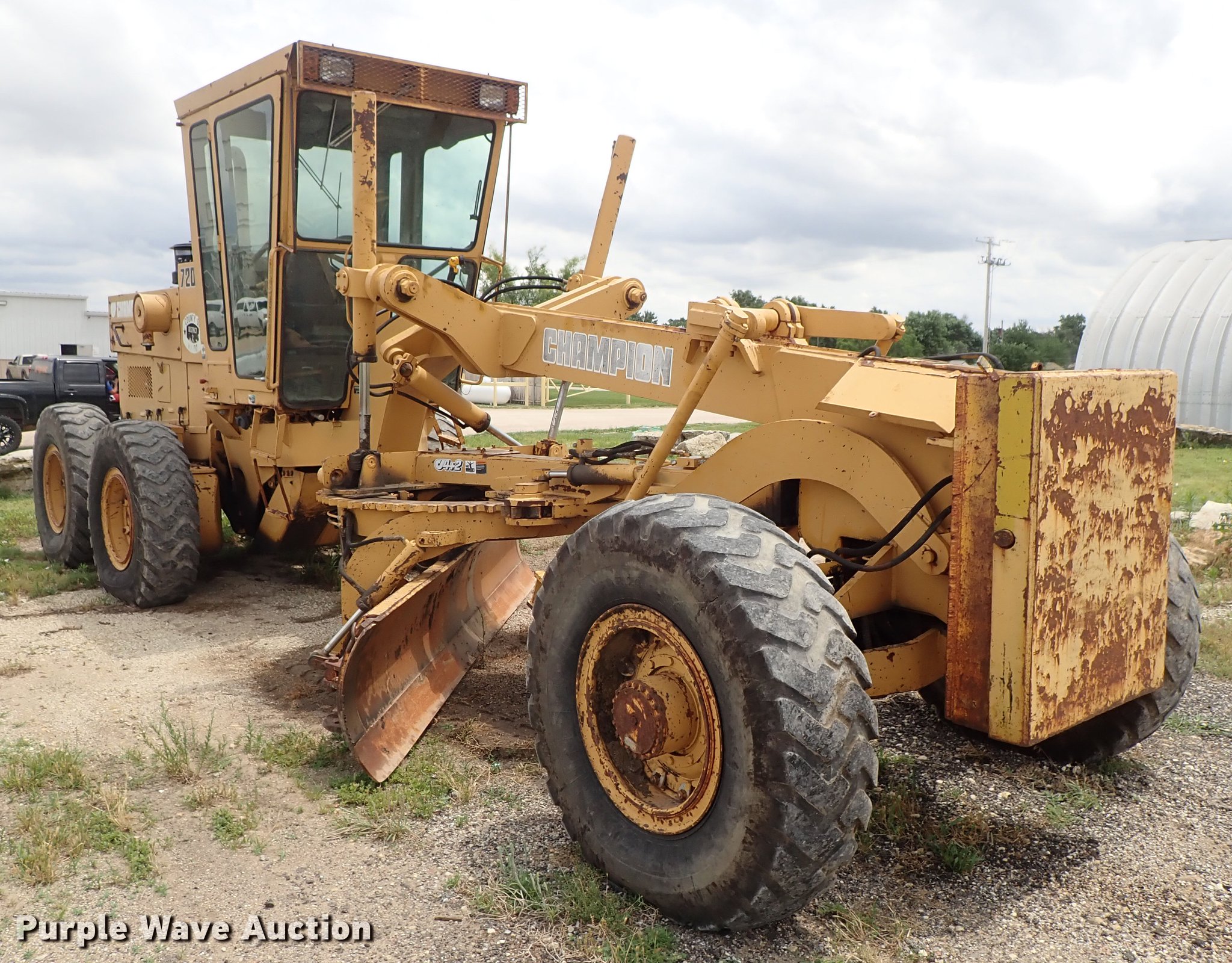 Purple Wave is selling a used Motor Grader in Kansas. This item is a Champion 720 motor grader with the following: 6,592 hours on meter, Cummins six cylinder diesel engine, Powershift transmission, All wheel drive, EROPS, AC and heat, 14'W moldboard, Tip control, Side shift, Mid mounted scarifier, (5) teeth, 14.00R24 tires, Clutch master cylinder needs replaced
