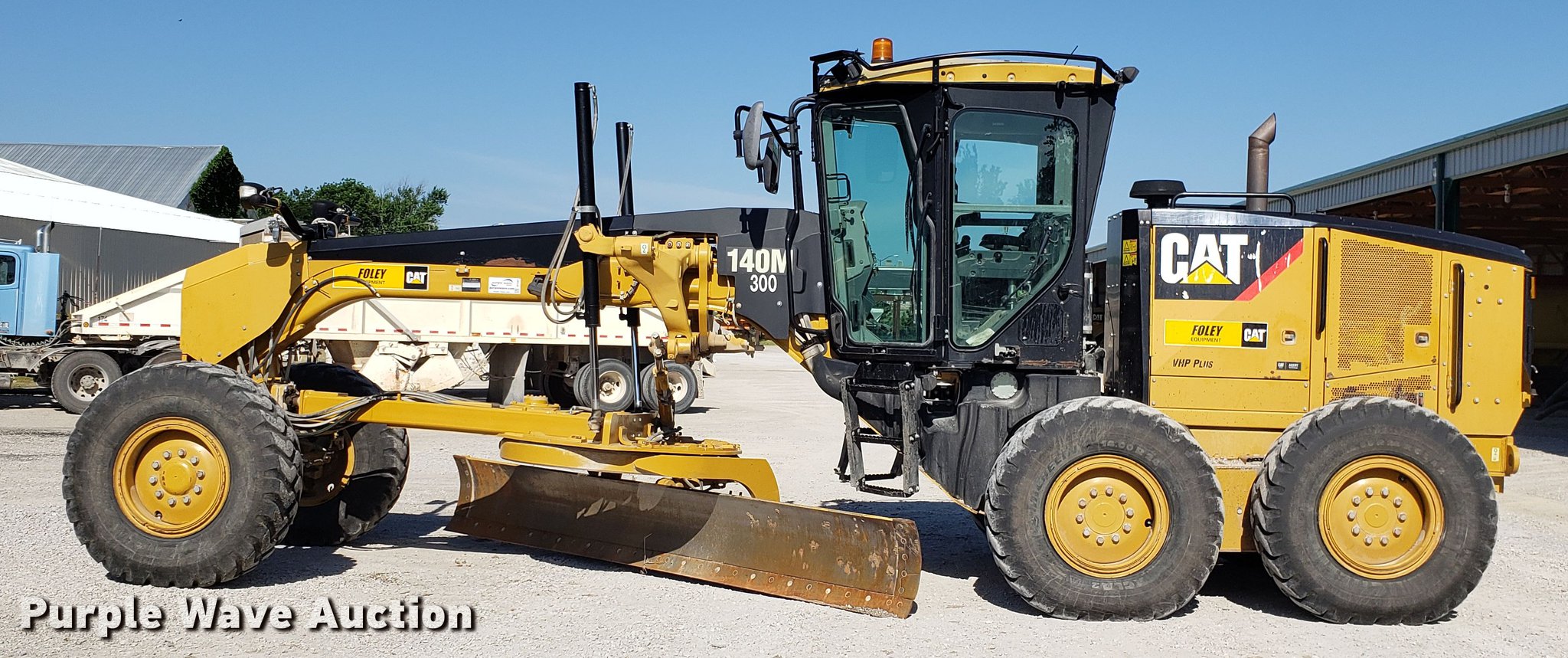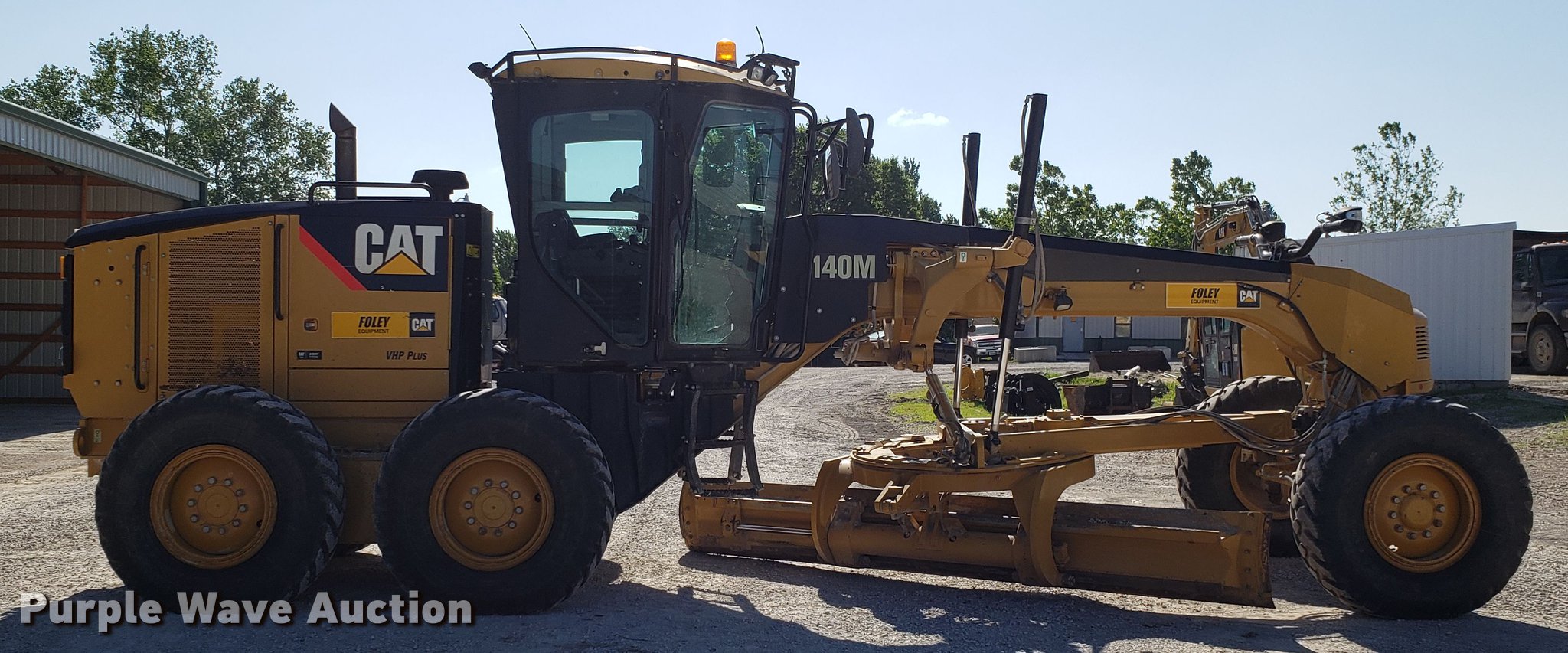Purple Wave is selling a used Motor Grader in Missouri. This item is a 2009 Caterpillar 140M VHP Plus motor grader with the following: 8,487 hours on meter, Caterpillar C7 six cylinder diesel engine, Serial KHX15372, Powershift transmission, 8F-6R gears, Enclosed cab, AC and heat, AM/FM, 14'W moldboard, Tip control, Side shift, 14R24 tires, Serial CAT0140MVB9D01879