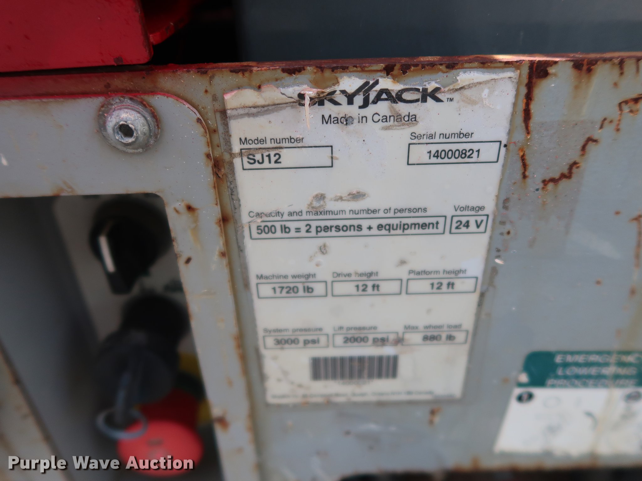 Purple Wave is selling a used Scissor or Vertical Lift in Oklahoma. This item is a 2014 Sky Jack SJ12 vertical lift with the following: 243 hours on meter, 24V electric operation, 500 lbs maximum lift capacity, 12' maximum lift height, 32"L x 30" platform, Platform extension, Platform and ground controls, AC power outlet, 2.5 mph travel speed, Safety alarm, Solid non-marking tires, Serial 14000821
