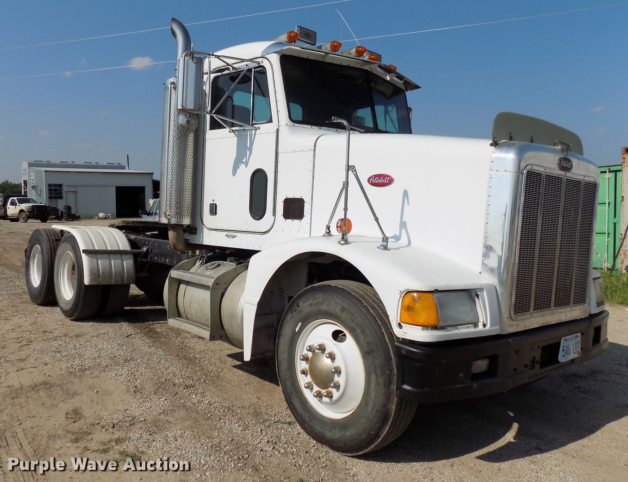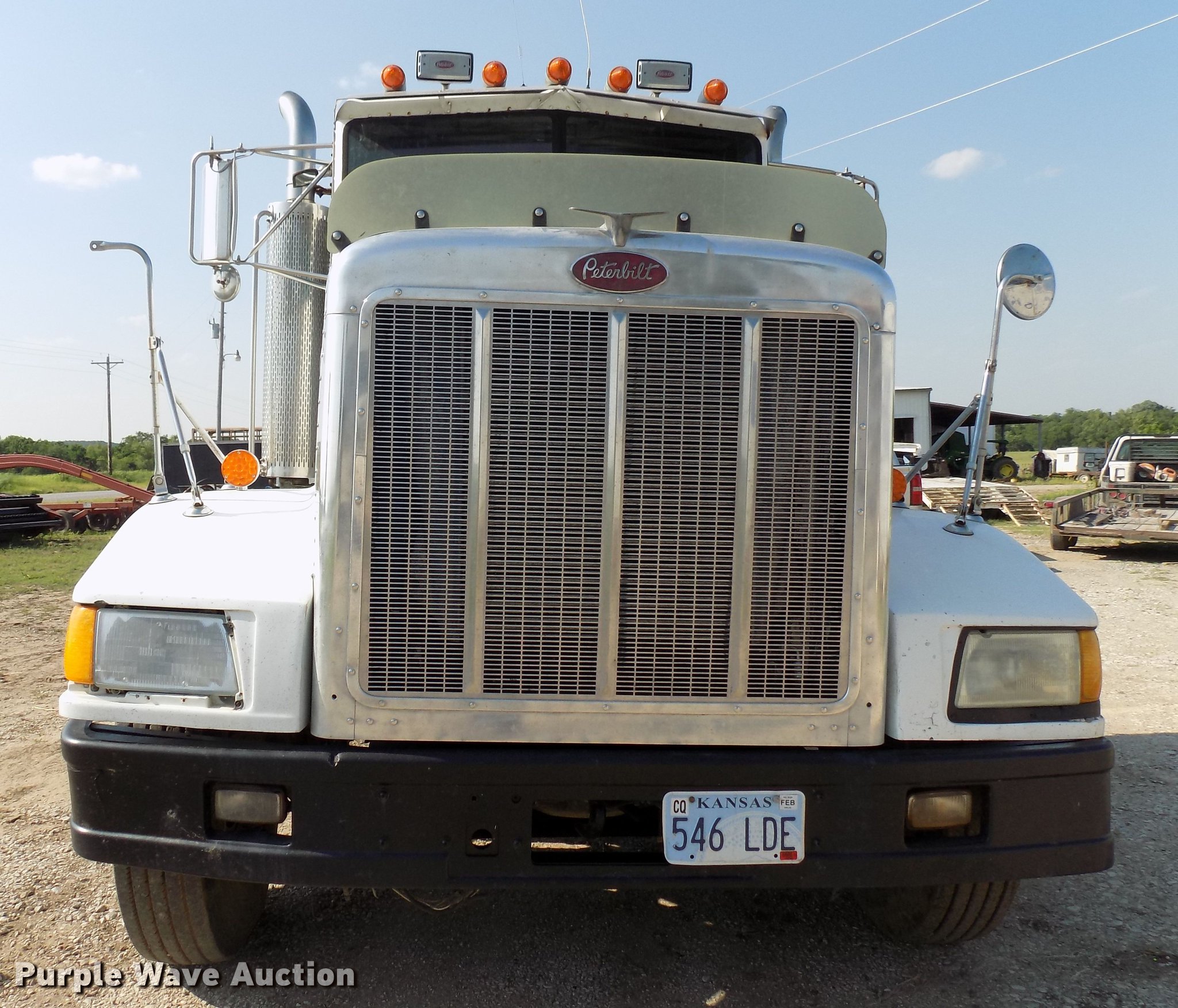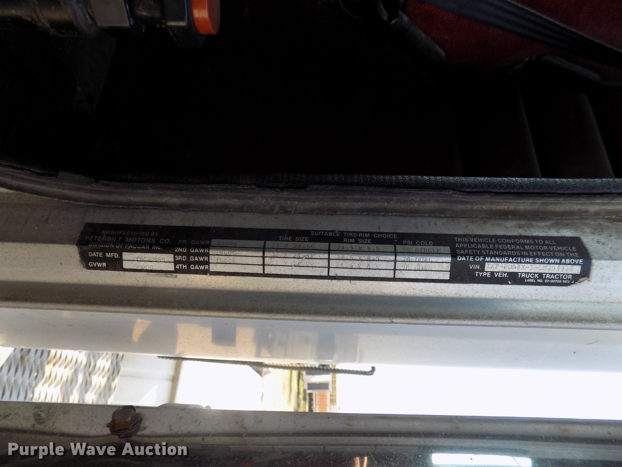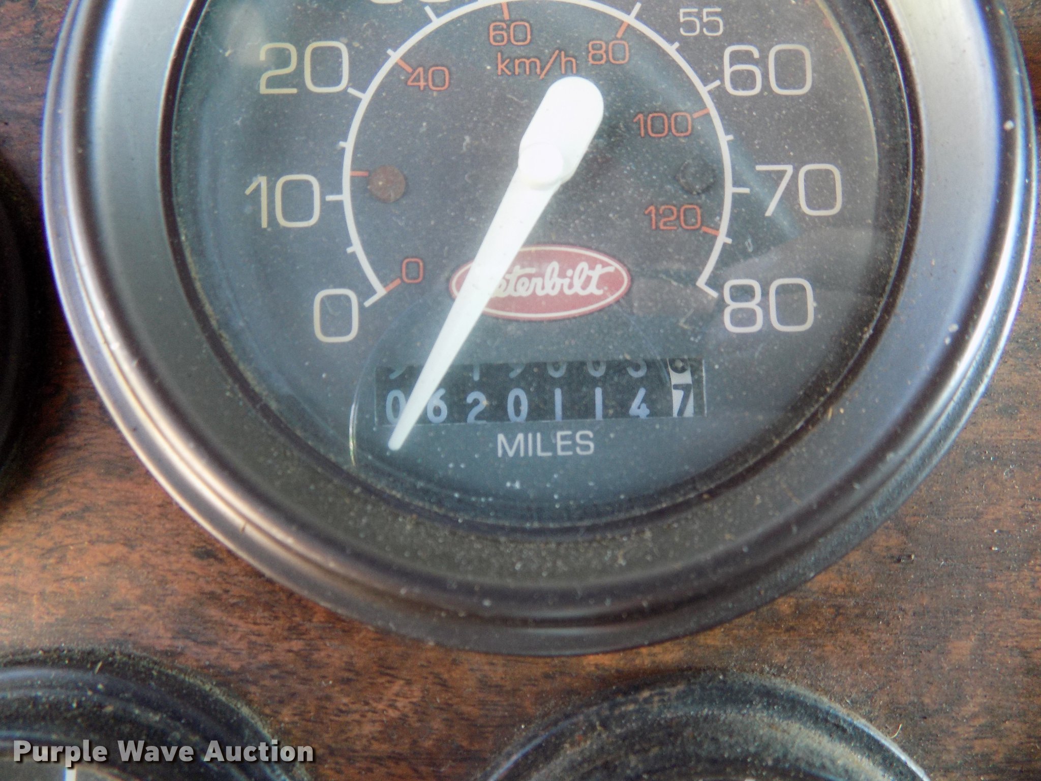 Purple Wave is selling a used Truck Tractor in Kansas. This item is a 1990 Peterbilt semi truck with the following: 620,114 miles on odometer, Caterpillar six cylinder diesel engine, Nine speed manual transmission, Tandem axle, Full differential lock, AC and heat, PTO, Fixed fifth wheel plate, Dual fuel tanks, Spring suspension, Air brakes, 11R22.5 front tires, 315/80R22.5 rear tires, GVWR 50,000 lbs