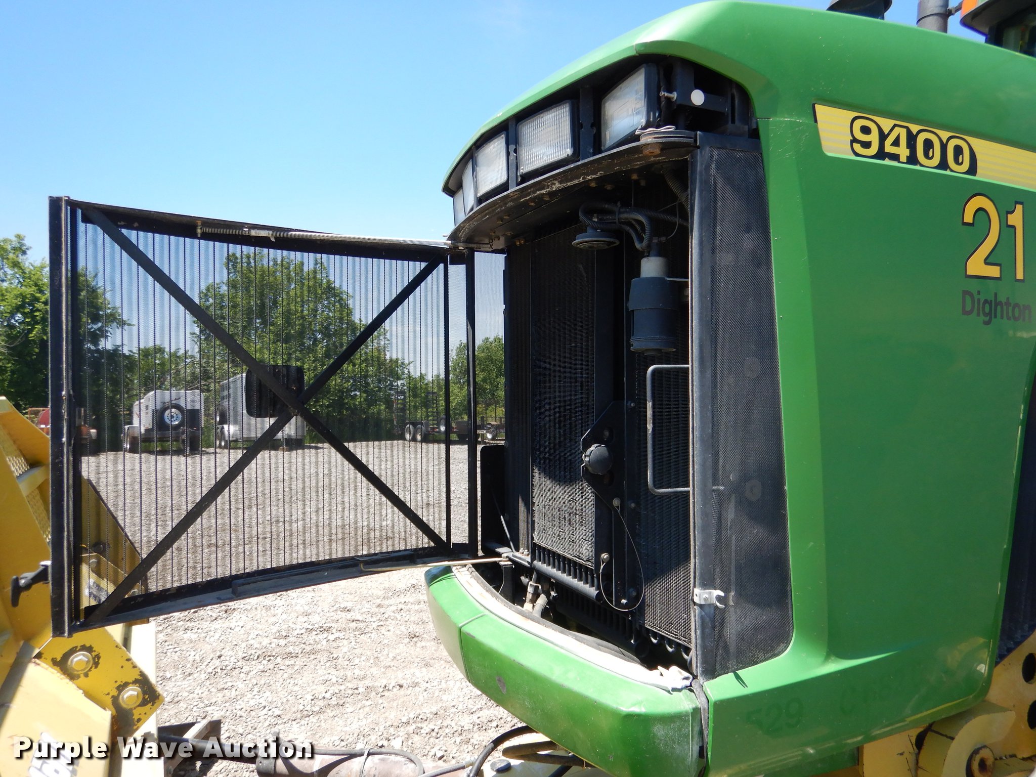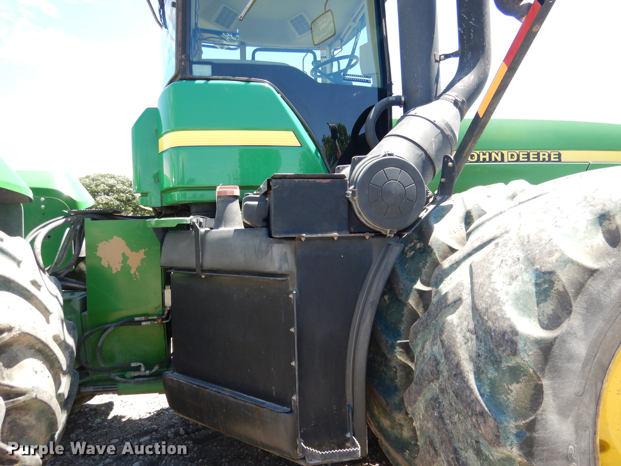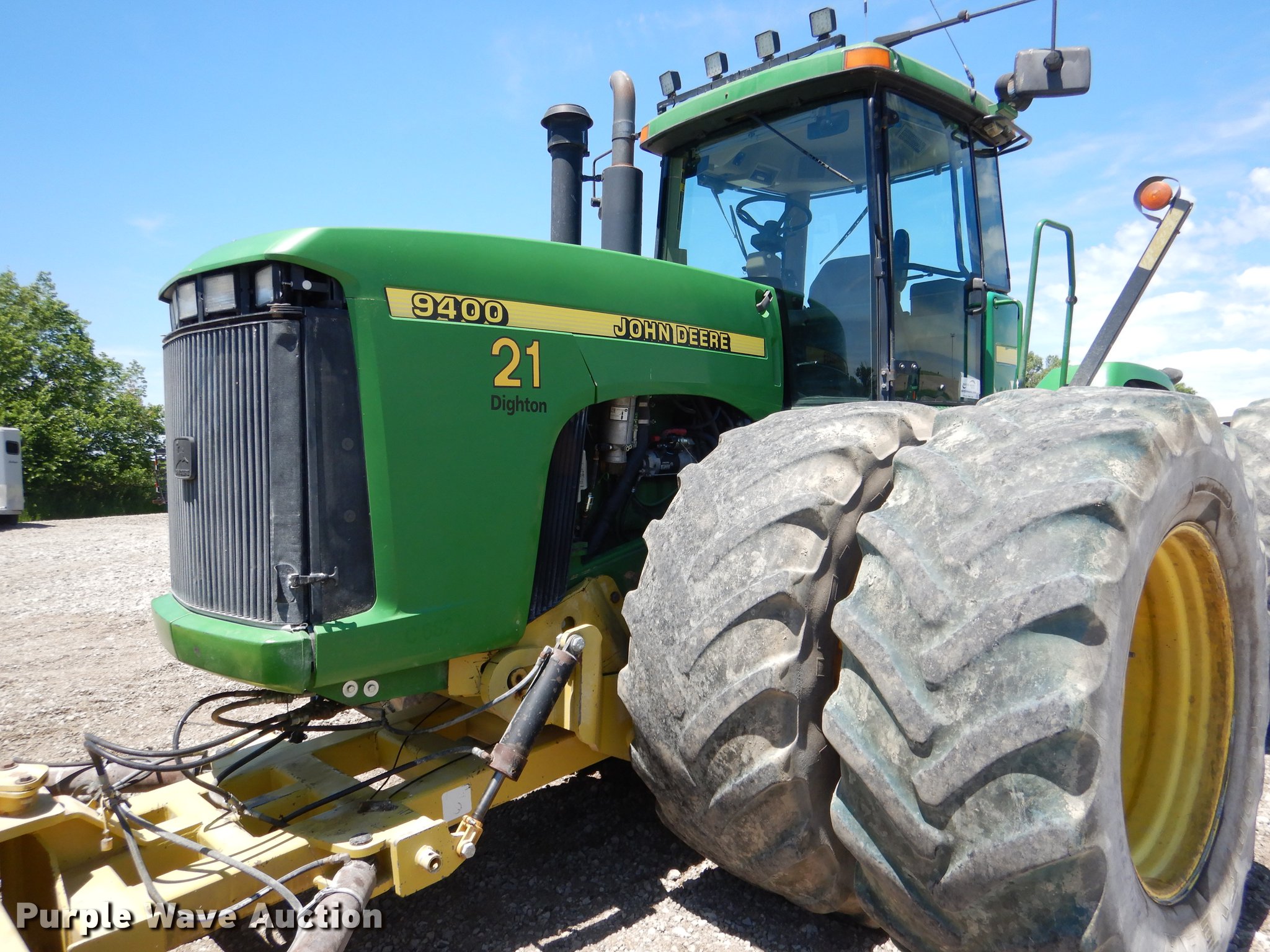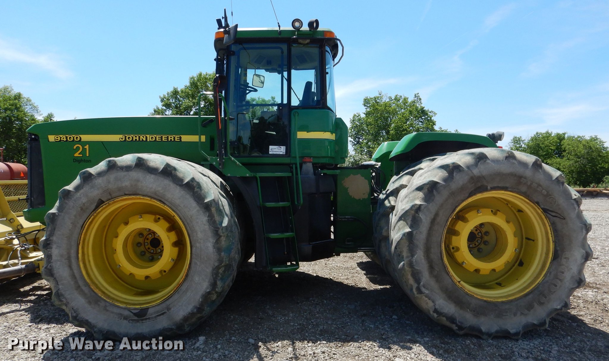 Purple Wave is selling a used Articulated 4-Wheel Drive Tractor in Nebraska. This item is a 2001 John Deere 9400 4WD tractor with the following: 10,834 hours on meter, John Deere 12.5L eight cylinder diesel engine, Powershift transmission, 12F-2R gears, Differential lock, AC and heat, AM/FM, Reversing fan, (5) rear hydraulic remote sets, (8) wheel weights, 134" wheelbase, 710/70R42 dual tires, Blade selling separately as DG5810, Serial RW9400P041723, Unit# 21