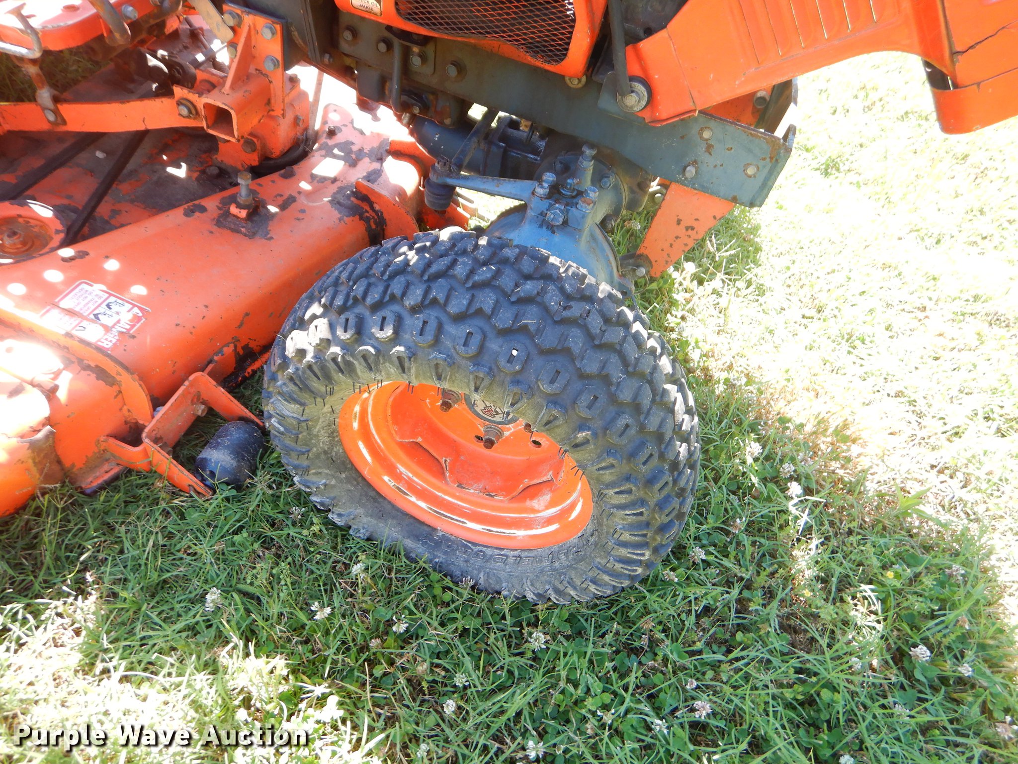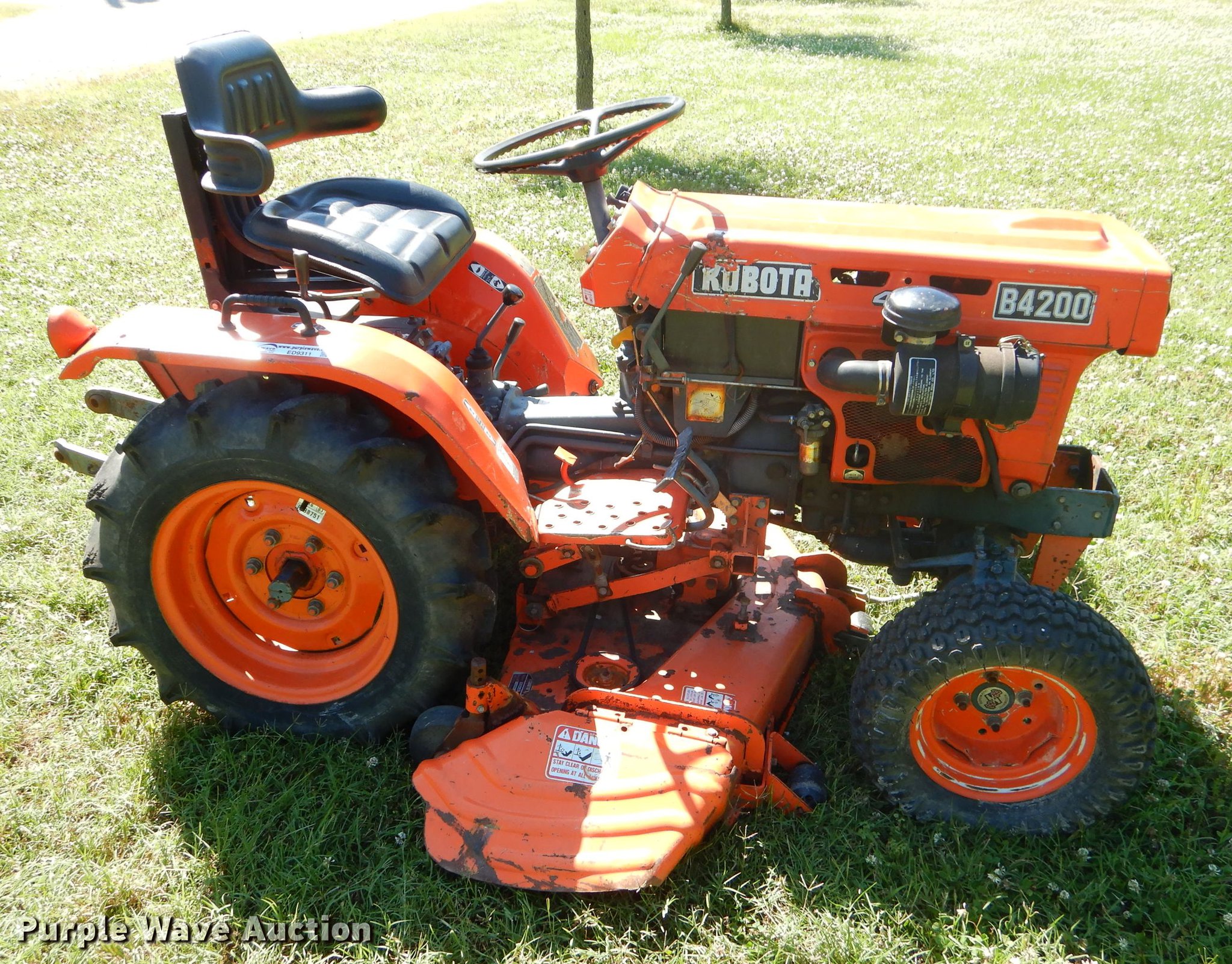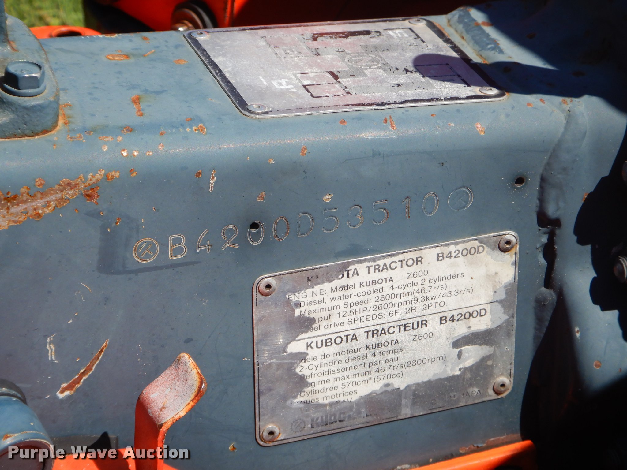 Purple Wave is selling a used Tractor in Kansas. This item is a 1998 Kubota B4200 MFWD tractor with the following: 2,056 hours on meter, Kubota V2203 two cylinder diesel engine, Manual transmission, 6F-2R gears, Three point, 540 PTO, 44"W mower deck, Model RC44-42, 18x8.50-10 front tires, 7-16L rear tires, Serial B4200D535100