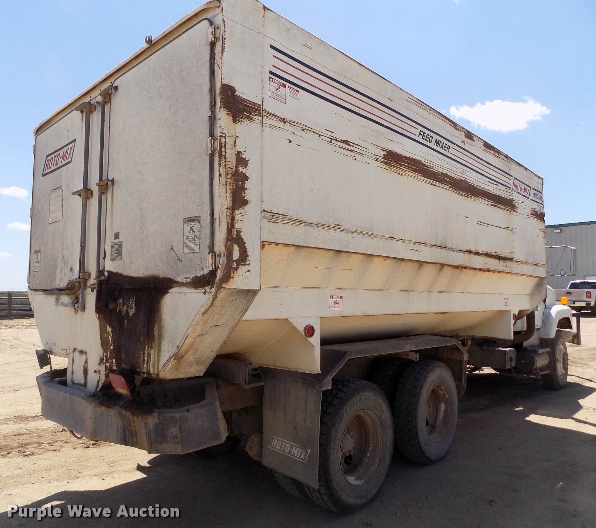 Purple Wave is selling a used Feed Mixer Truck in Kansas. This item is a 2000 International 2654 feed mixer truck with the following: 124,373 miles on odometer, 30,240 hours on meter, International DT466 8.7L L6 diesel engine, Allison automatic transmission, Tandem axle, Power divider lock, Heat, Cruise, Heated mirrors, PTO, Roto-Mix 900-18 reel mixer bed, 18'L, In-cab controls, DigiStar scales, (2) augers, Side discharge, Hydraulic chute, Hydraulic door, Double frame, Spring over walking beam suspension, Air brakes, 238" wheelbase, 11R22.5 tires, Cracked windshield, DigiStar scale controller not included