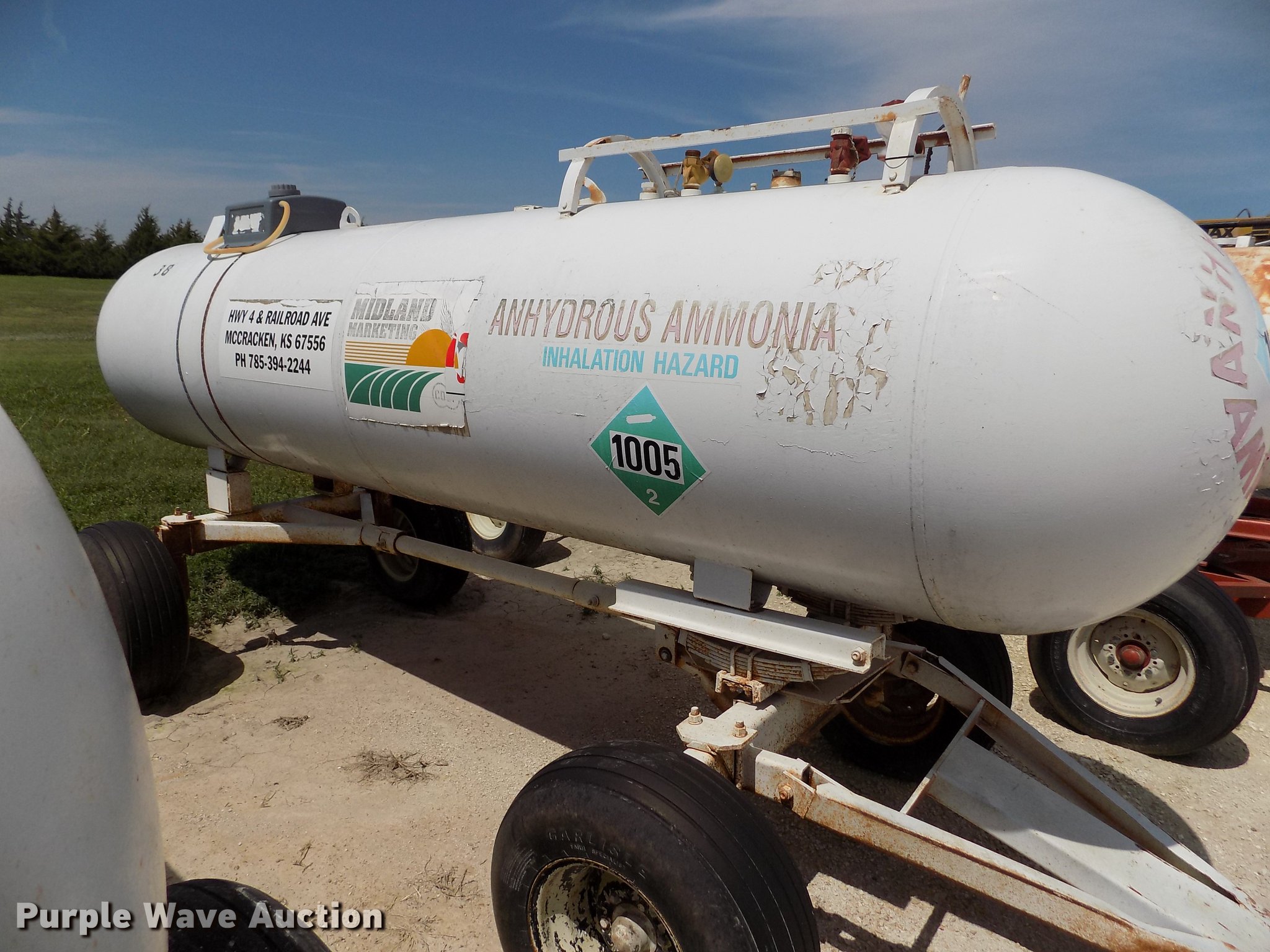 Anhydrous ammonia tank. 1,000 gallon capacity, Clevis hitch, Rear hitch, 11L-15 tires. Midland Marketing. 1505 Oak St. La Crosse, KS 67548