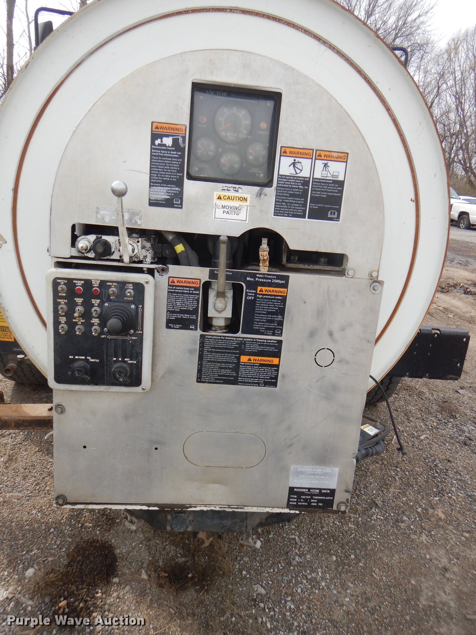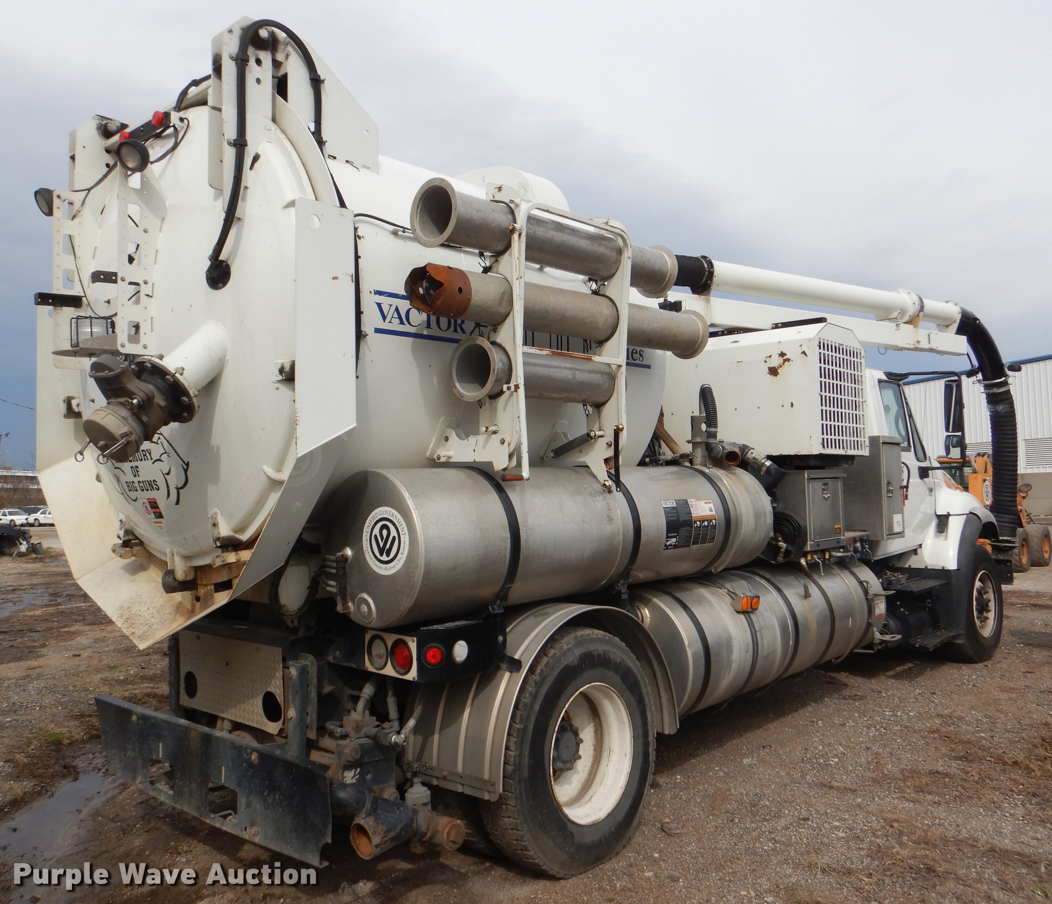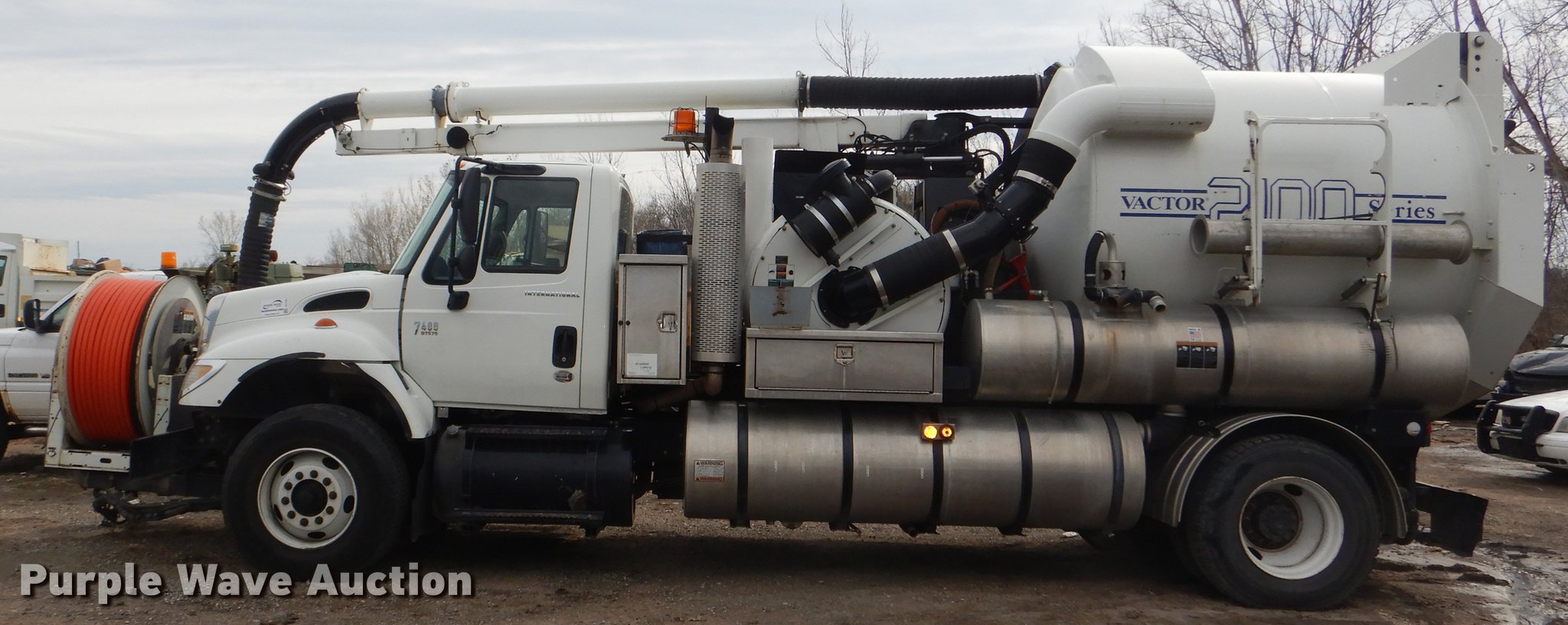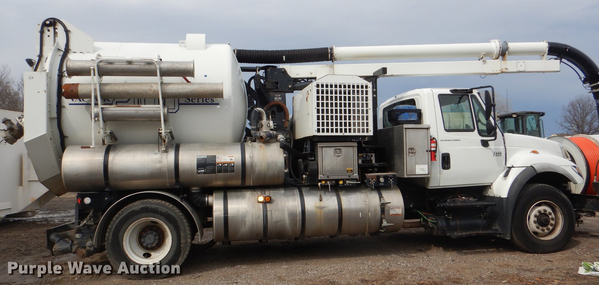 Purple Wave is selling a used Vacuum Truck in Kansas. This item is a 2007 International 7400 hydrovac truck with the following: 92,963 miles on odometer, International DT570 9.3L L6 diesel engine, 285 HP, Allison automatic transmission, Single axle, AC and heat, Cruise, Heated mirrors, PTO, Vacotr 2110-J5 vacuum bed, John Deere 6.8L L6 diesel engine, Front hydraulic hose reel, 7" diameter telescopic boom, Spring suspension, Air brakes, 385/65R22.5 front tires, 11R22.5 rear tires, GVWR 41,000 lbs, Batteries dead