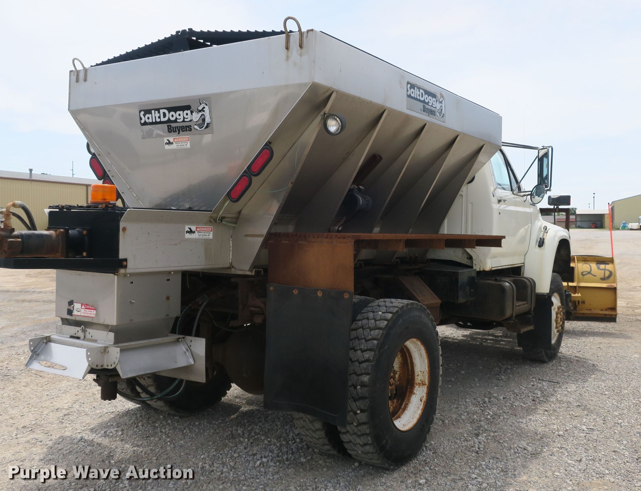 Purple Wave is selling a used Truck Chassis in Arkansas. This item is a 1998 Ford F800 spreader truck with the following: 50,047 miles on odometer, Cummins ISC 8.3L L6 diesel engine, 10 speed manual transmission, Single axle, AC and heat, Heated mirrors, Front mounted PTO, Flink PF-91S plow, 120"W, Buyer Salt Dogg spreader, Model 14XXXXXSSH series, 10.5'L, Spring suspension, Air brakes, 154" wheelbase, 11R22.5 tires, GVWR 37,600 lbs, Non-operational AC